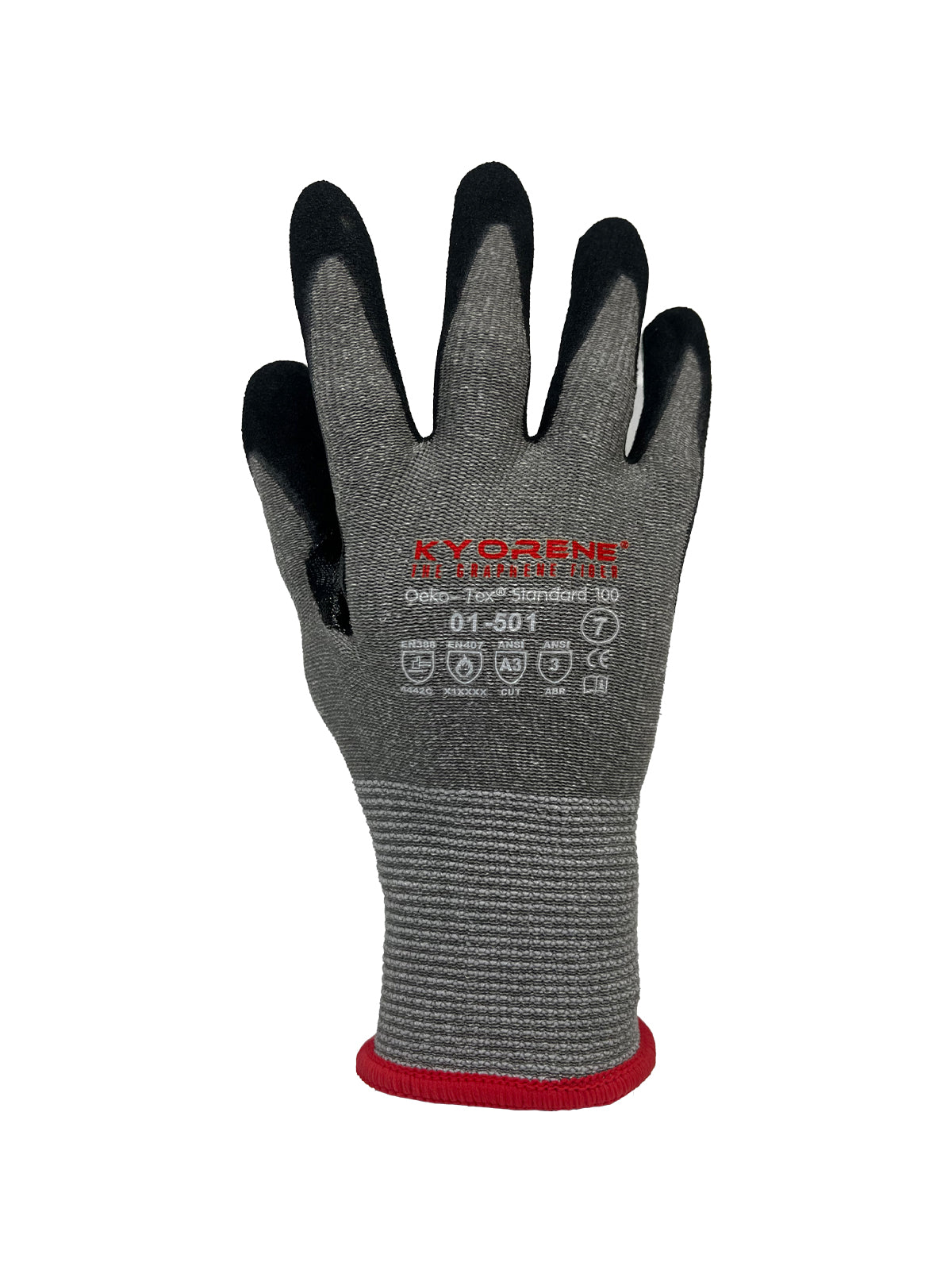 Guanto lavorato a maglia con rivestimento in nitrile sabbiato traspirante antiscivolo e fodera in Kyorene HPPE Elastan, calibro 13.