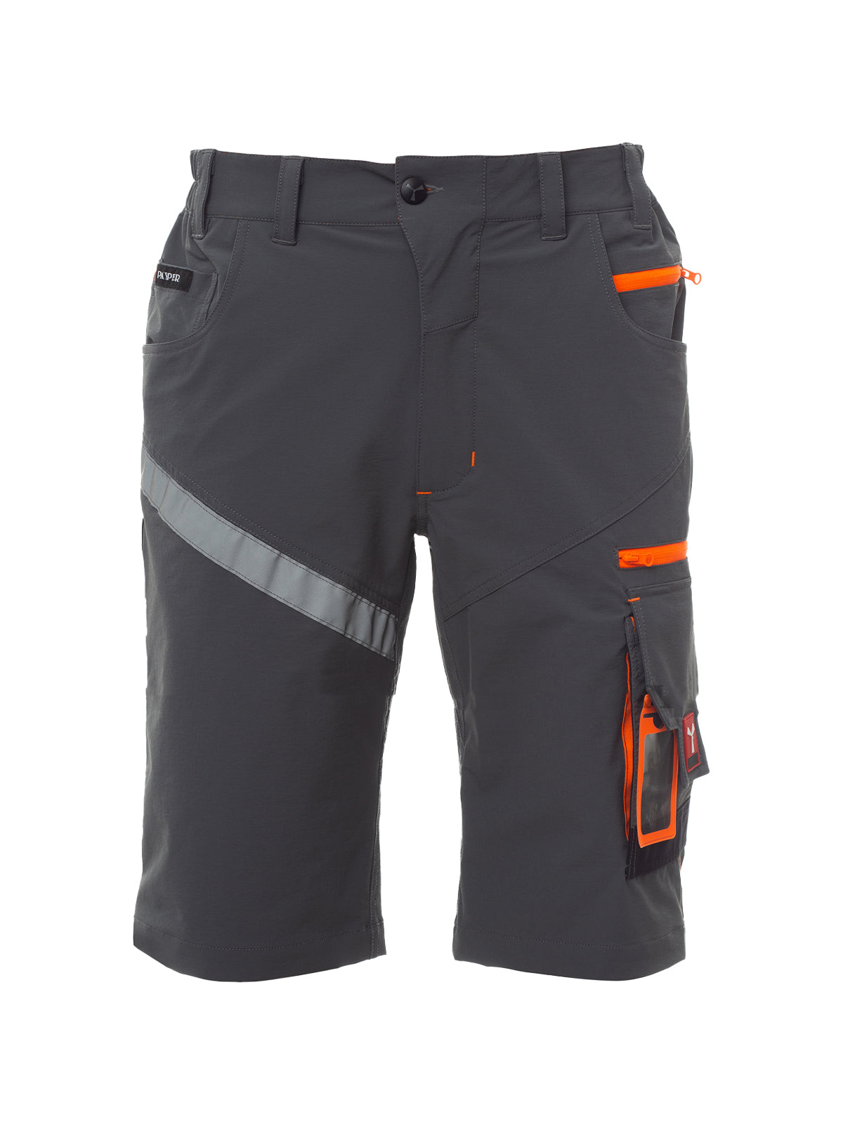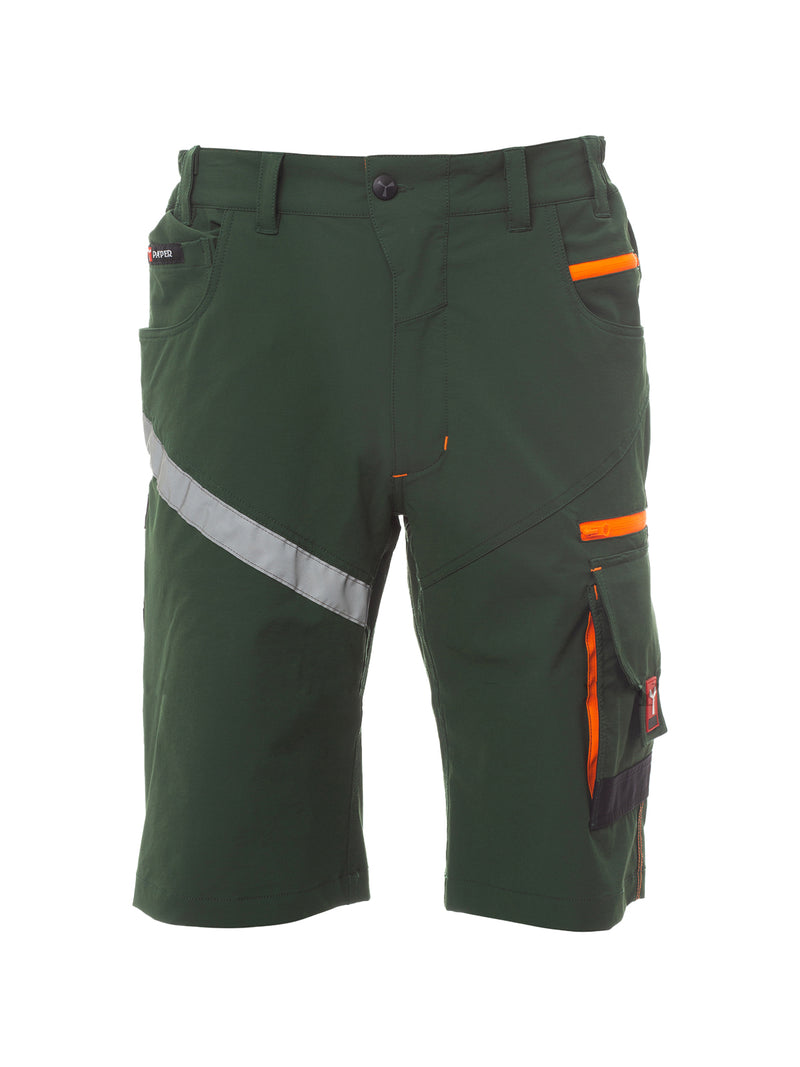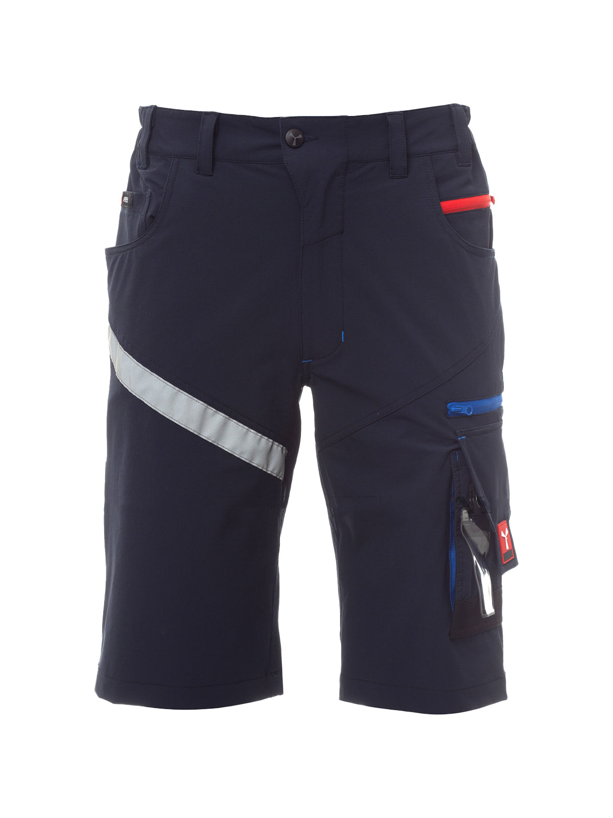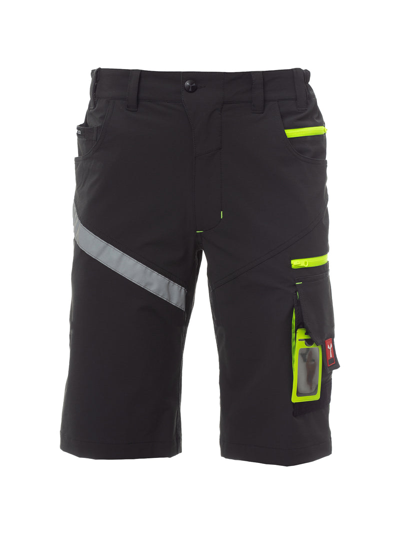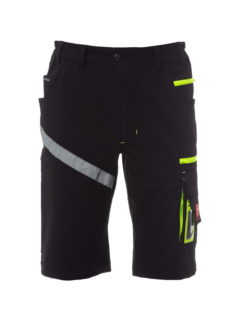 AccediBermuda unisex, tessuto “4 way stretch”, con elastici laterali e passanti in vita, chiusura con zip e bottone personalizzato. Sul davanti ha due tasche arrotondate, un taschino porta monete a destra, un taschino di sicurezza chiuso con zip a sinistra. Sul fronte della gamba sinistra presenta 3 tasche: una tasca orizzontale chiusa da una zip, una tasca con patta sagomata chiusa con velcro e dotata di portabadge, una tasca piccola verticale chiusa con zip. Sul fronte della gamba destra è presente una banda retroriflettente. Sul retro sono presenti: una tasca con pattina chiusa con velcro e una tasca senza pattina ma con 2 bande retroriflettenti, un anello porta martello (gamba destra), una tasca aperta porta-metro (gamba destra) e una tasca porta-telefono con patta e velcro (gamba destra). Sono presenti anche impunture laterali e travette di rinforzo a contrasto in vari punti. Le taglie (italiane) centrali 48-50-52 hanno un interno gamba di 31 cm.