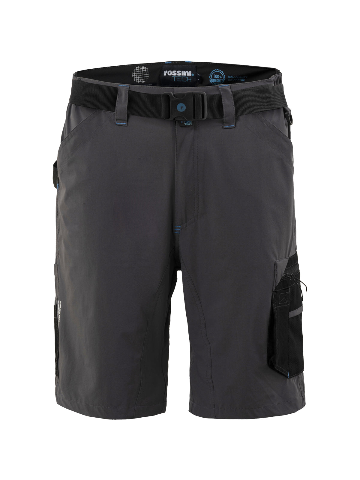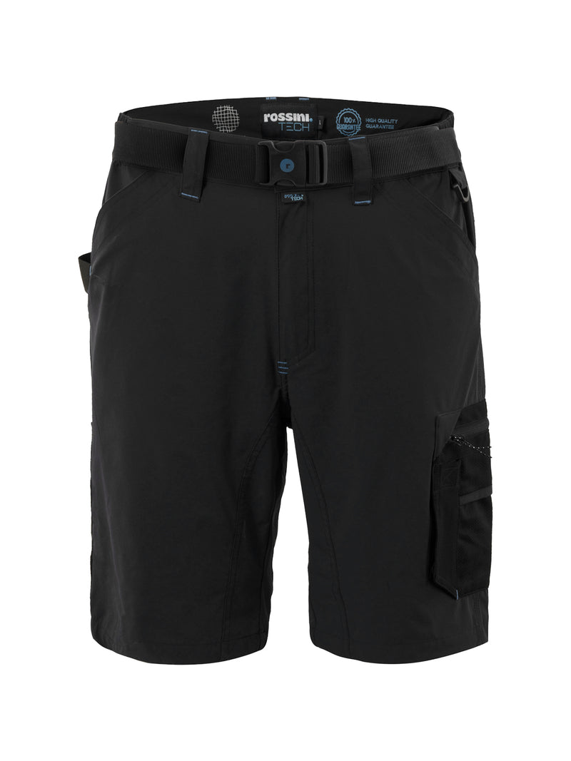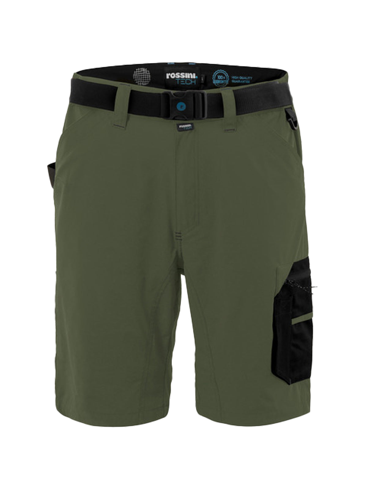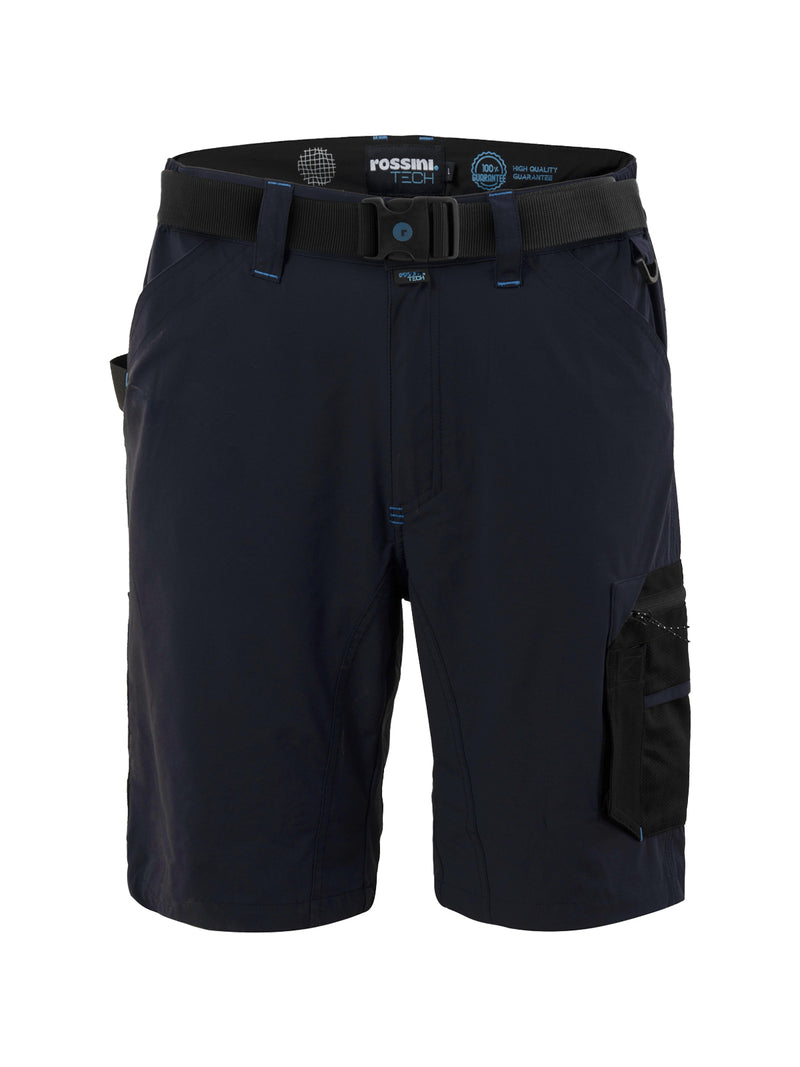 AccediBermuda da lavoro in tessuto stretch nelle quattro direzioni, ultraleggero e traspirante, elastici laterali in vita e passanti, inserto in rete di colore a contrasto nella zona renale. Chiusura alla patta con zip e bottone in metallo con finitura effetto rame. Pratica cintura estraibile in poliestere, regolabile con fibbia a chiusura automatica.