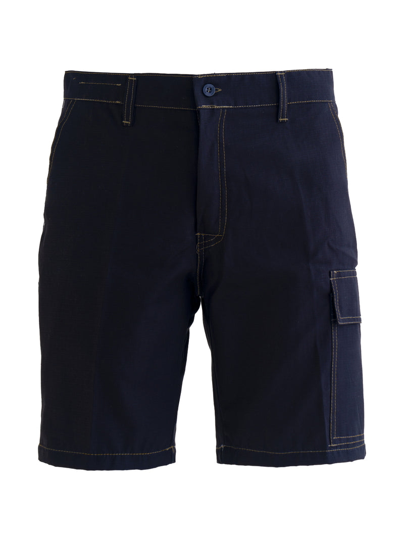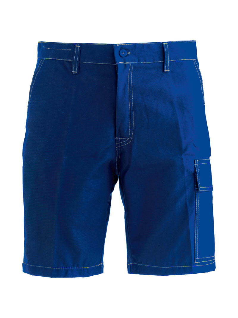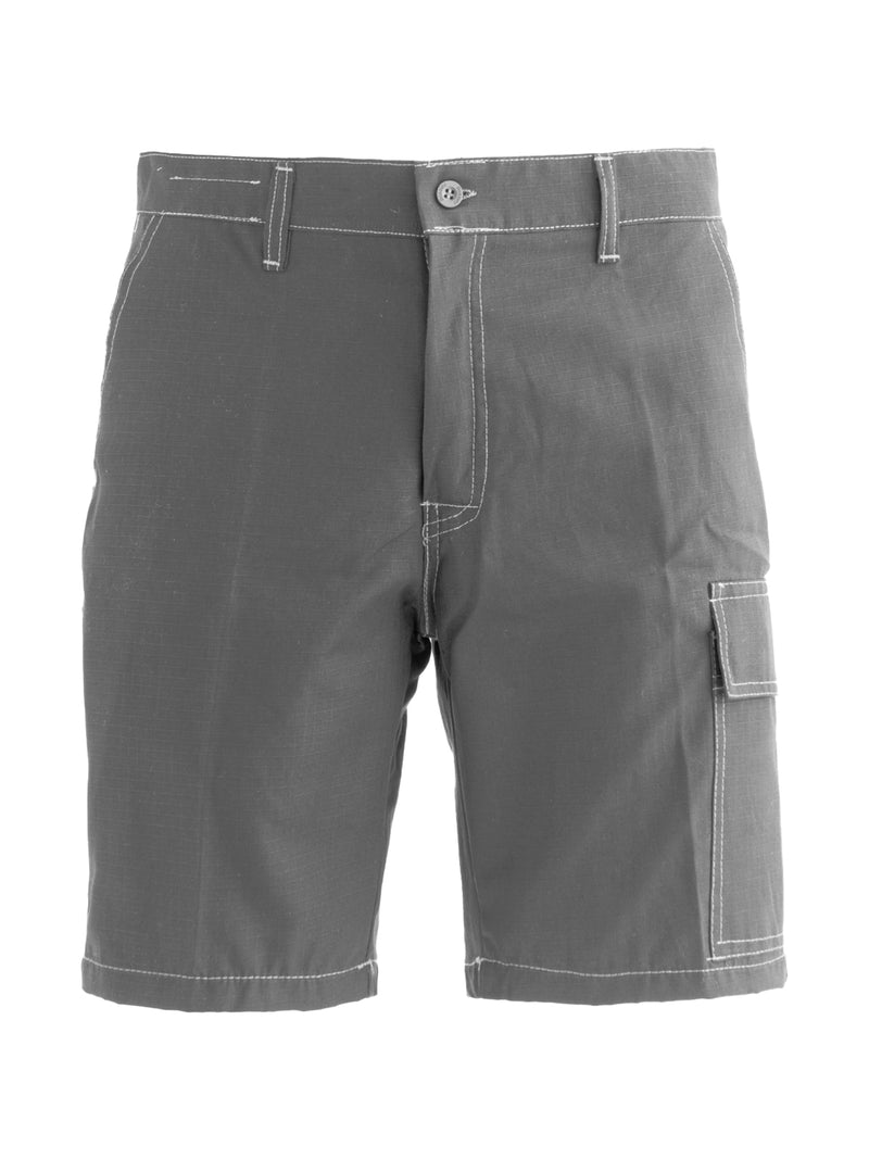 AccediBermuda da lavoro in cotone leggero ed antistrappo, con passanti in vita ed elastico posteriore, chiusura alla patta con cerniera e bottone scoperto, due tasche anteriori, una tasca posteriore applicata a destra chiusa con bottone, un porta metro applicato su gamba destra, un portapenne e un tascone laterale chiuso con aletta e velcro applicati sulla gamba sinistra, cuciture di colore a contrasto.