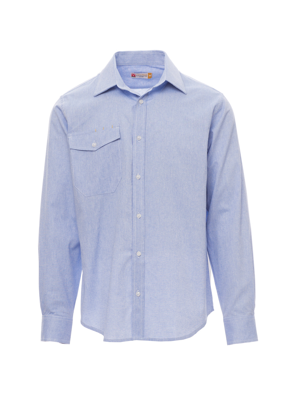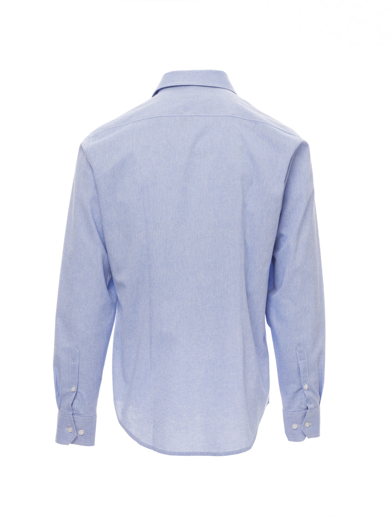 AccediCon vestibilità leggermente sfiancata, colletto modello italiano, davanti con cannoncino cucito a vista e bottone bianco effetto perlato, polso sagomato a due bottoni e un'asola; dietro con carrè e pinces di ripresa; una tasca tecnica al petto chiusa da patta con bottone e due asole porta penna.