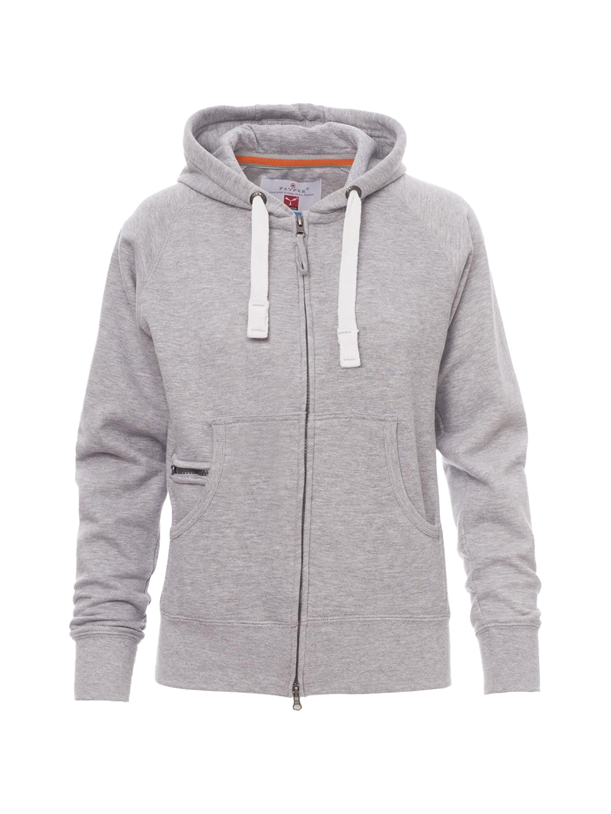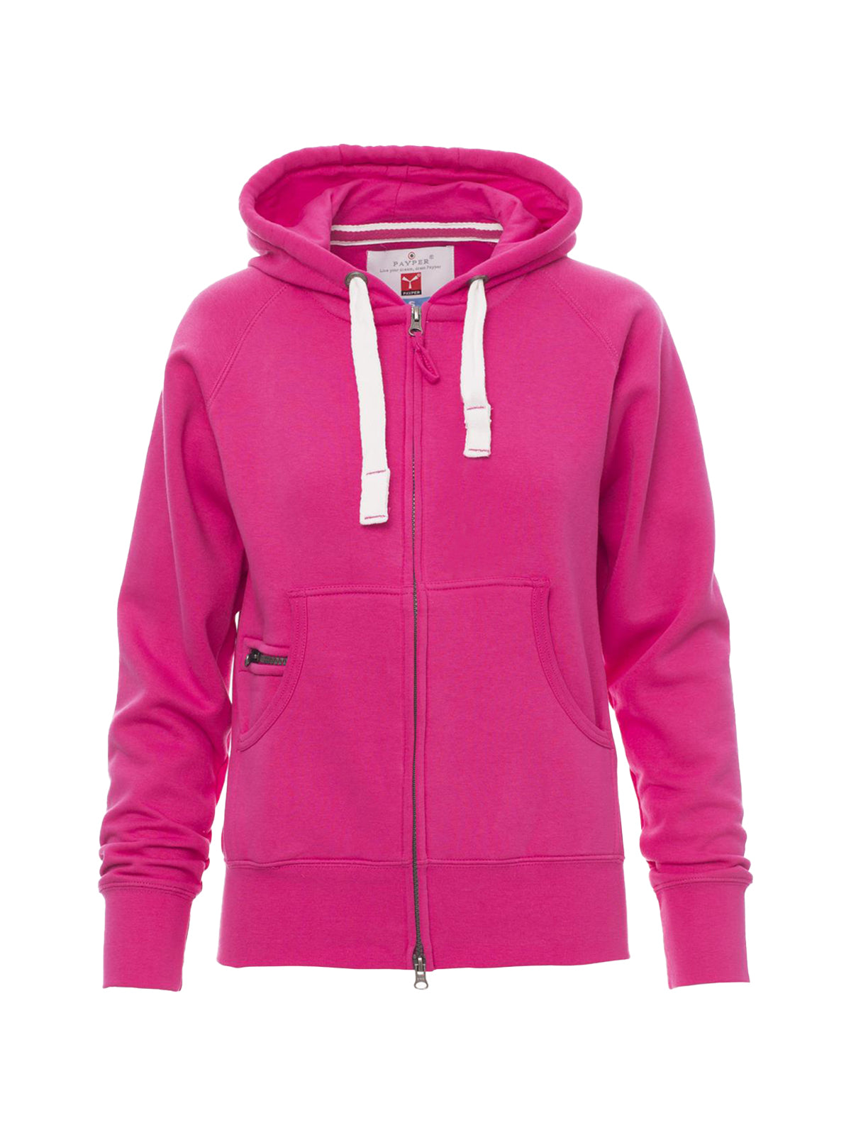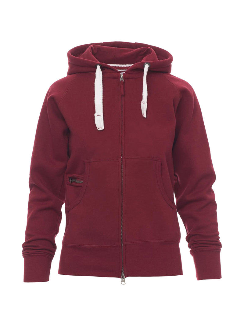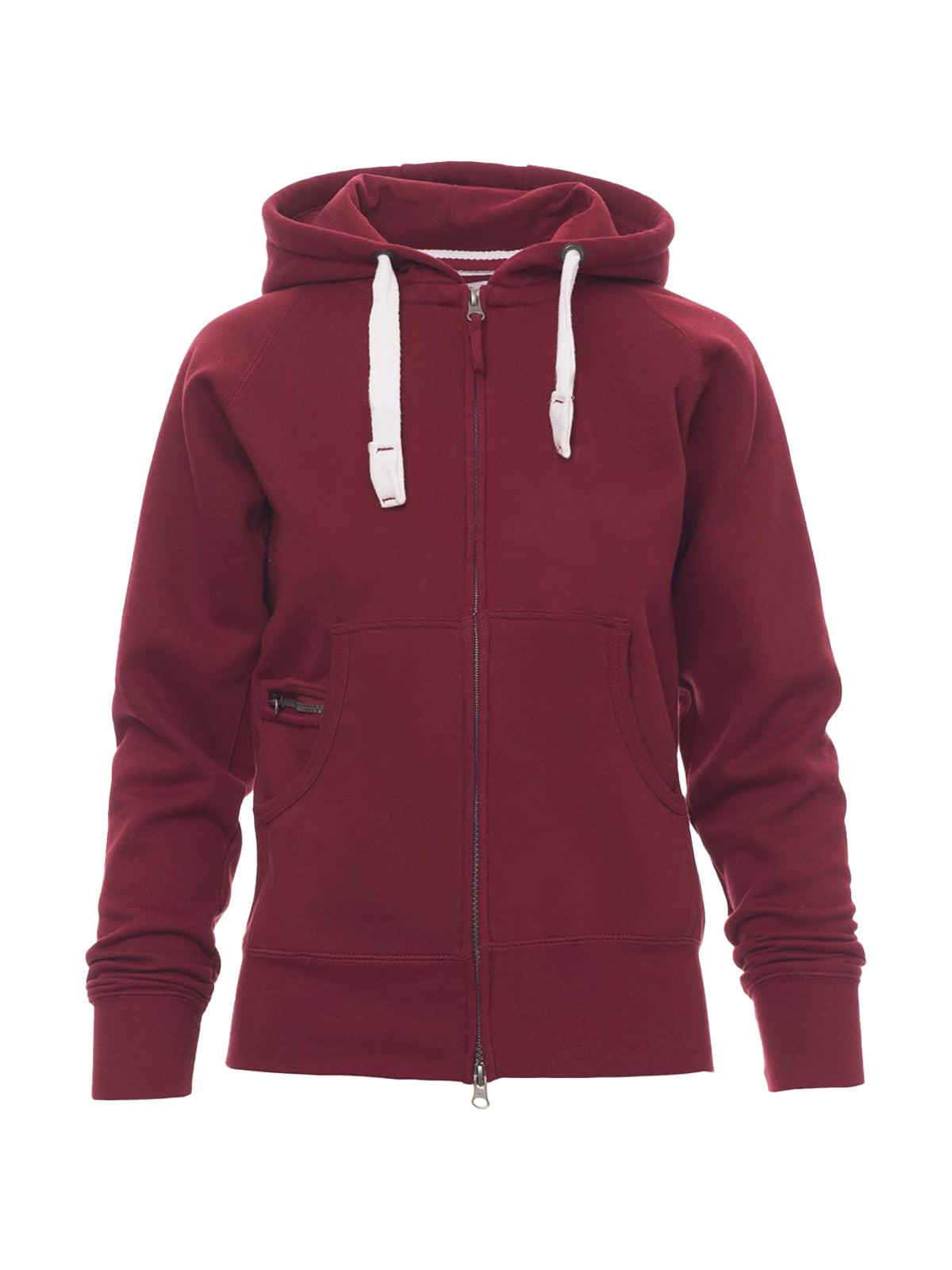 AccediFelpa garzata e sfiancata da donna con zip intera SBS coperta, dotata di doppio cursore in metallo. Il cappuccio presenta due cuciture e una coulisse bianca in corda con cuciture in tinta e anelle in metallo. Manica raglan per una vestibilità comoda e tasche a marsupio con taschino zip per una maggiore praticità. Polsini e vita in costina elasticizzata, mentre le cuciture rinforzate assicurano una maggiore durata nel tempo.
