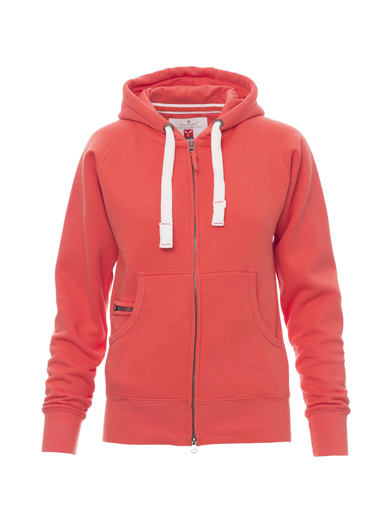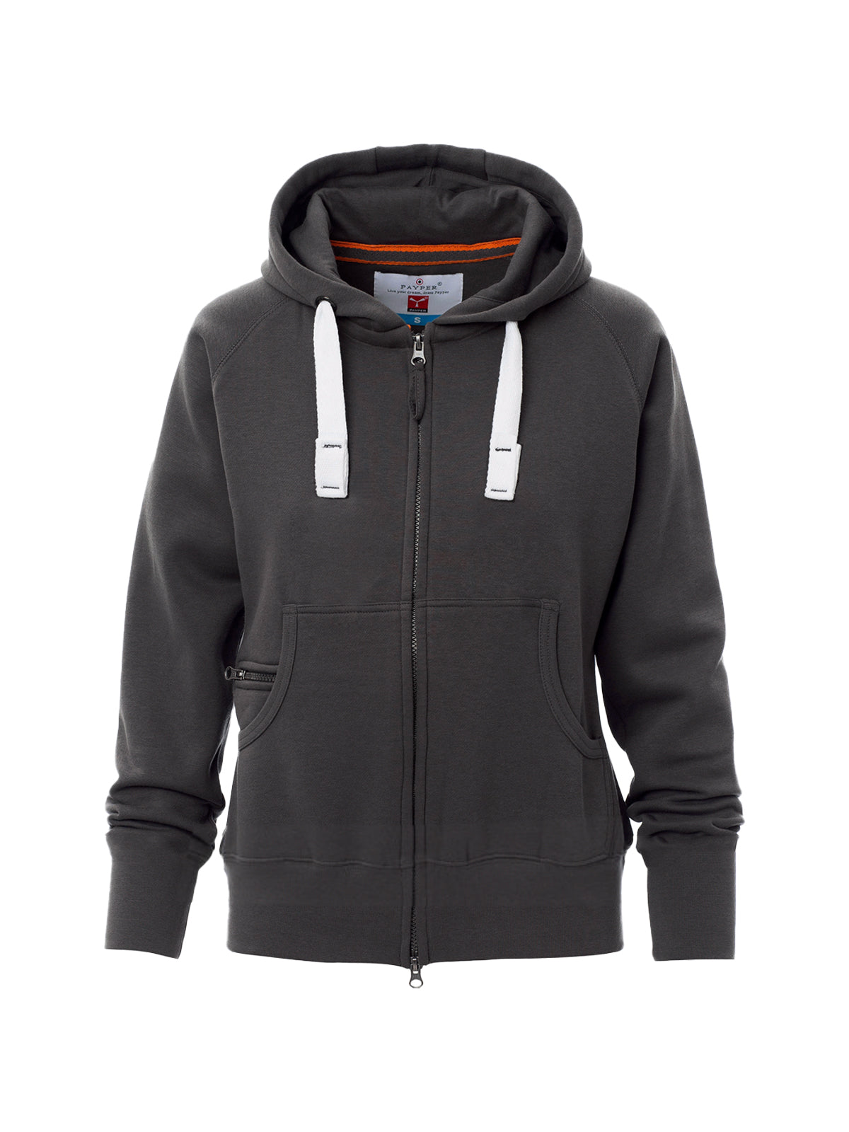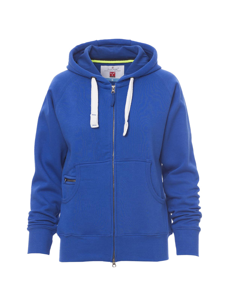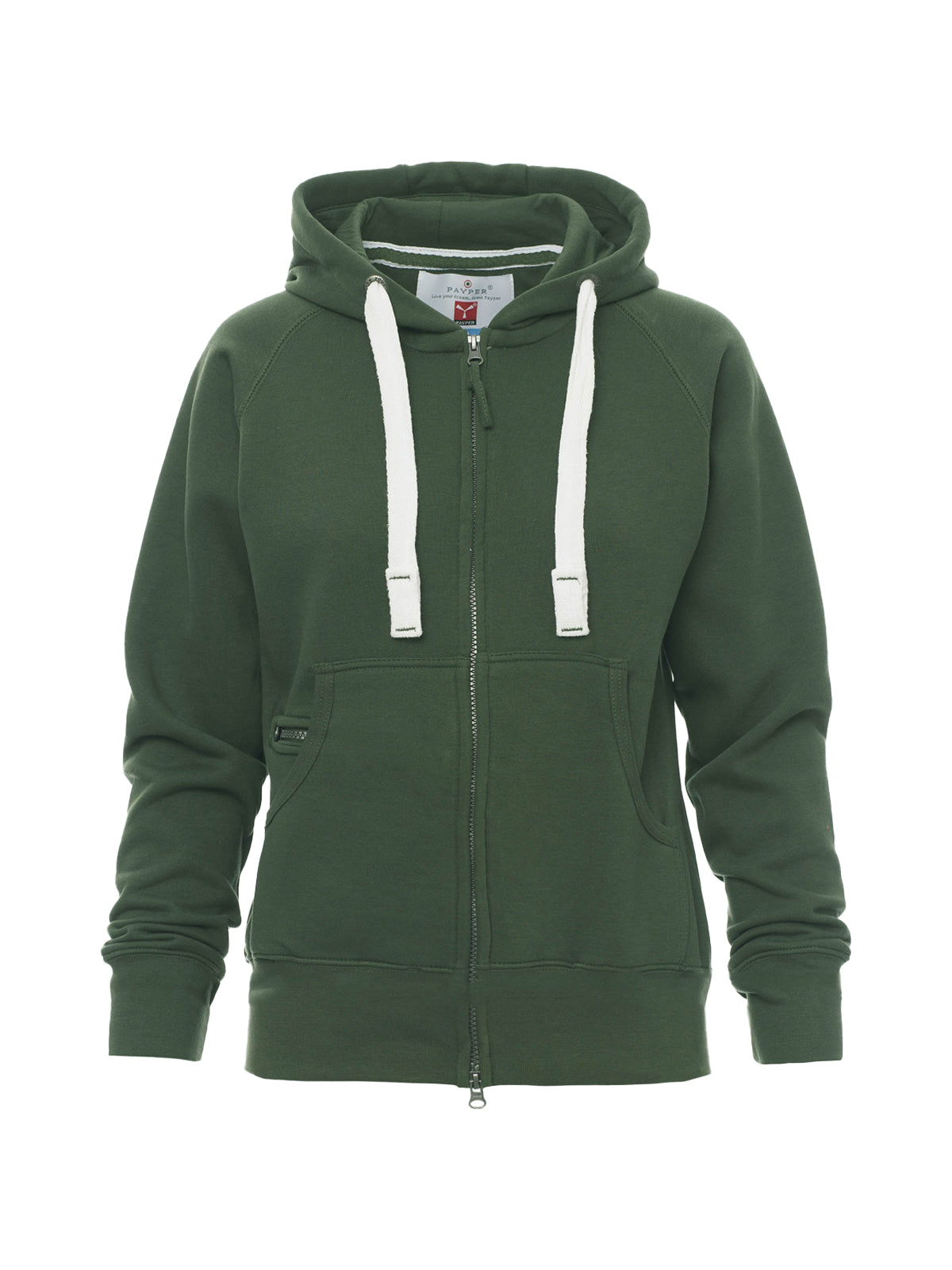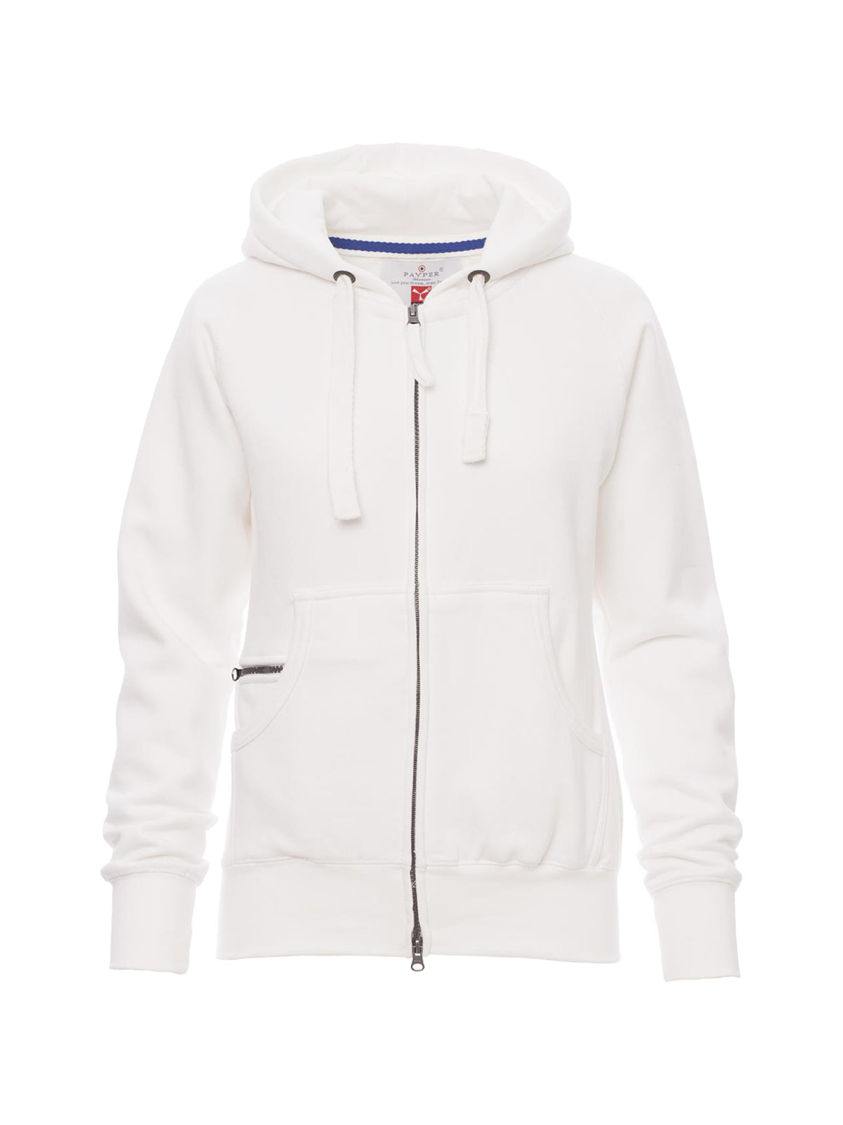 AccediFelpa garzata e sfiancata da donna con zip intera SBS coperta, dotata di doppio cursore in metallo. Il cappuccio presenta due cuciture e una coulisse bianca in corda con cuciture in tinta e anelle in metallo. Manica raglan per una vestibilità comoda e tasche a marsupio con taschino zip per una maggiore praticità. Polsini e vita in costina elasticizzata, mentre le cuciture rinforzate assicurano una maggiore durata nel tempo.
