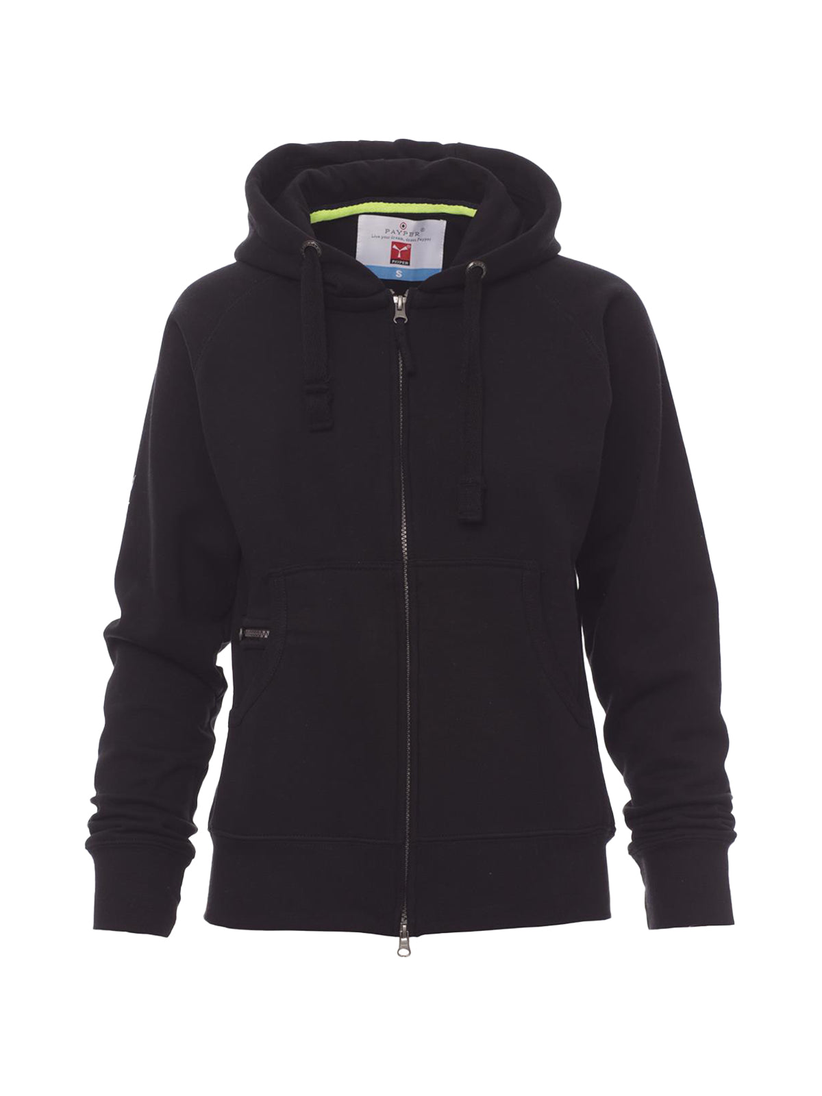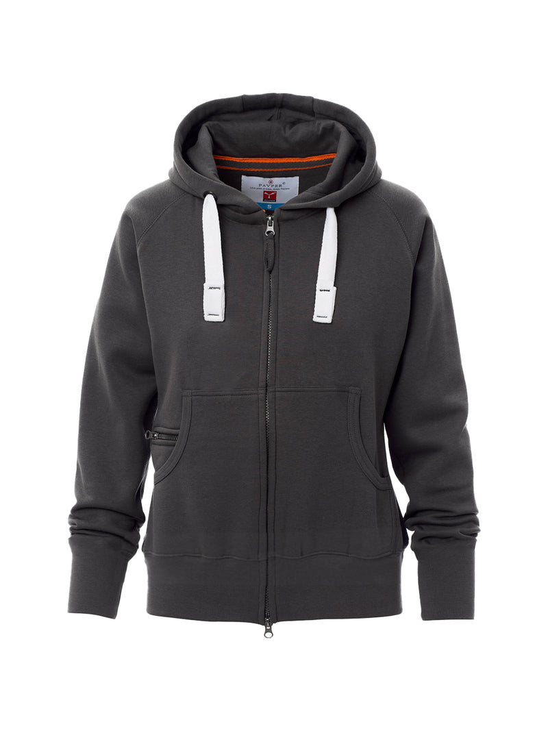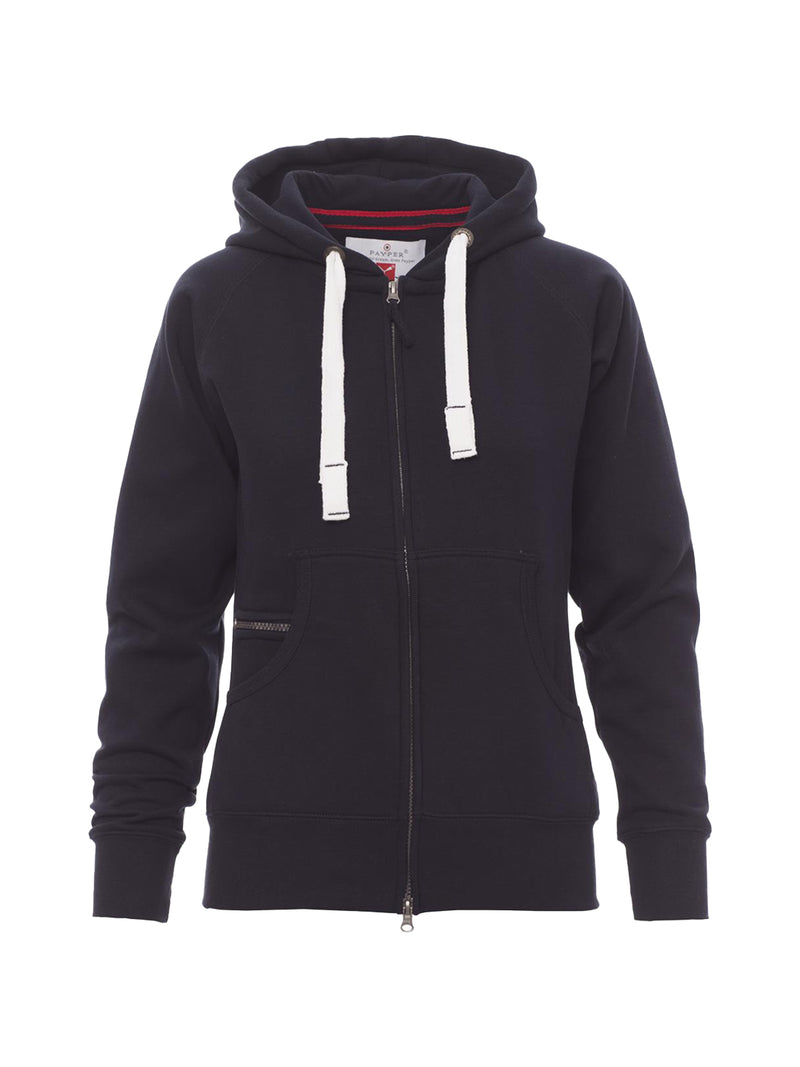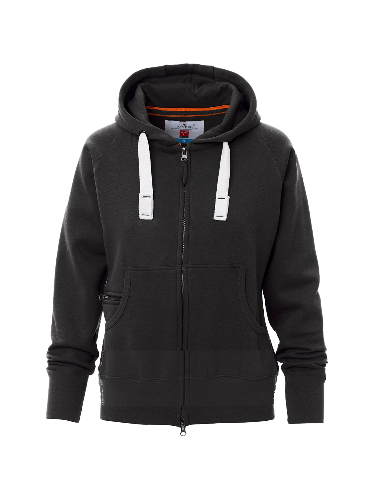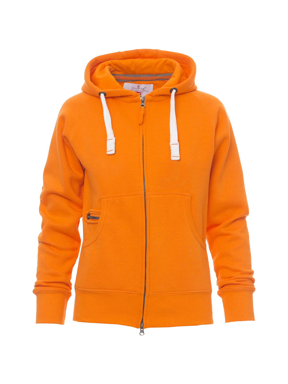AccediFelpa garzata e sfiancata da donna con zip intera SBS coperta, dotata di doppio cursore in metallo. Il cappuccio presenta due cuciture e una coulisse bianca in corda con cuciture in tinta e anelle in metallo. Manica raglan per una vestibilità comoda e tasche a marsupio con taschino zip per una maggiore praticità. Polsini e vita in costina elasticizzata, mentre le cuciture rinforzate assicurano una maggiore durata nel tempo.