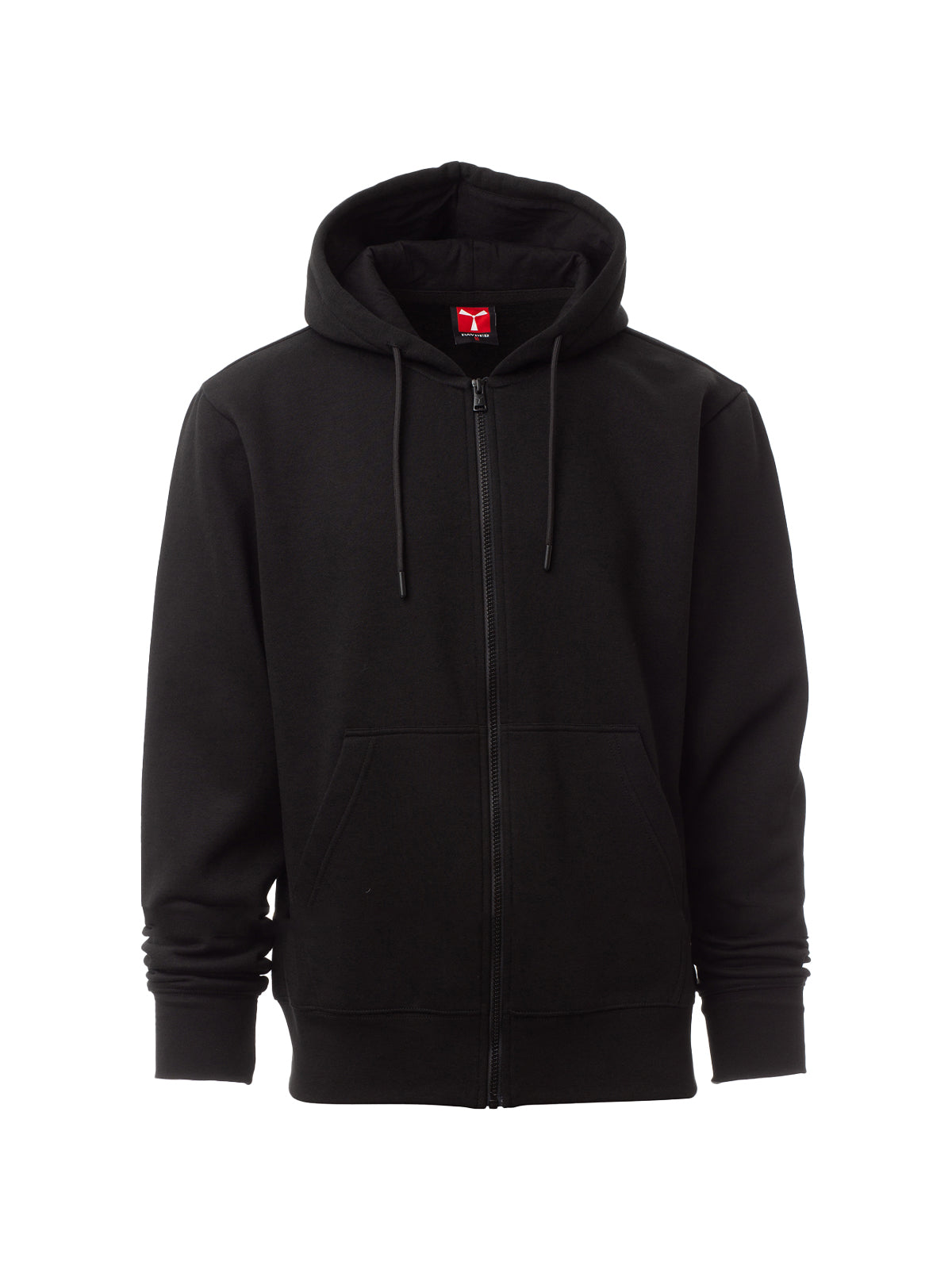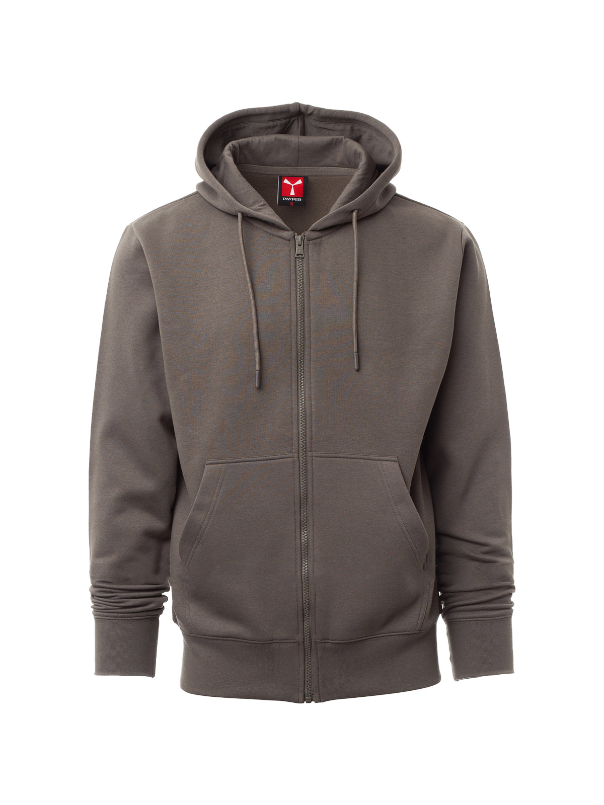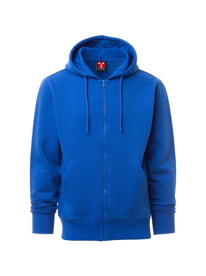 AccediFelpa garzata con zip intera in plastica a cursore singolo personalizzato, cappuccio, coulisse e cuciture in tinta, manica a giro, tasche a marsupio, polsini e fondo in costina elasticizzata. Cuciture rinforzate, nastro di rinforzo interno collo in tinta.