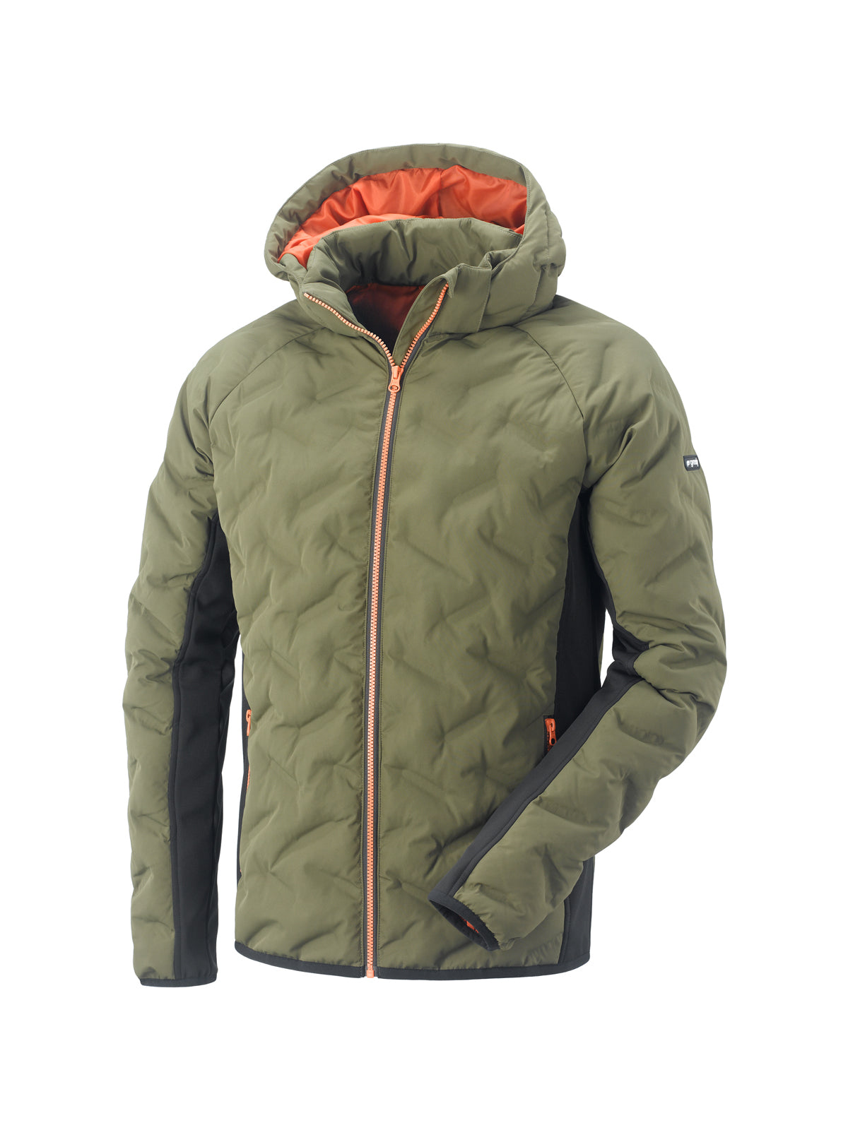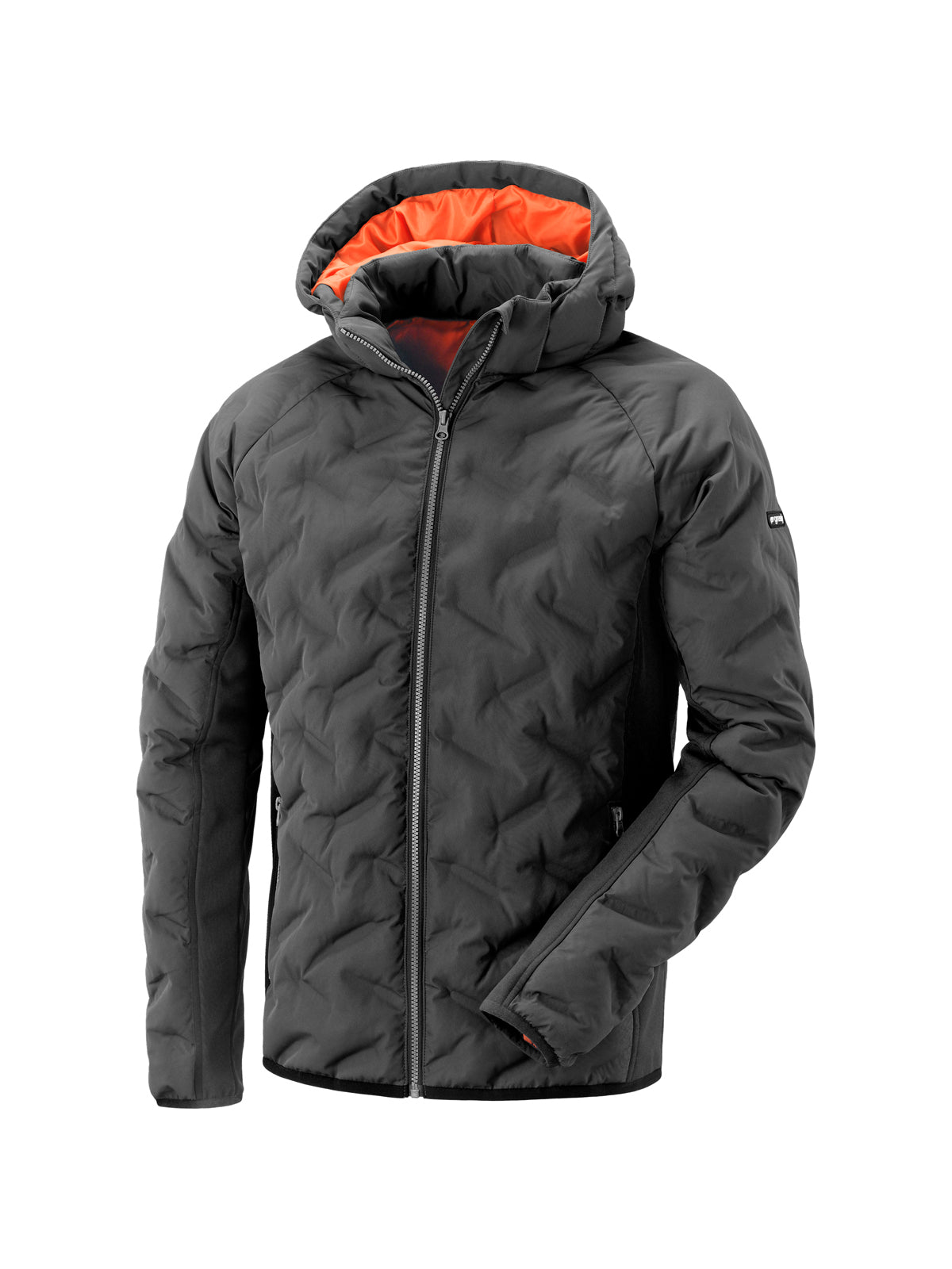 Cappuccio regolabile e staccabile, due tasche in vita con zip e taschino interno.