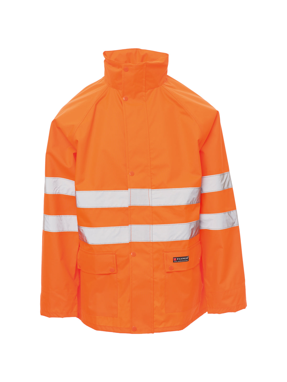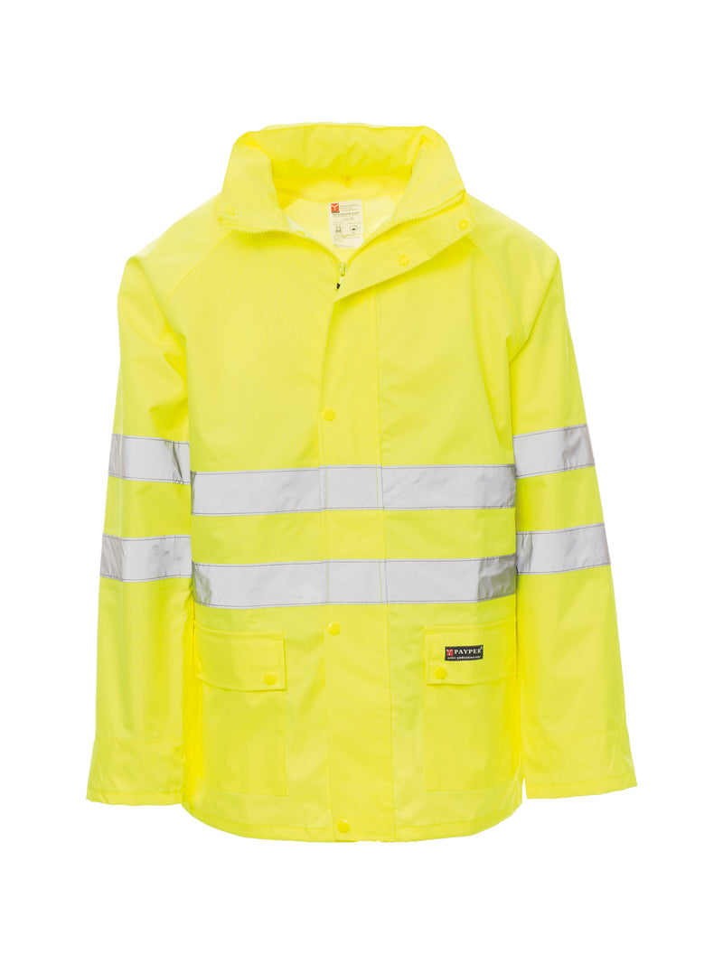AccediGiacca, con spalmatura in PU, antipioggia in alta visibilità con bande 3M, manica raglan, zip intera in nylon e patta con bottoni automatici, cappuccio richiudibile nel colletto, coulisse in vita, fondo manica dritto con polsino elasticizzato interno, due tasche a busta con patta. Bande e cuciture termosaldate.