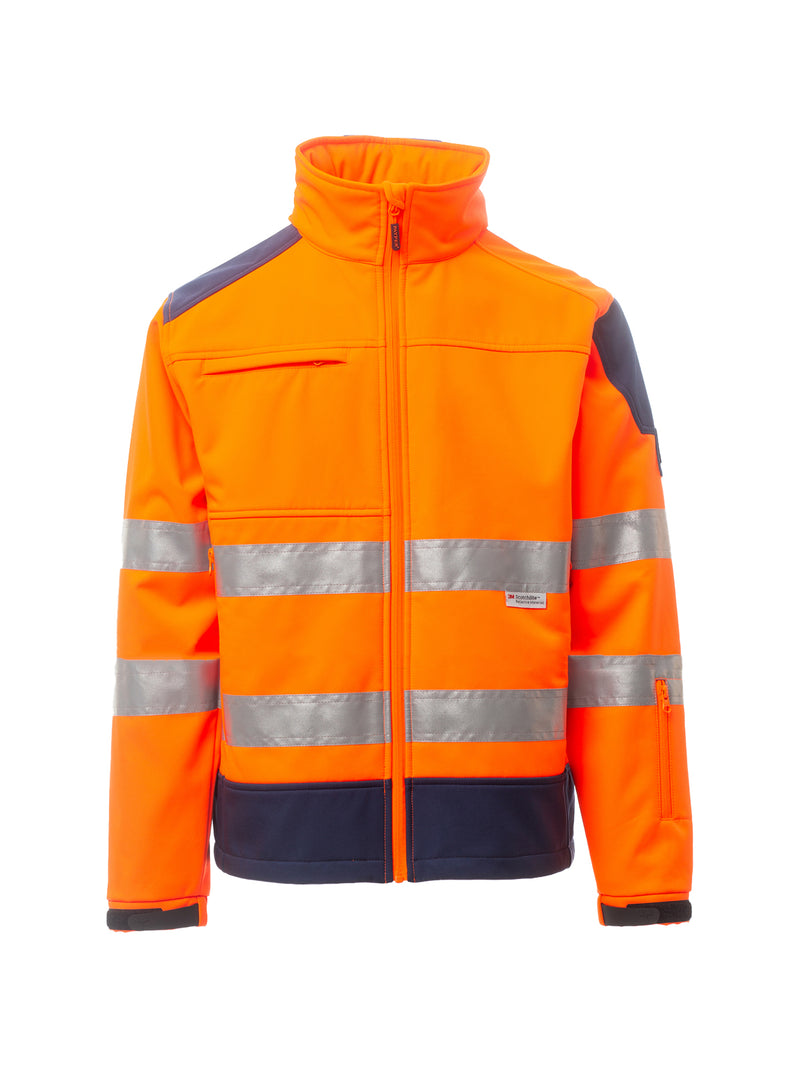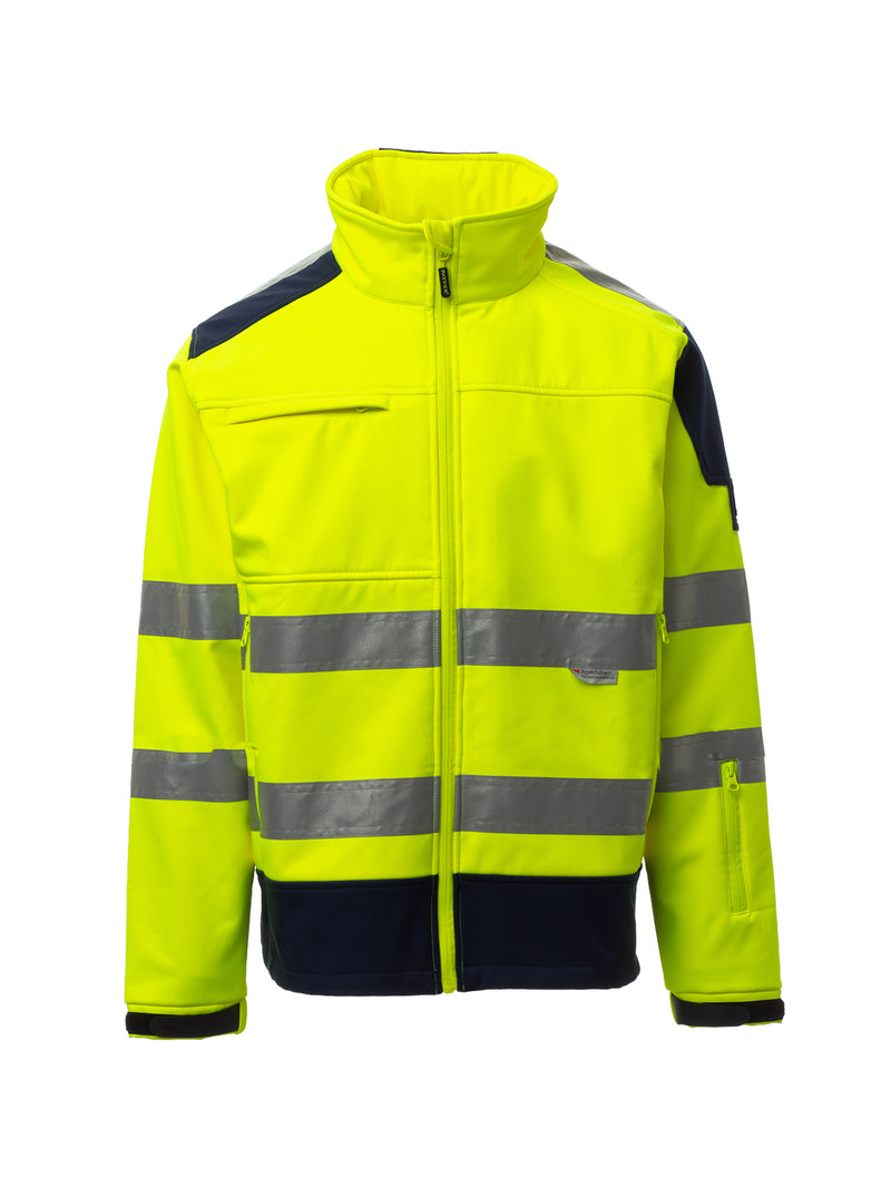 Giacca ergonomica da uomo bicolore in alta visibilità con bande 3M, zip lunga SBS nastrata, polsini regolabili con stringi polso in velcro,con cappuccio a scomparsa, due tasche laterali con zip, una tasca al petto, porta badge staccabile e richiudibile e una tasca al braccio sinistro.