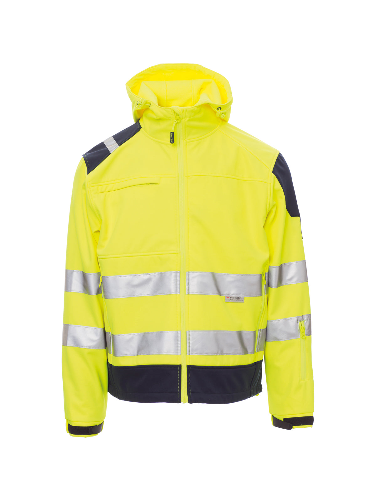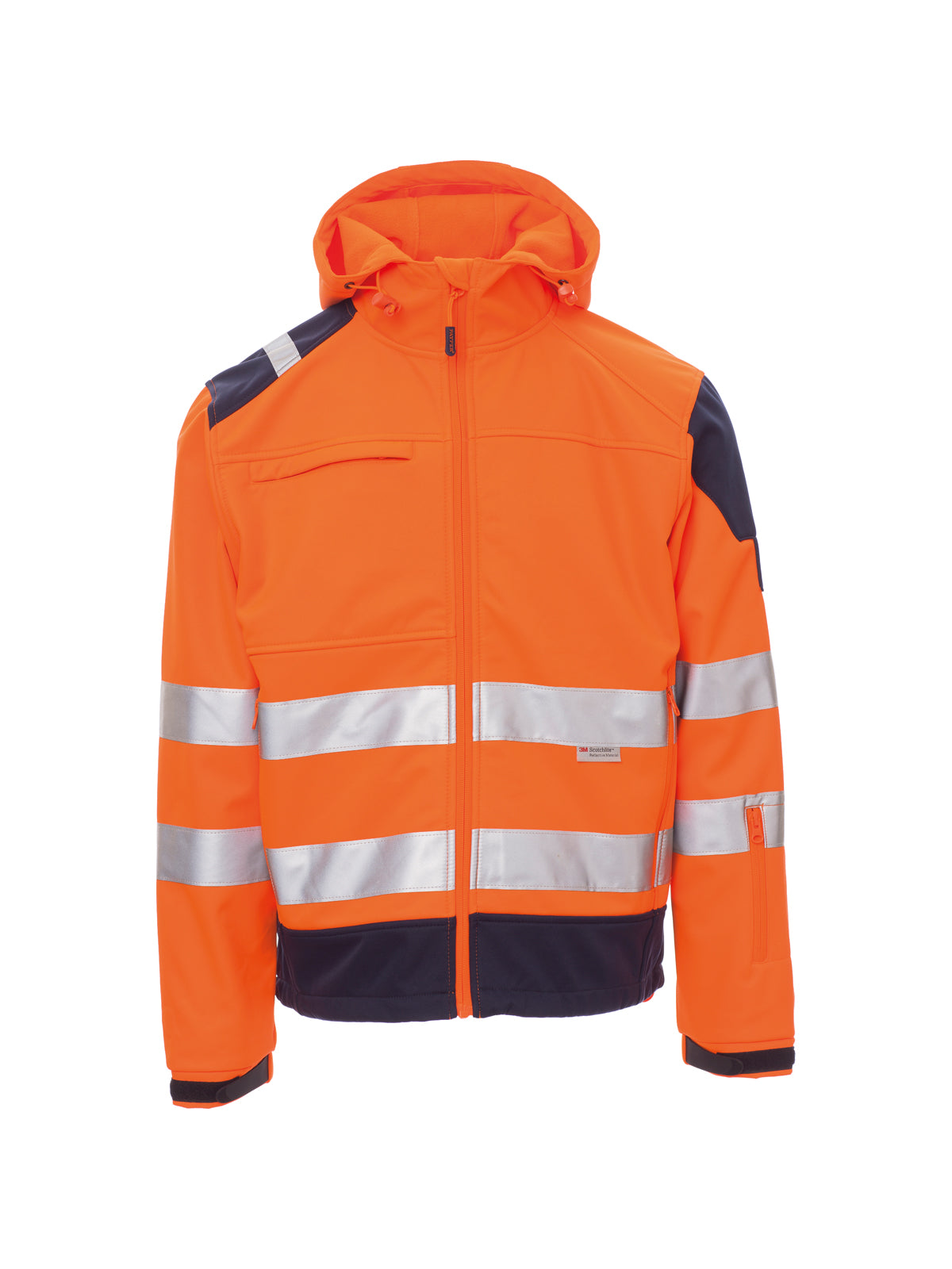 Giacca ergonomica da uomo bicolore, in alta visibilità, con bande 3M, manica raglan, cappuccio sagomato con due cuciture e coulisse, zip lunga SBS, polsini regolabili con stringi polso in velcro, due tasche laterali con zip, una tasca al petto, porta badge staccabile e richiudibile e una tasca al braccio sinistro.