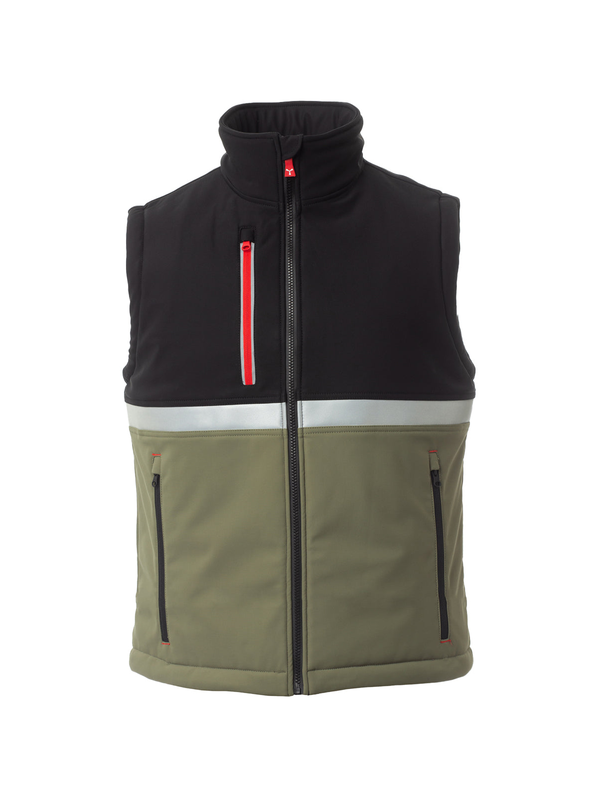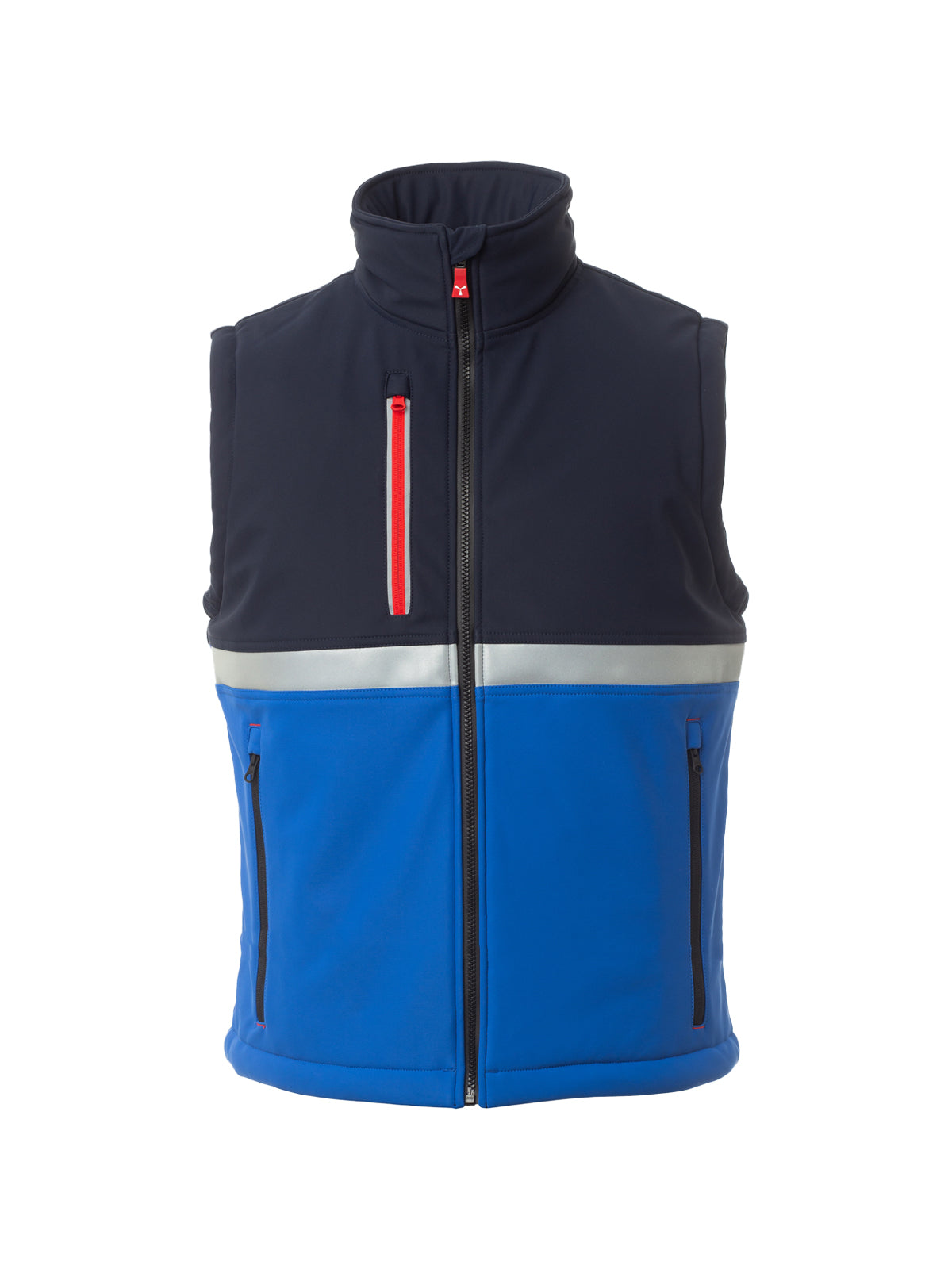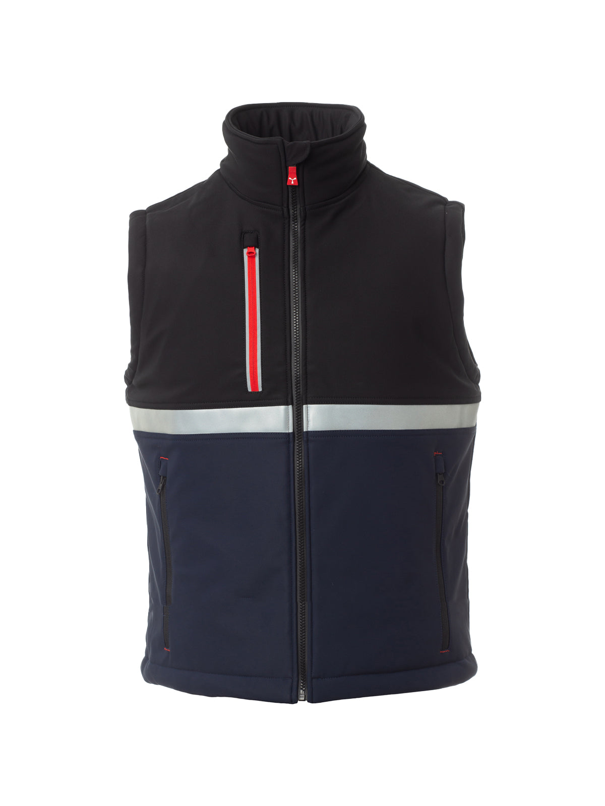 Gilet soft-shell imbottito, chiusura tramite zip SBS con cursore in metallo "semi-autolock" e tiretto personalizzato. Banda retroriflettente frontale su torace. Due tasche laterali con zip e una tasca al petto chiusa con zip dal dettaglio retroriflettente. Elemento "life-saving" sul retro, con logotipo interno retroriflettente, chiuso con zip. Due tasche interne: una sagomata con zip sul petto destro ed una porta tablet chiusa con velcro. Fondo regolabile con stopper personalizzati.