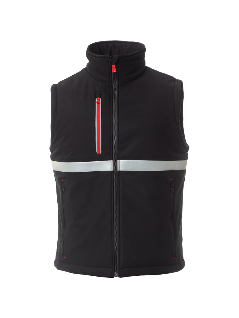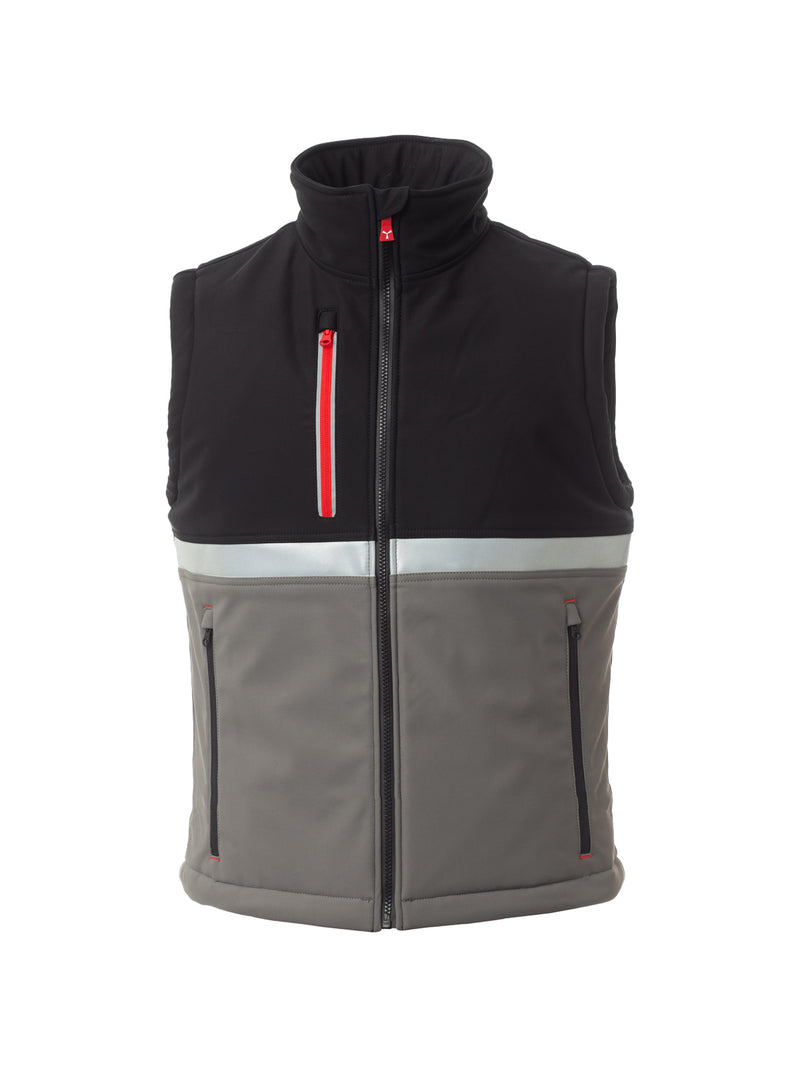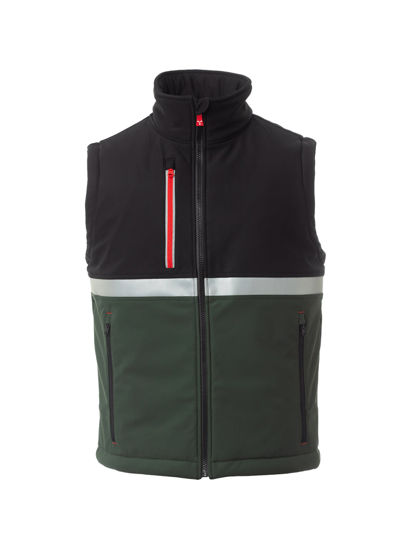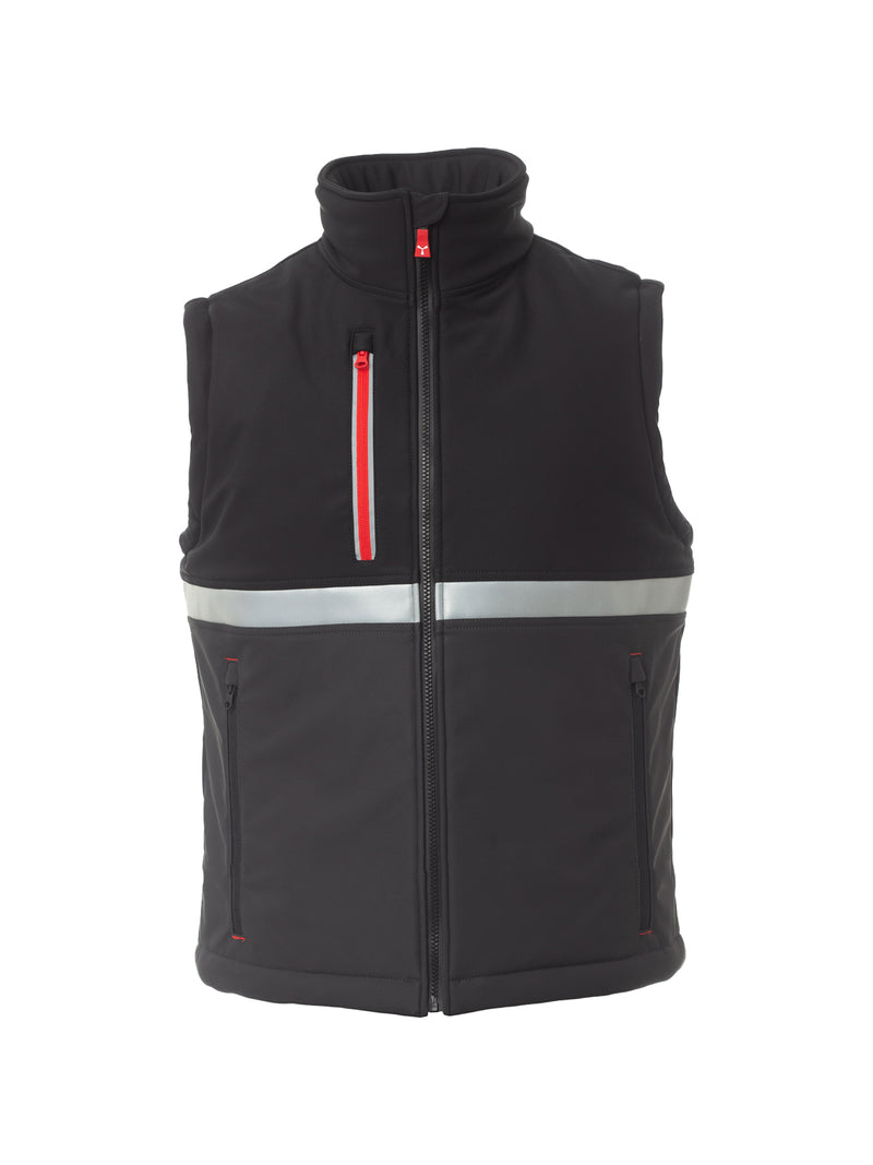Gilet soft-shell imbottito, chiusura tramite zip SBS con cursore in metallo "semi-autolock" e tiretto personalizzato. Banda retroriflettente frontale su torace. Due tasche laterali con zip e una tasca al petto chiusa con zip dal dettaglio retroriflettente. Elemento "life-saving" sul retro, con logotipo interno retroriflettente, chiuso con zip. Due tasche interne: una sagomata con zip sul petto destro ed una porta tablet chiusa con velcro. Fondo regolabile con stopper personalizzati.
