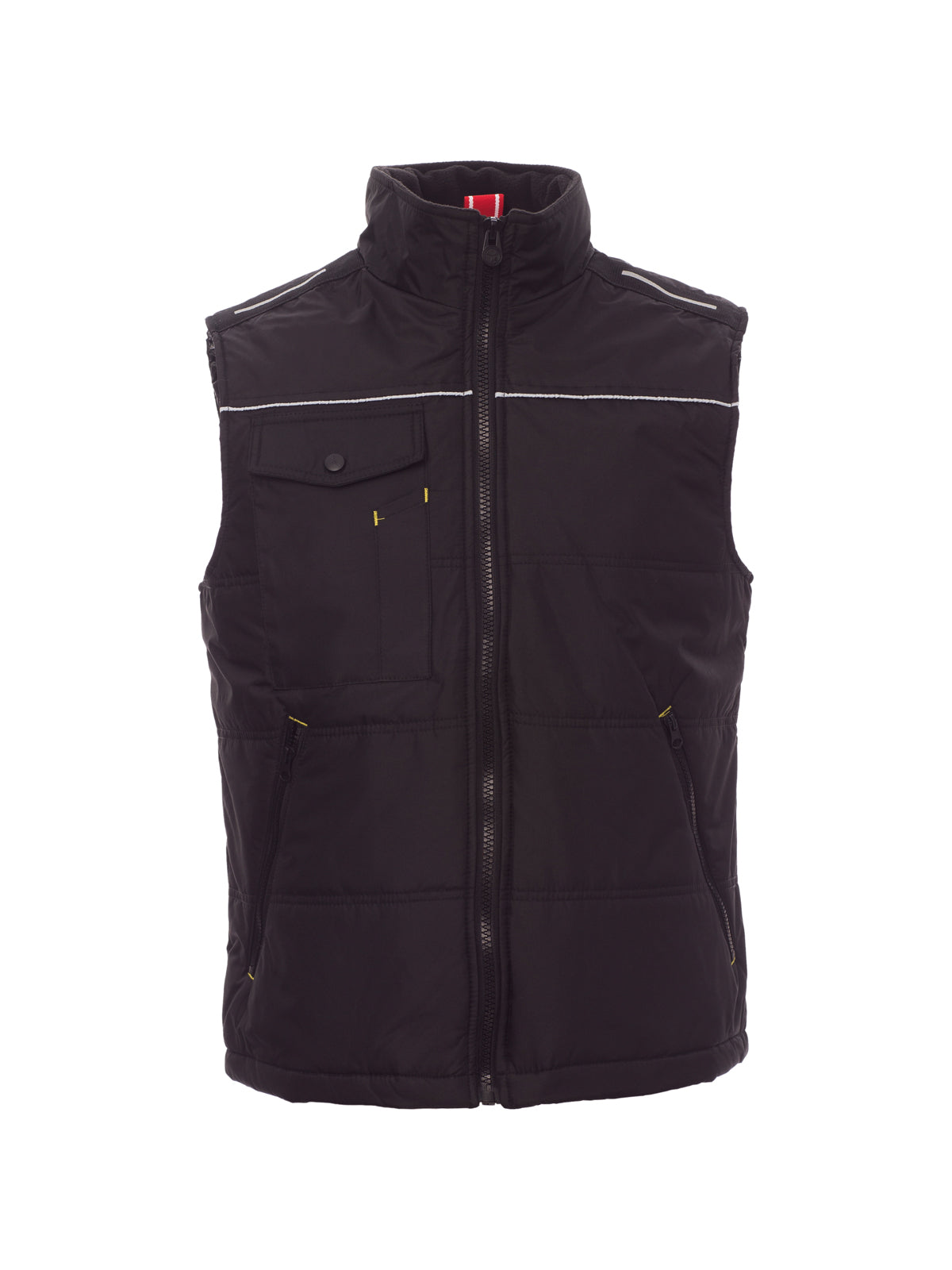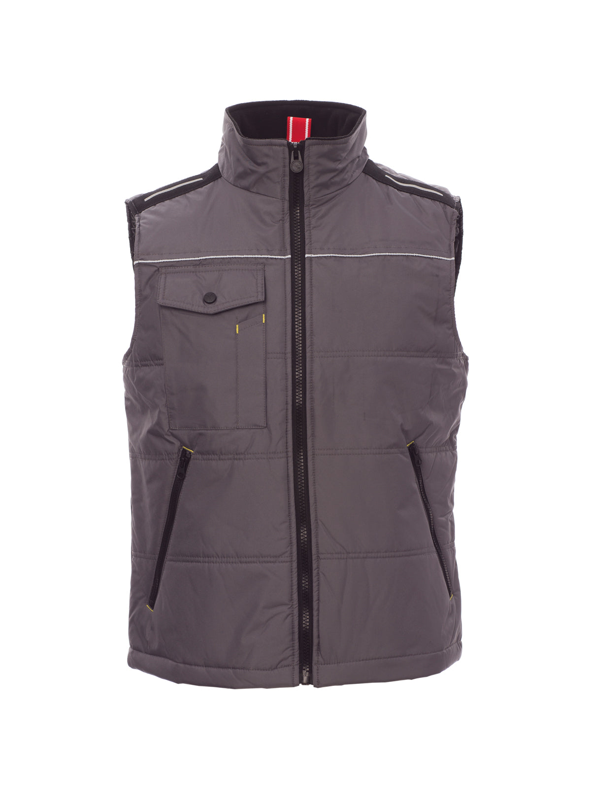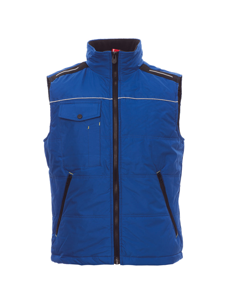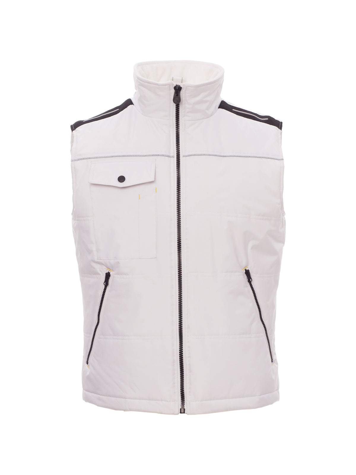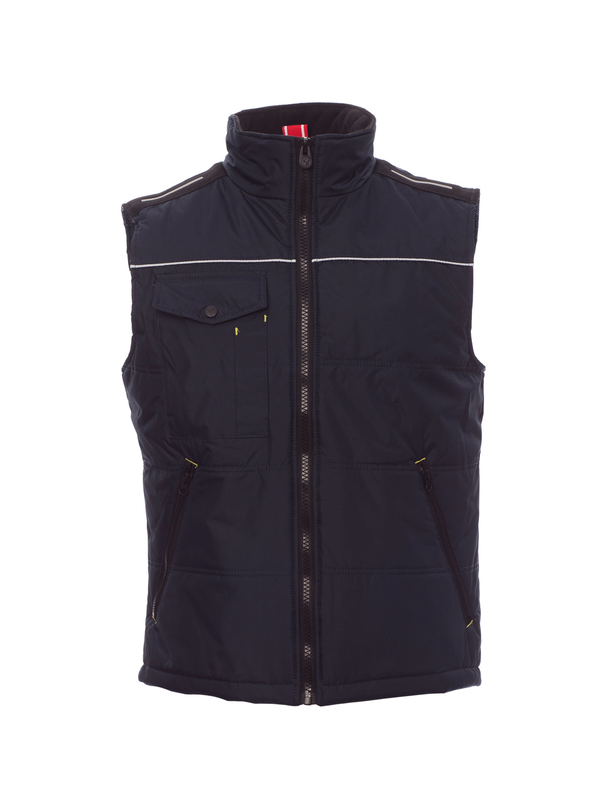 AccediGilet con zip 8 mm in plastica con cursore in metallo, retro sagomato, due ampie tasche esterne con zip, ampia tasca al petto porta smartphone, anello porta badge, piping reflex al petto e sulla schiena. Interno: imbottitura trapuntata e rifinita con fodera ad alta densità, interno colletto in pile, una tasca.