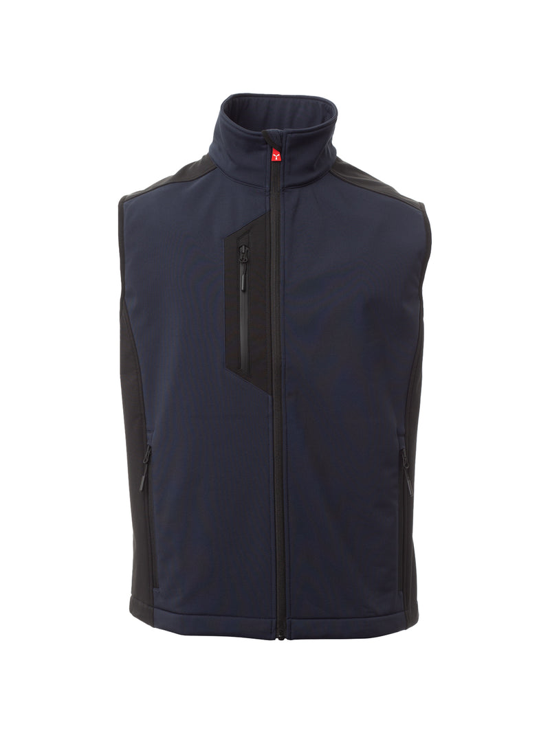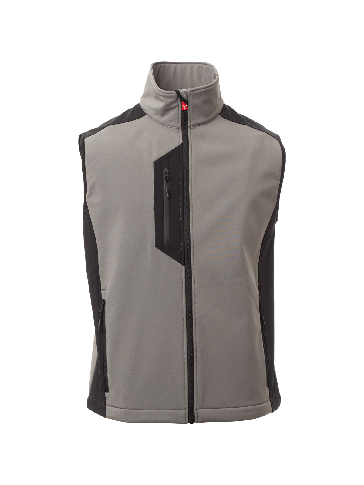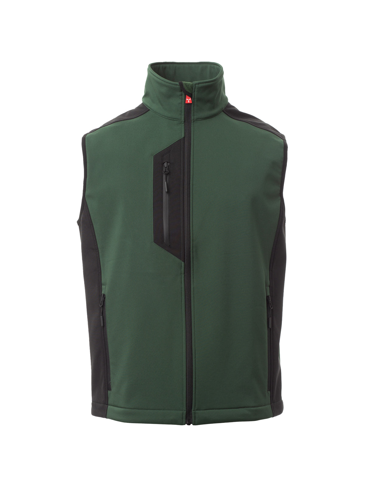 Gilet Soft-shell bicolore, chiusura tramite zip, con cursore in metallo "semi-auto lock" e tiretto personalizzato. Due tasche laterali con zip, una tasca al petto con zip spalmata. Dettaglio riflettente sul carré dietro. Fondo regolabile con stopper personalizzati.