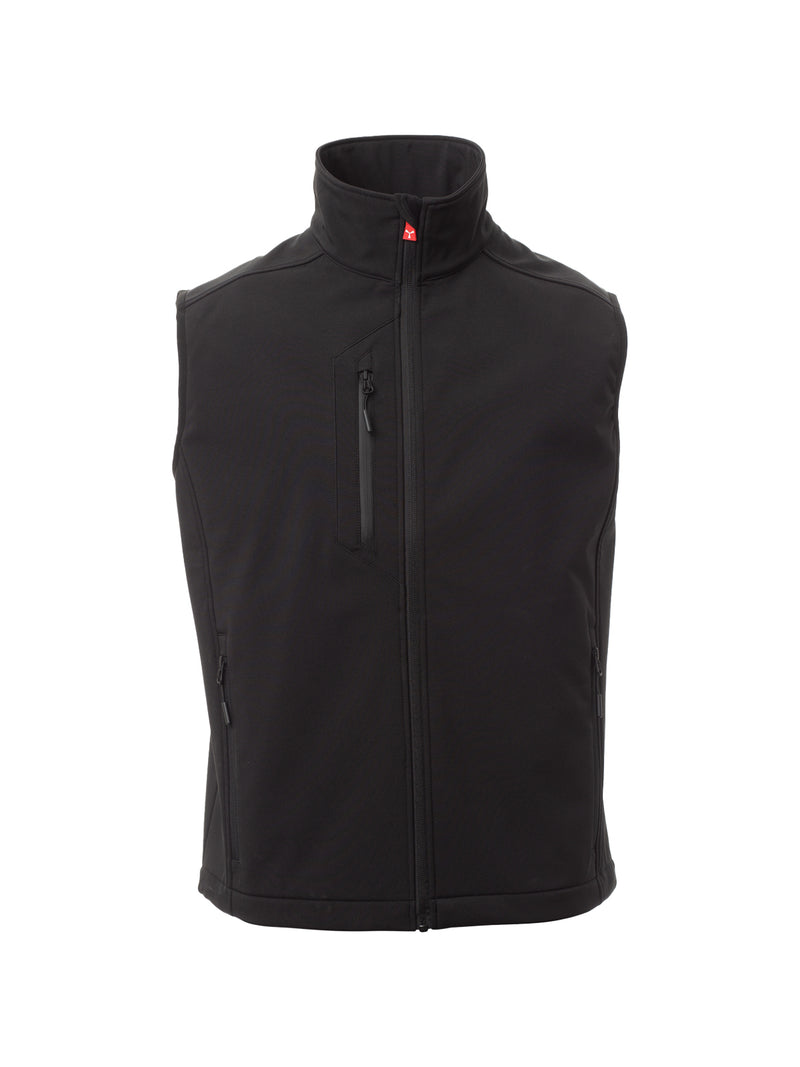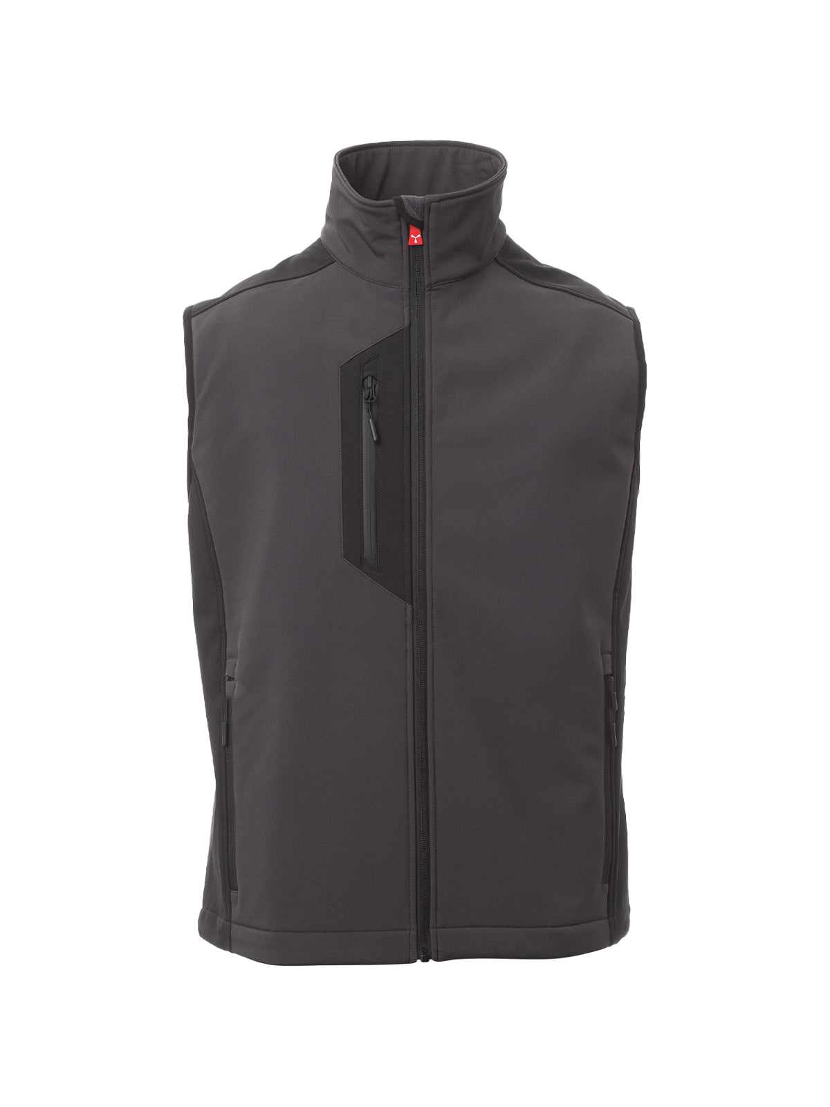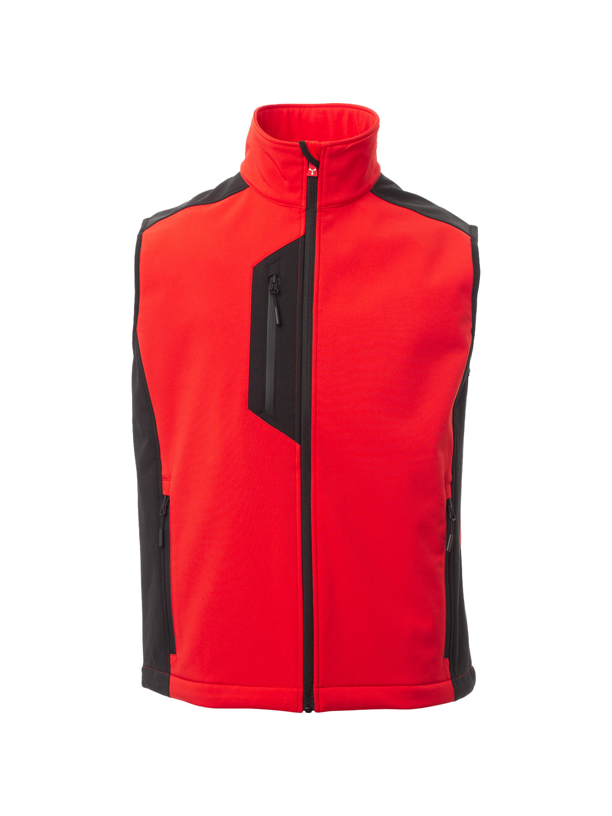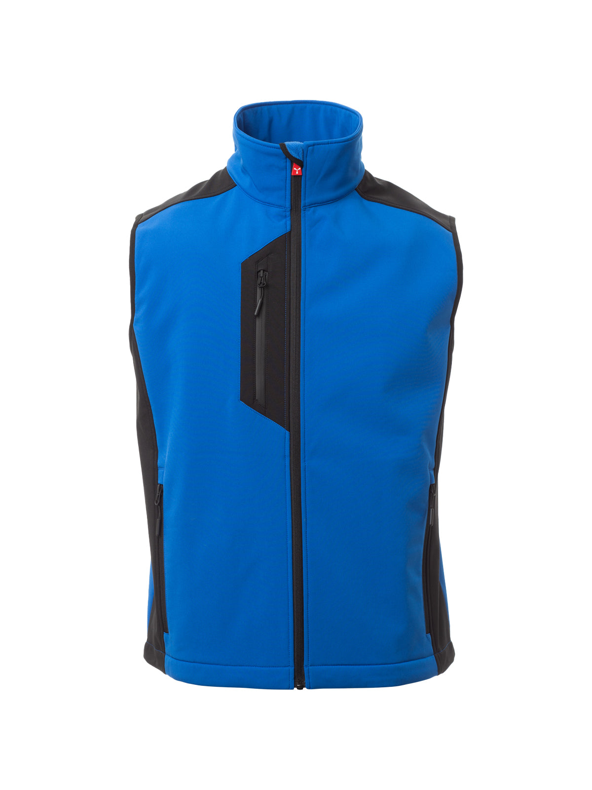 Gilet Soft-shell bicolore, chiusura tramite zip, con cursore in metallo "semi-auto lock" e tiretto personalizzato. Due tasche laterali con zip, una tasca al petto con zip spalmata. Dettaglio riflettente sul carré dietro. Fondo regolabile con stopper personalizzati.