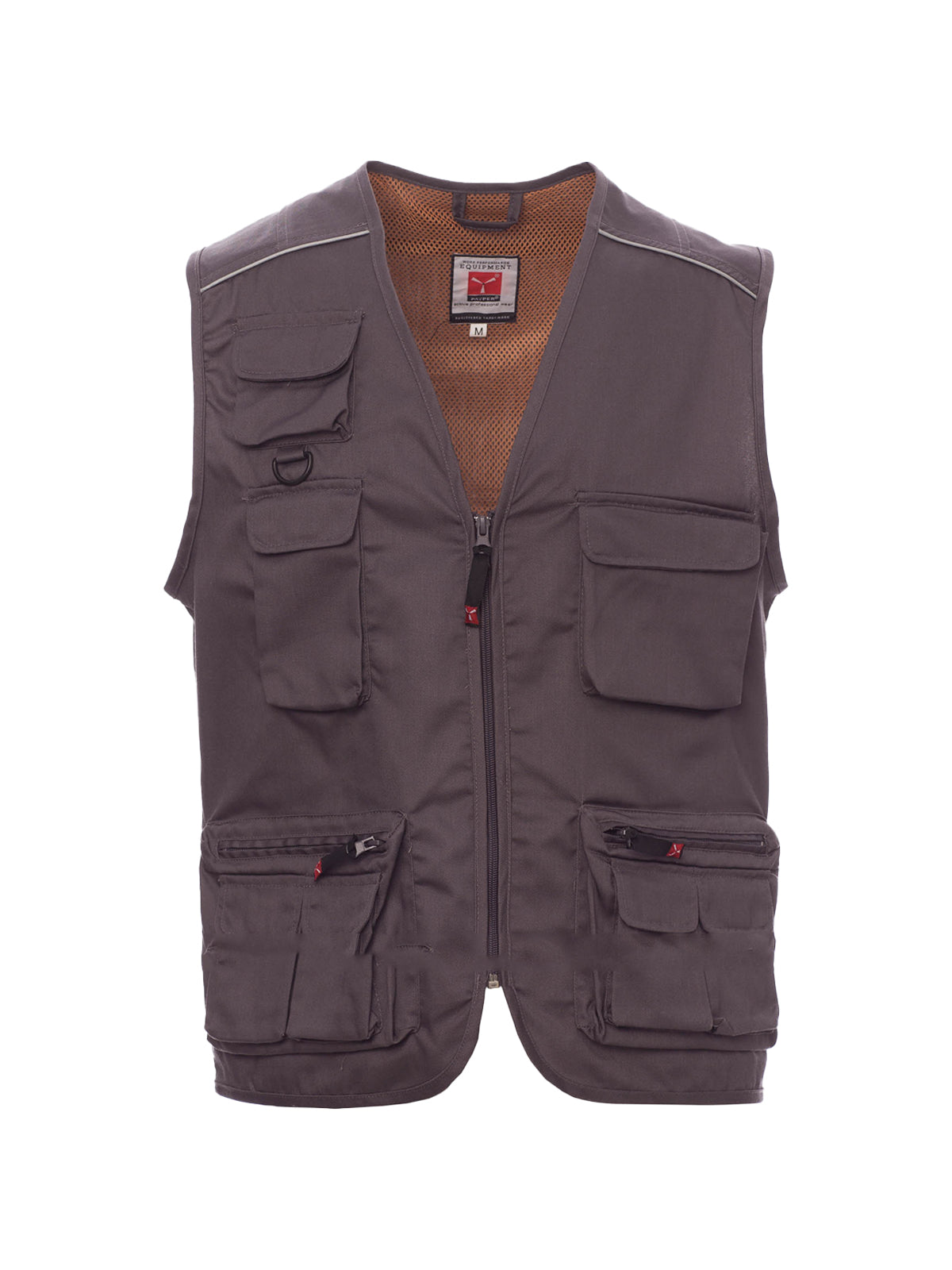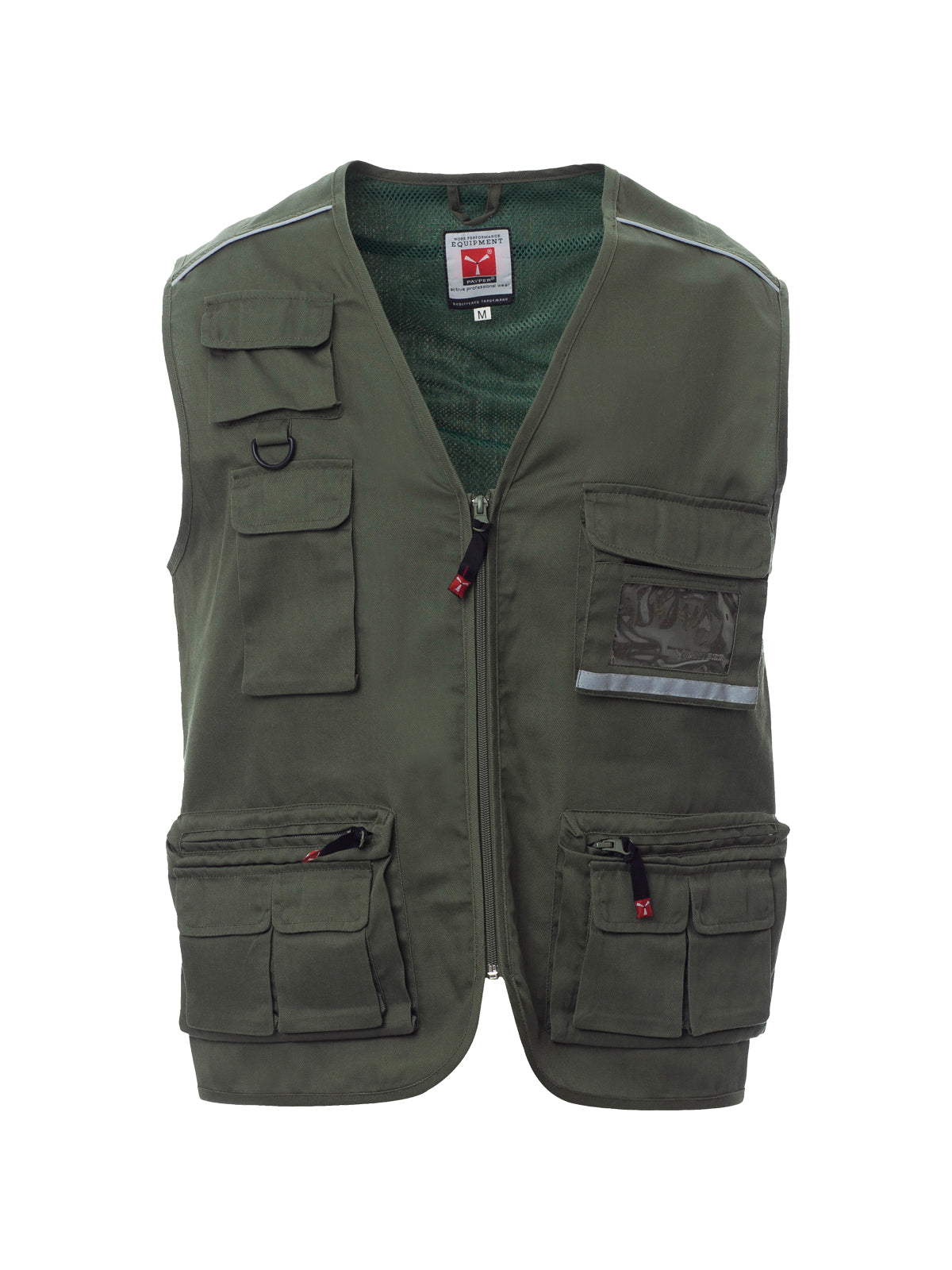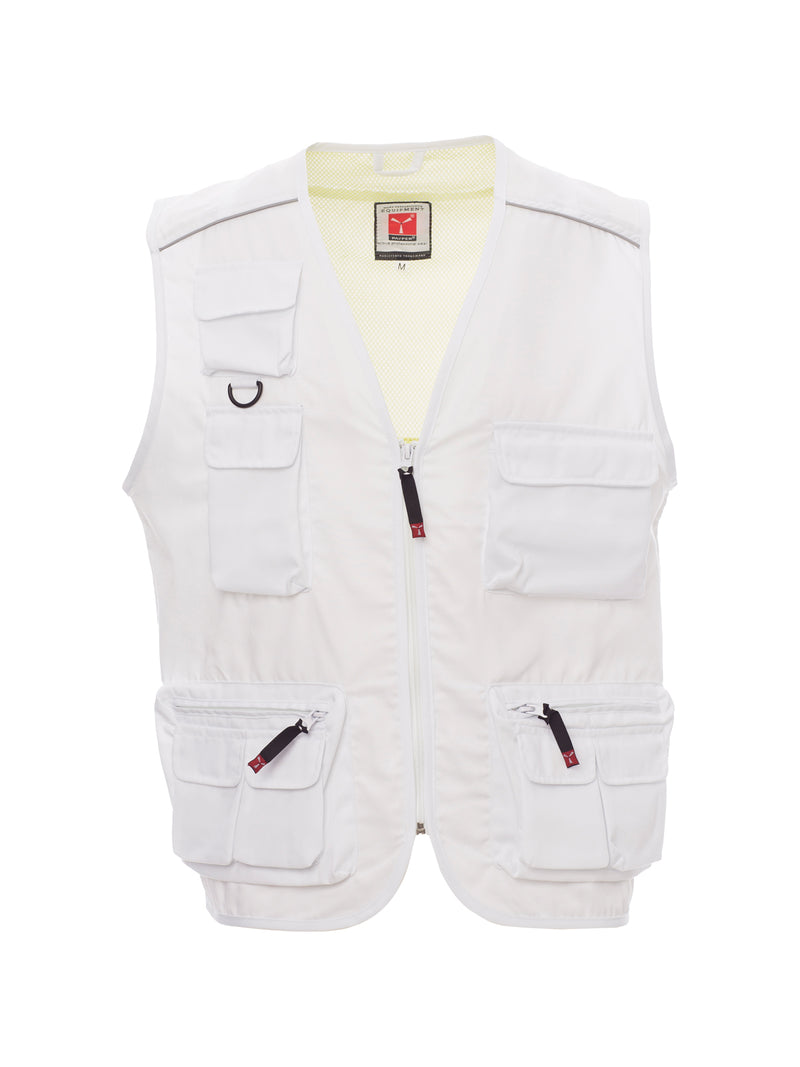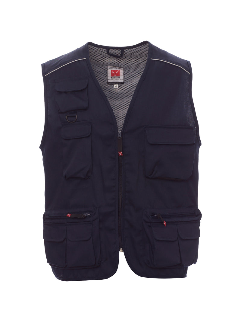 AccediGilet con zip, composizione multitasche frontale, tasca superiore sinistra con porta badge reversibile e dettaglio reflex, piping reflex alle spalle e schiena, ampia cacciatora posteriore. Interno: fodera in dry-tech, in colore a contrasto, aperta per agevolare stampe e ricami.