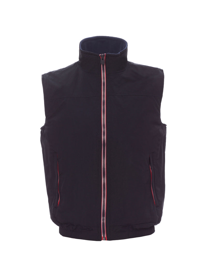 AccediGilet con zip da 8mm a contrasto, elastico in vita, due tasche esterne con zip coperta. Interno: imbottito, micropile nel colletto e nella schiena, una tasca con cerniera e predisposzione per cuffie e cavo smartphone, zip al petto e sul fondo per agevolare stampe e ricami.