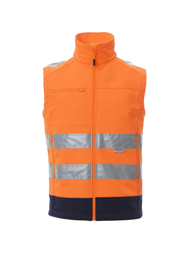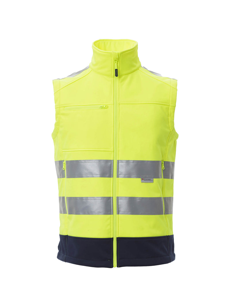 Gilet ergonomico da uomo bicolore in alta visibilità con bande 3M, zip lunga SBS nastrata, due tasche laterali con zip, una tasca al petto, porta badge staccabile e richiudibile.