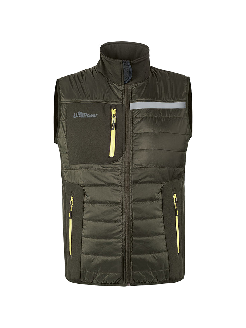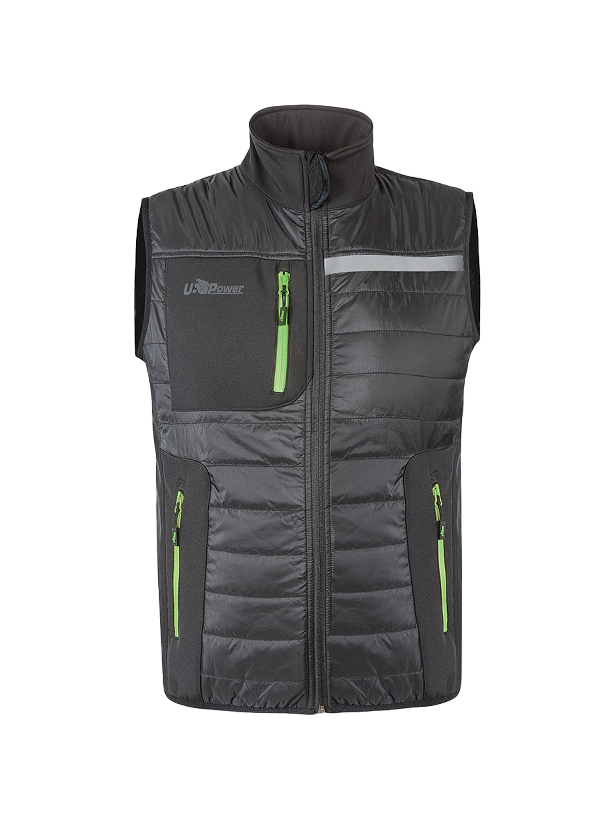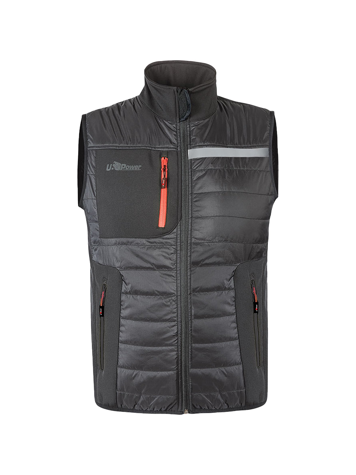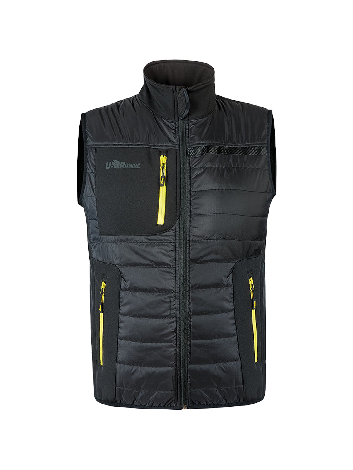 Con due tasche frontali dotate di chiusura zip, tasca verticale sul petto con cerniera e tasca interna con chiusura a velcro. Fondo e giro maniche in tessuto elasticizzato, inserti laterali in morbido Softshell elasticizzato per garantire una vestibilità ottimale e comodità.