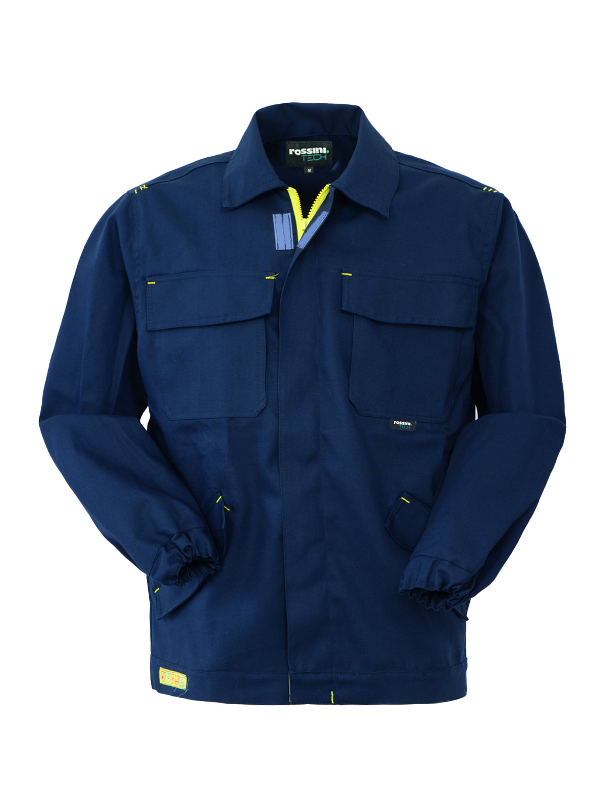 Etichetta jacquard con pittogrammi cucita, polsini a fondo manica con elastico, carré posteriore, travette varie di colore giallo.