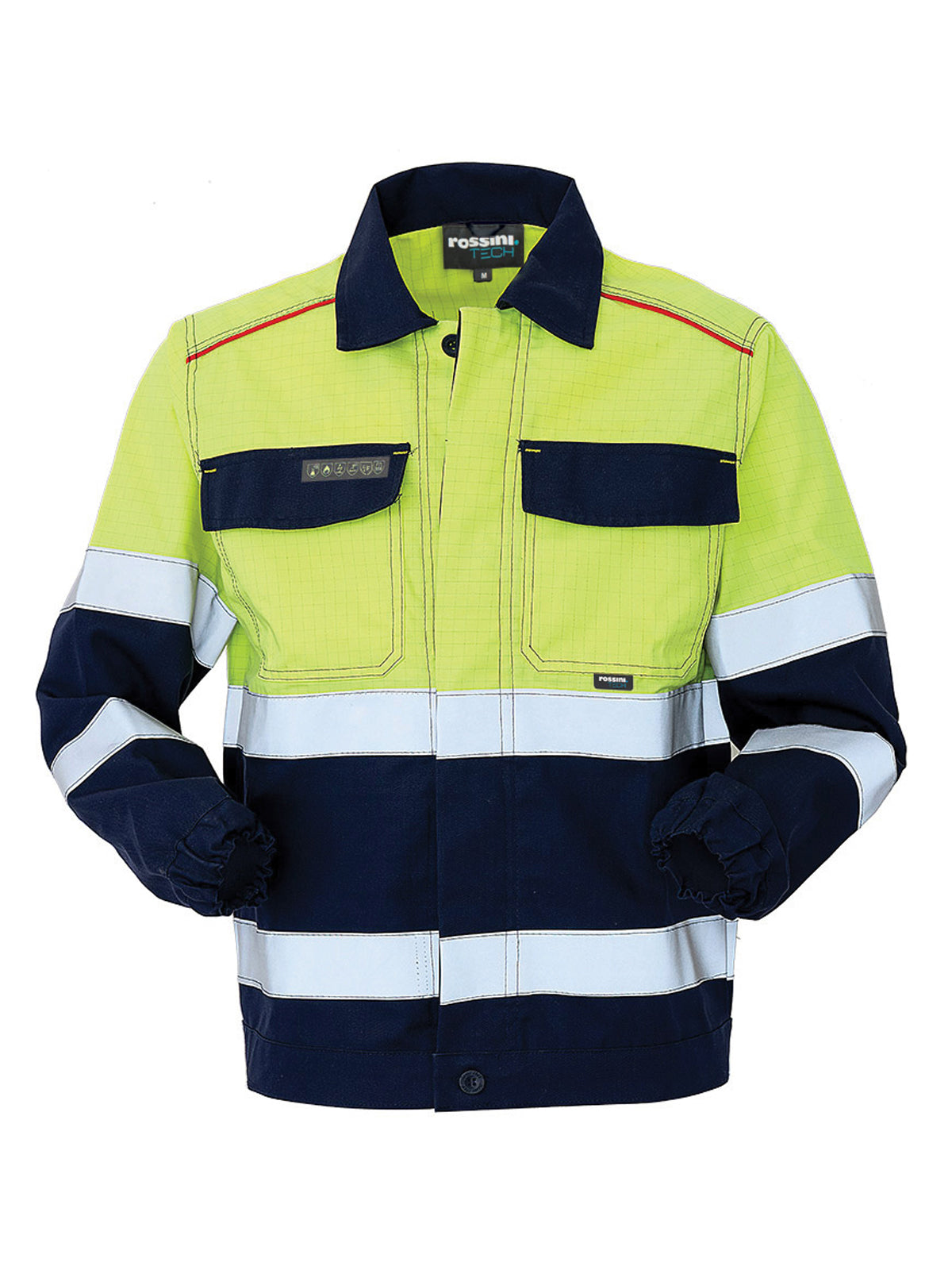 Travette varie di colore giallo, etichetta jacquard con pittogrammi cucita su taschino petto destro, due strisce rifrangenti.