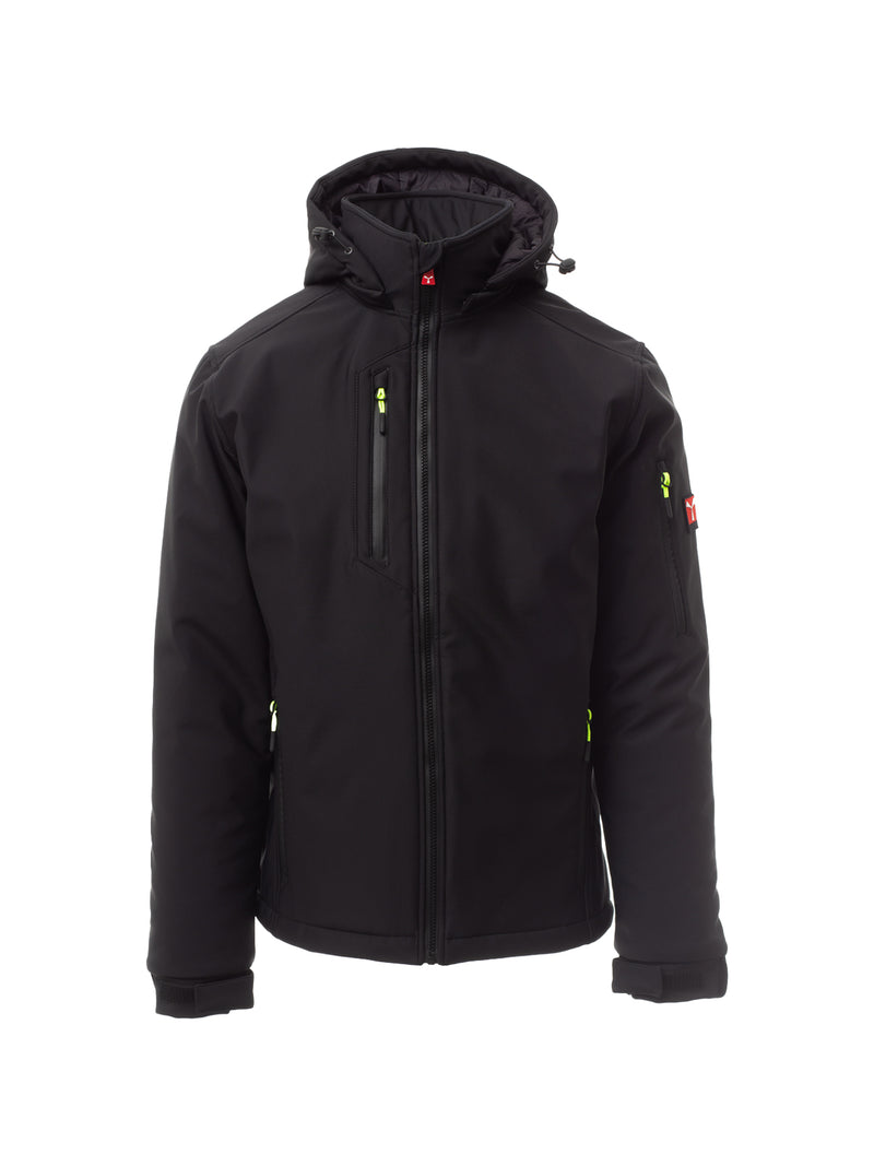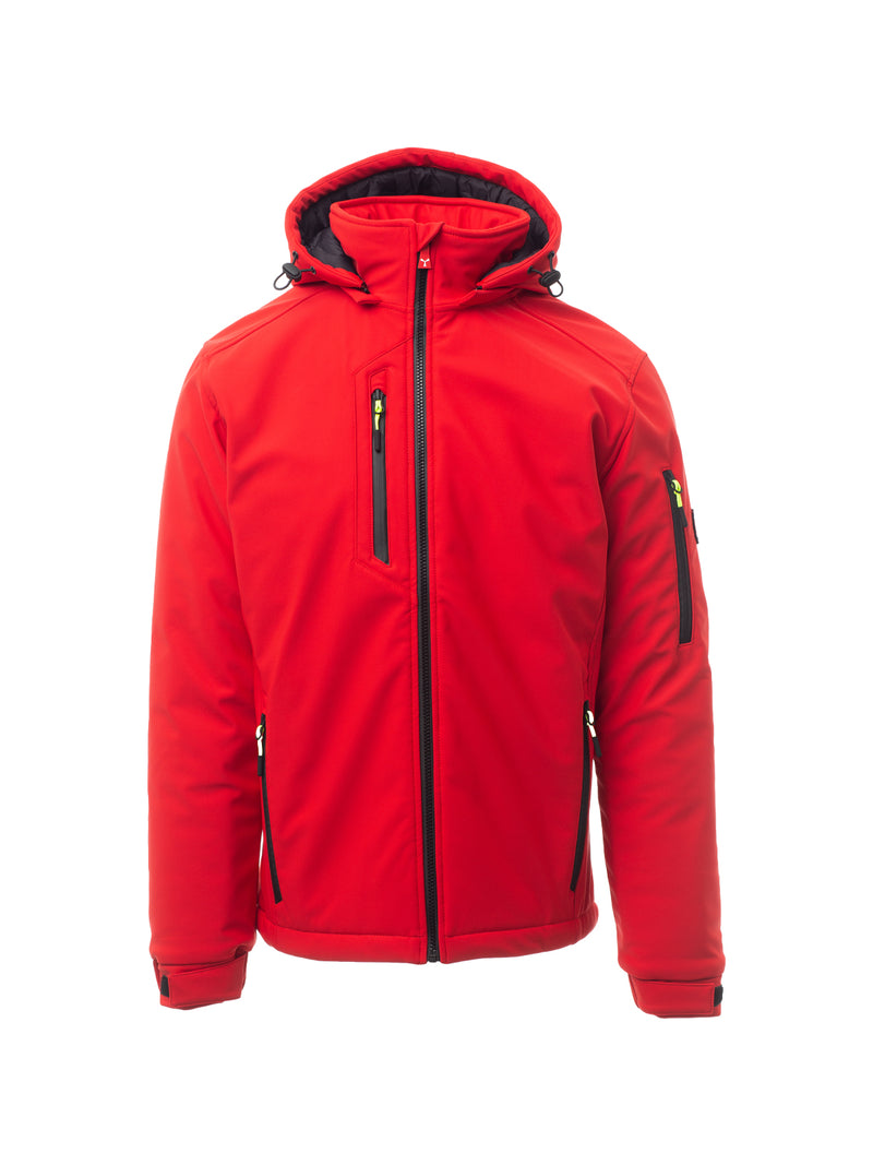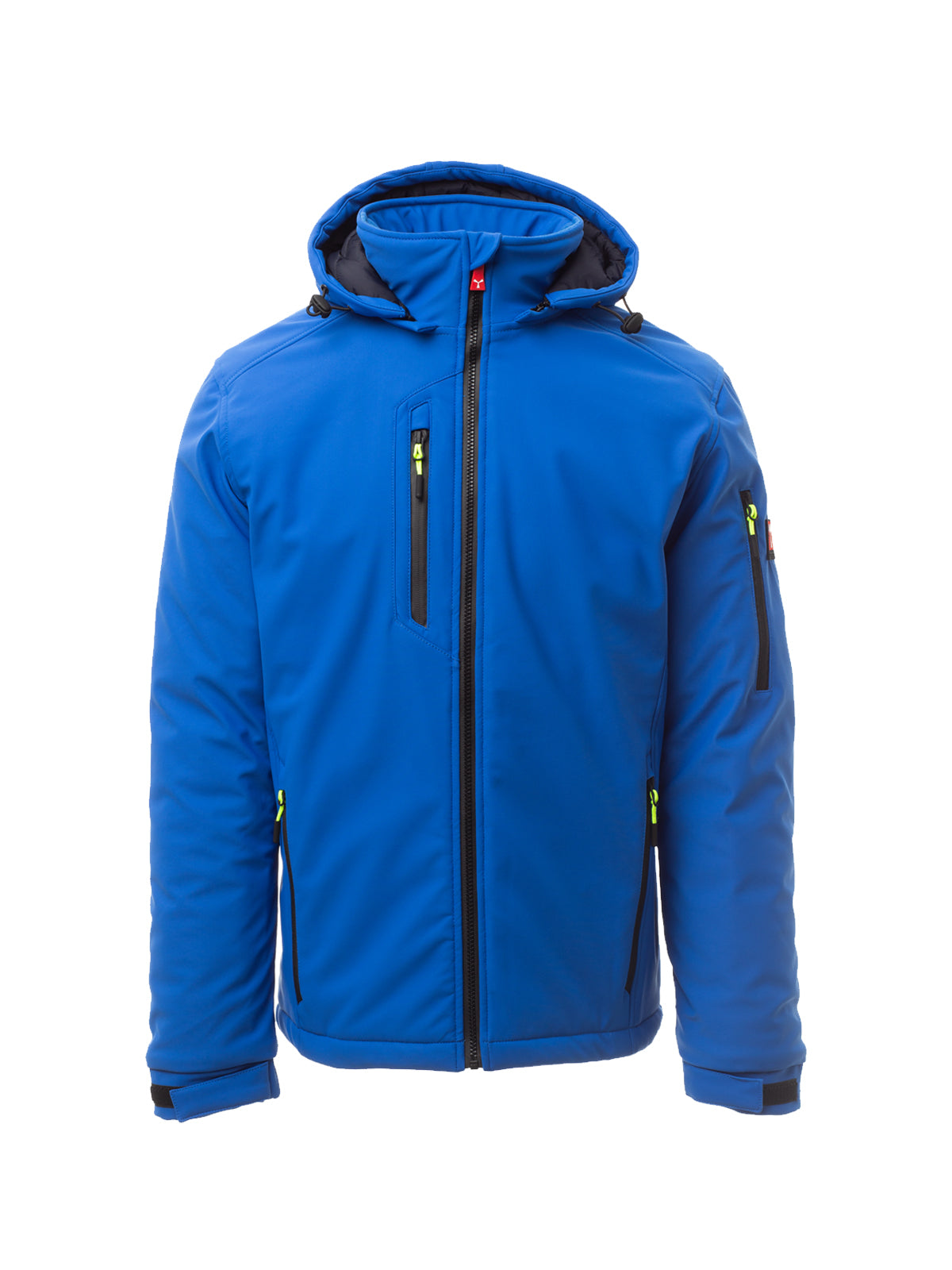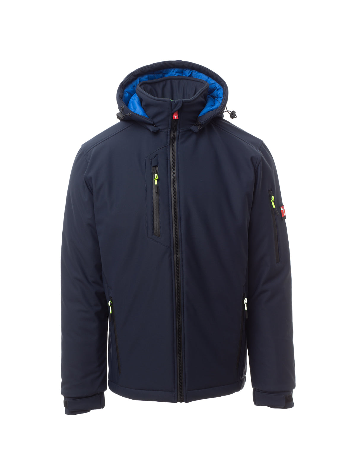 Soft-shell imbottito con chiusura tramite zip SBS con cursore in metallo "semi-auto lock" e tiretto personalizzato. Cappuccio removibile, con coulisse regolabile. Colletto interno con dettagli laterali in pile. Bande retroriflettenti su fondoschiena e retro cappuccio. Polsini elasticizzati, regolabili con velcro. Due tasche laterali con zip, una tasca al petto con zip spalmata e una tasca sul braccio sinistro con porta penne integrato, chiusa con zip. Tiretti fluorescenti. Una tasca a filetto interna, chiusa con velcro. Fondo regolabile con stopper personalizzati.