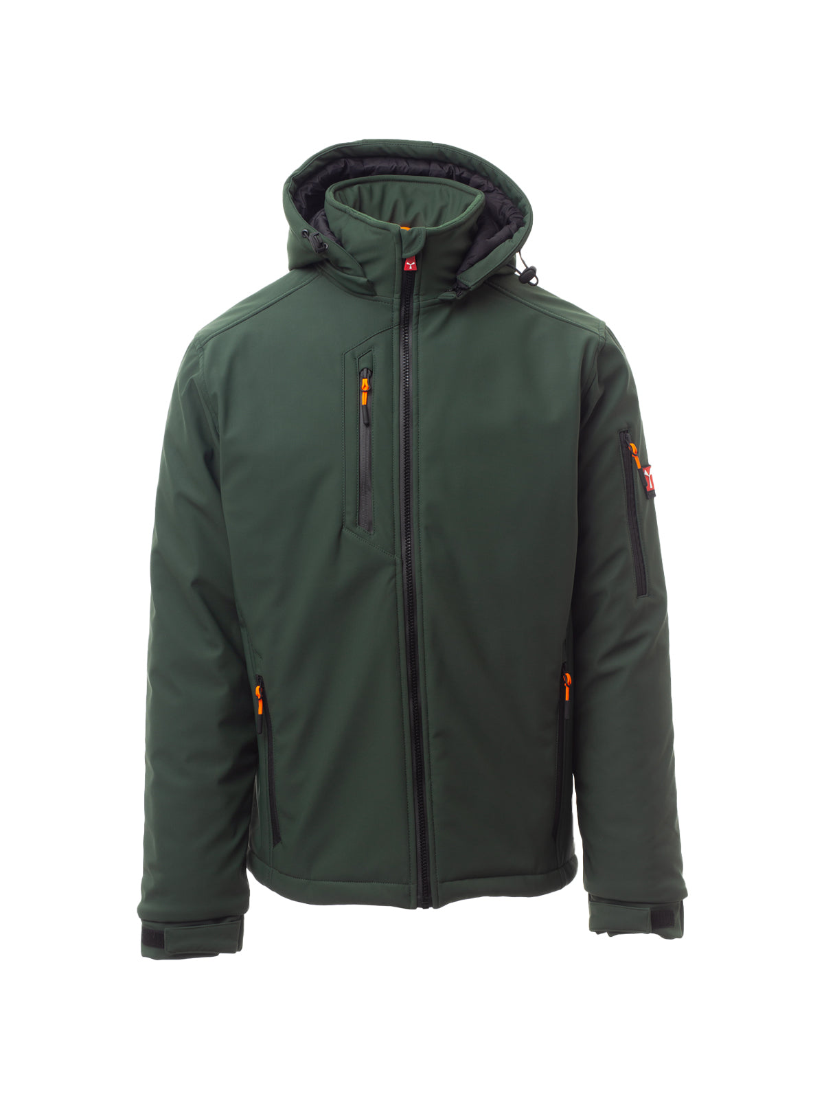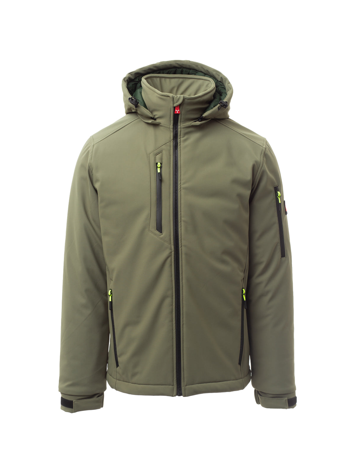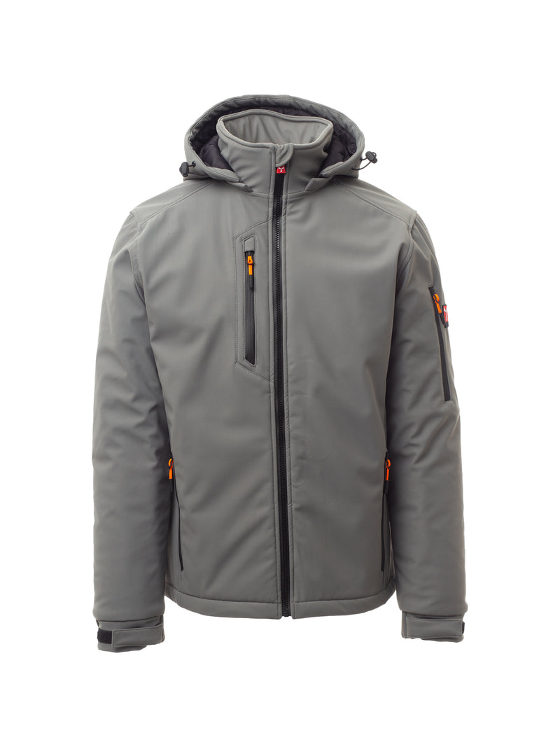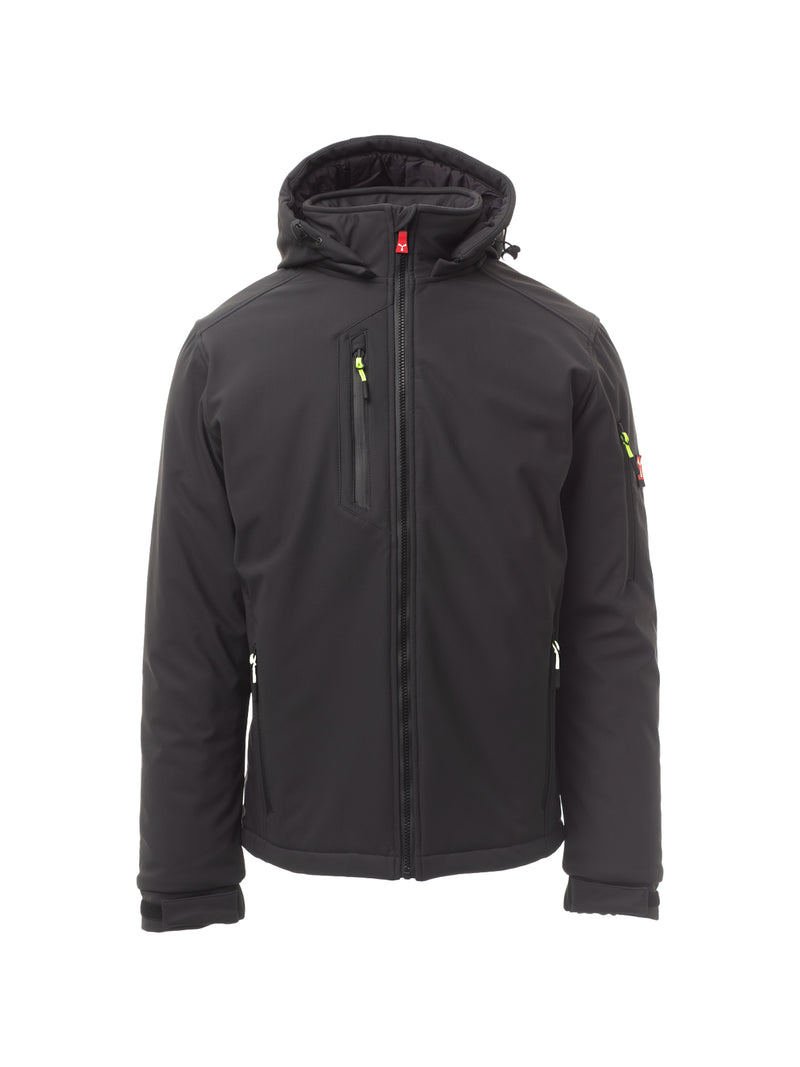Soft-shell imbottito con chiusura tramite zip SBS con cursore in metallo "semi-auto lock" e tiretto personalizzato. Cappuccio removibile, con coulisse regolabile. Colletto interno con dettagli laterali in pile. Bande retroriflettenti su fondoschiena e retro cappuccio. Polsini elasticizzati, regolabili con velcro. Due tasche laterali con zip, una tasca al petto con zip spalmata e una tasca sul braccio sinistro con porta penne integrato, chiusa con zip. Tiretti fluorescenti. Una tasca a filetto interna, chiusa con velcro. Fondo regolabile con stopper personalizzati.