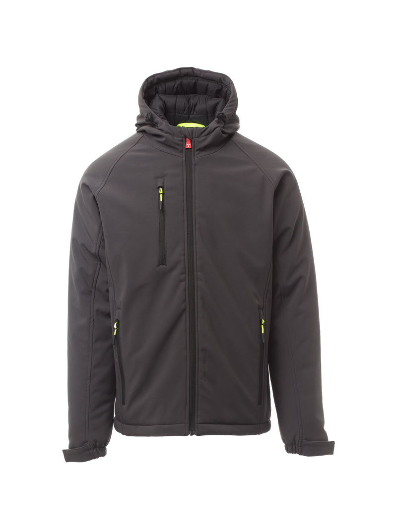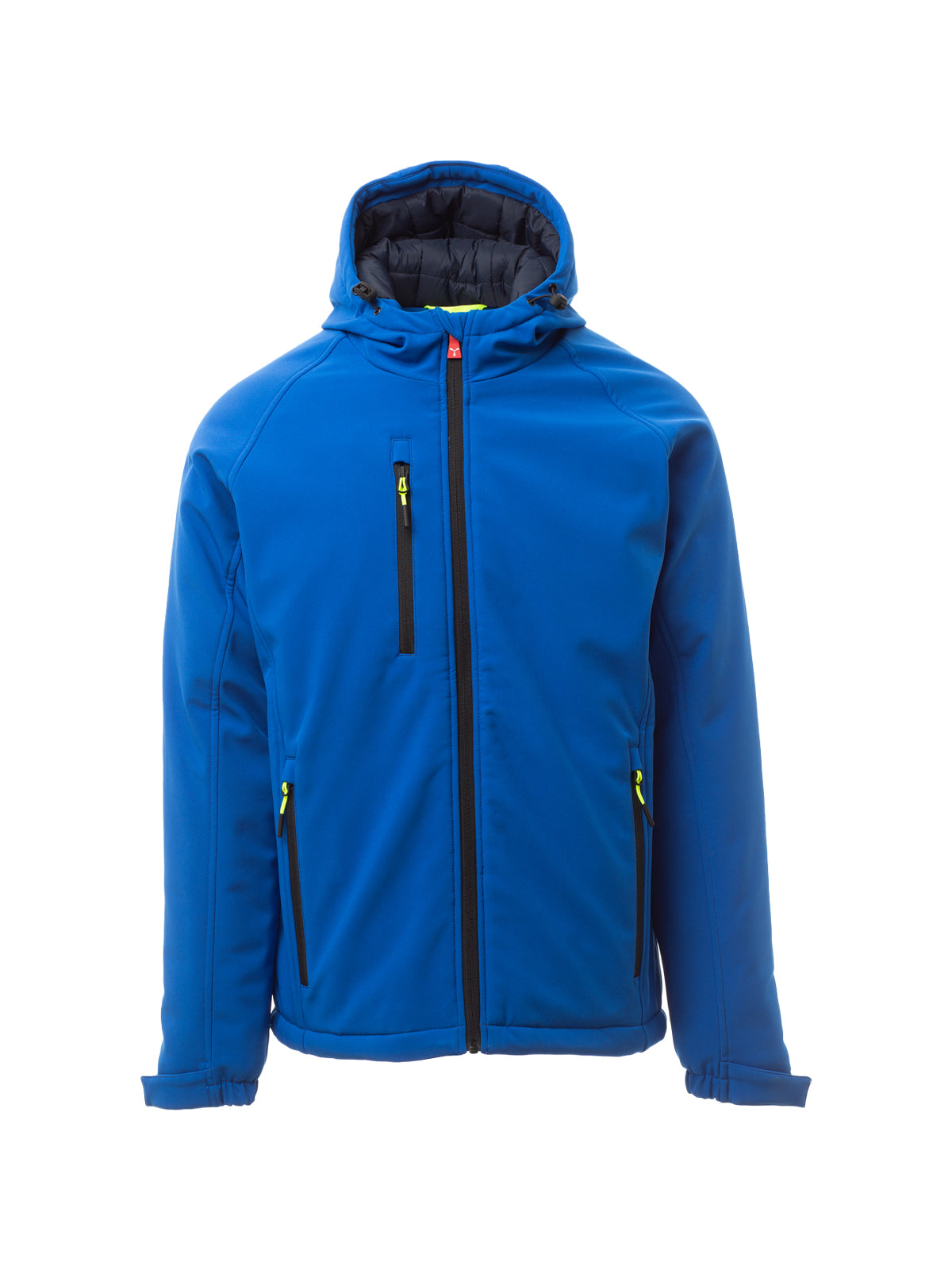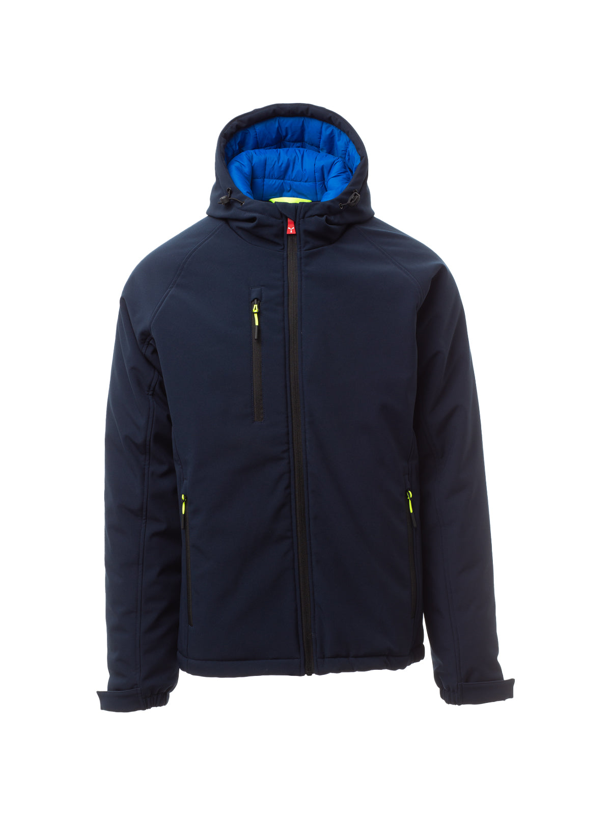 Soft-shell imbottito con chiusura tramite zip con cursore in metallo "semi-auto lock" e tiretto personalizzato. Cappuccio fisso con coulisse regolabile. Polsini elasticizzati, regolabili con velcro. Due tasche laterali e una tasca al petto, chiuse con zip. Tiretti fluorescenti. Due tasche interne, una sagomata con zip e una porta tablet chiusa con velcro. Fondo regolabile con stopper personalizzati.