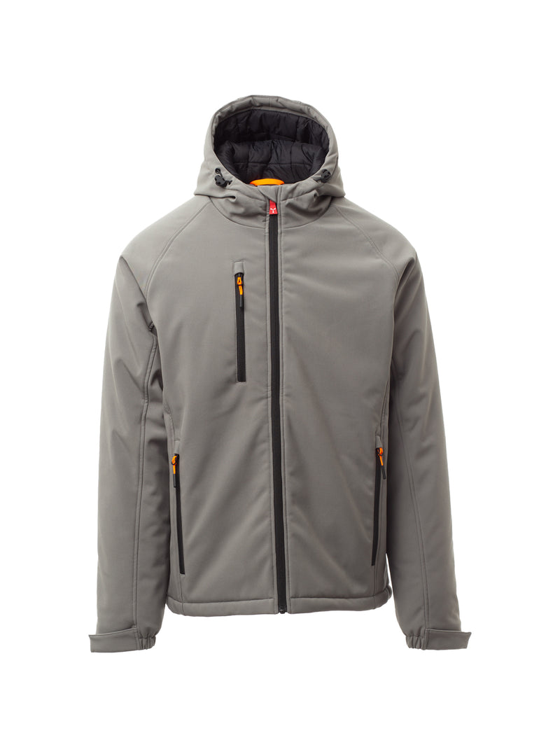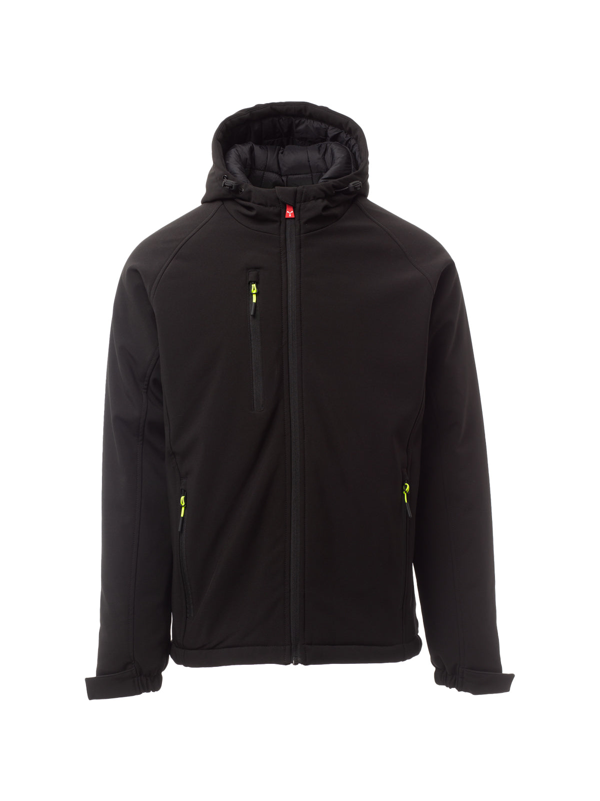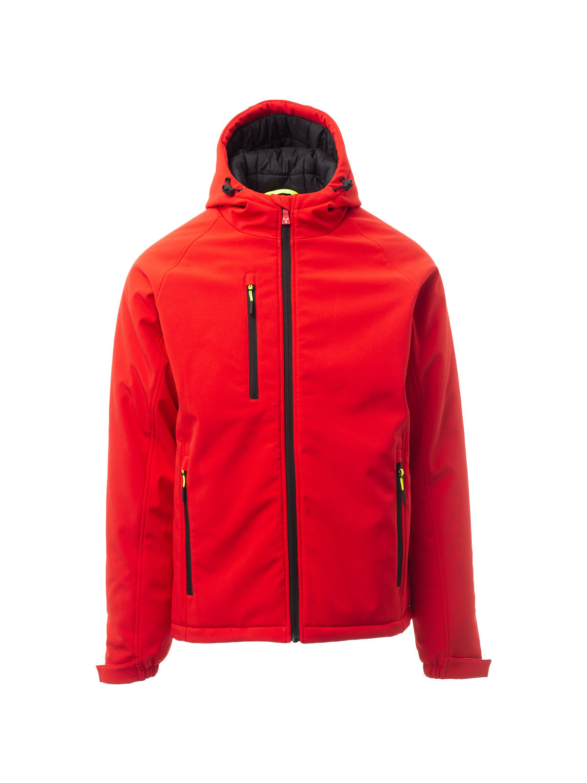 Soft-shell imbottito con chiusura tramite zip con cursore in metallo "semi-auto lock" e tiretto personalizzato. Cappuccio fisso con coulisse regolabile. Polsini elasticizzati, regolabili con velcro. Due tasche laterali e una tasca al petto, chiuse con zip. Tiretti fluorescenti. Due tasche interne, una sagomata con zip e una porta tablet chiusa con velcro. Fondo regolabile con stopper personalizzati.