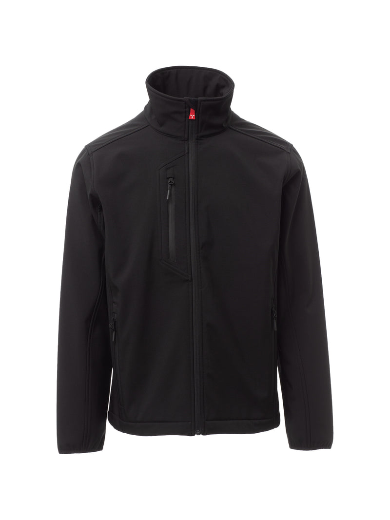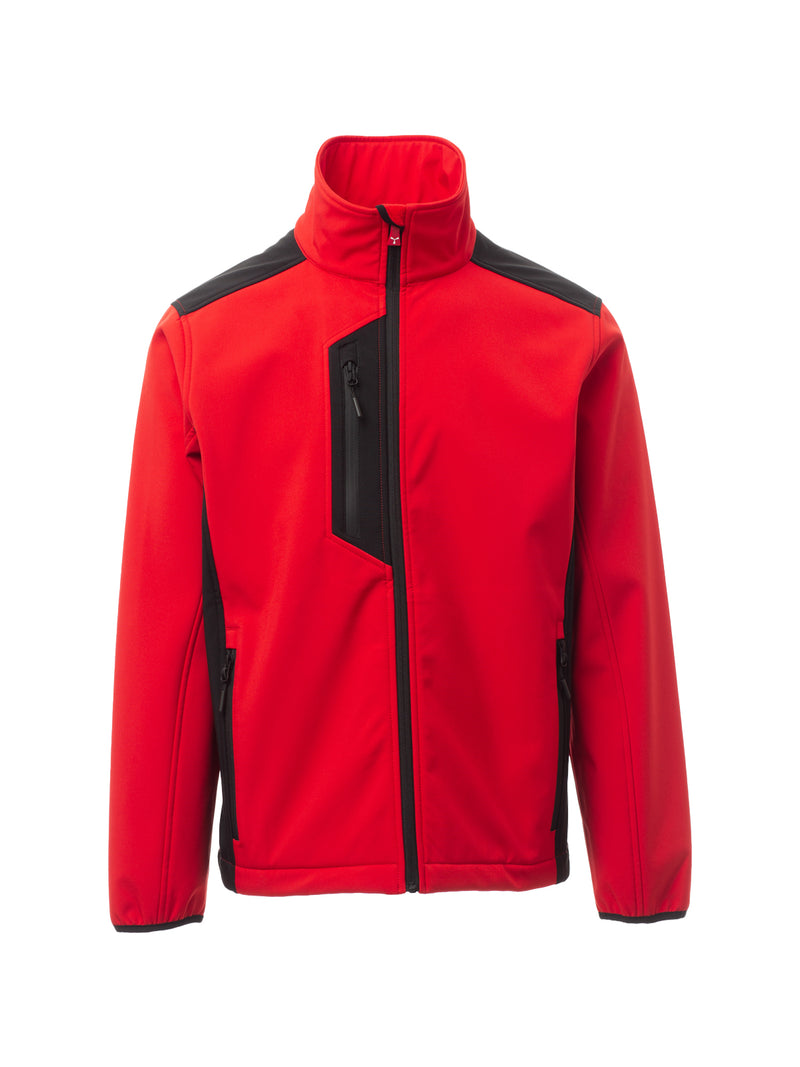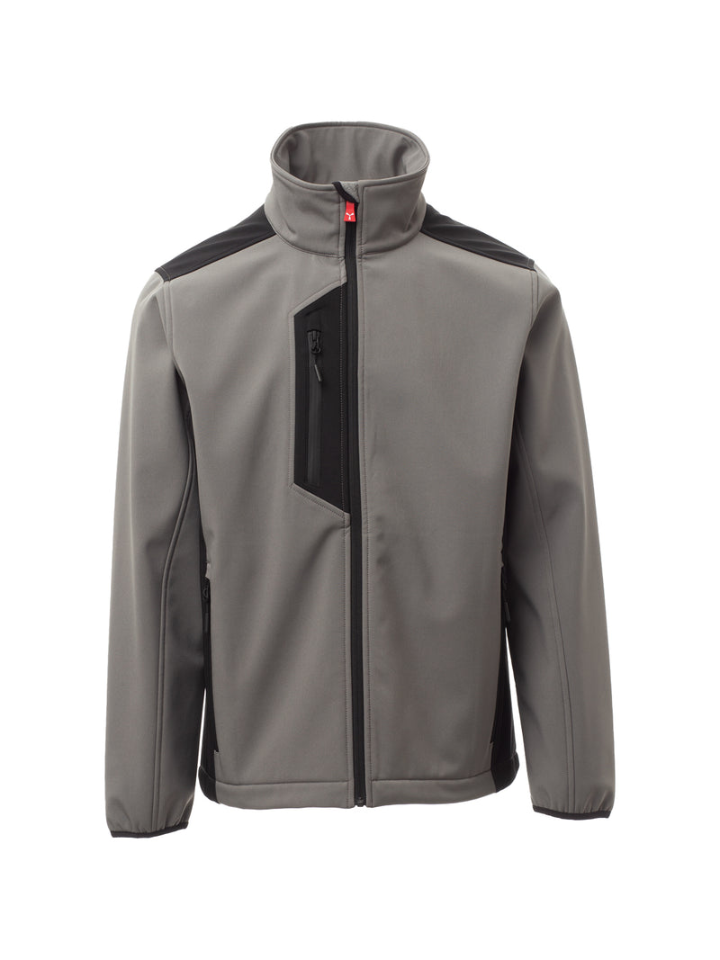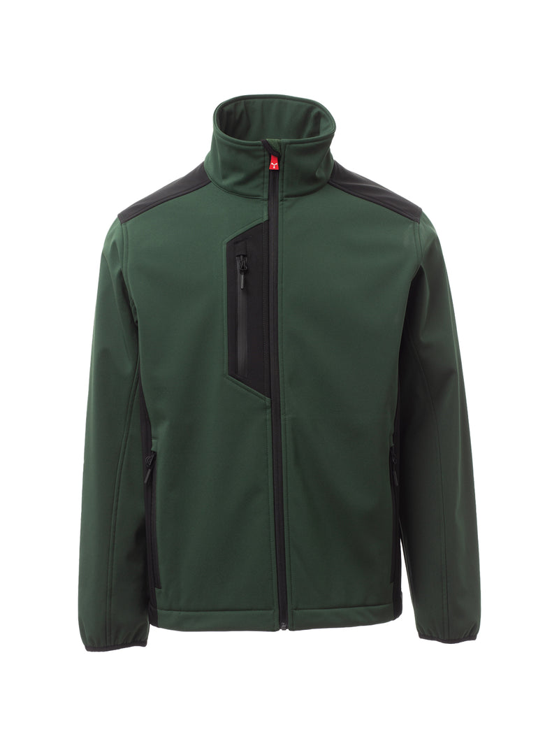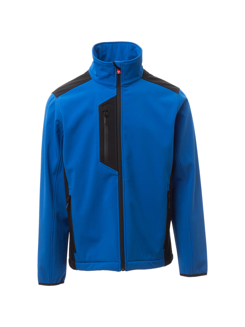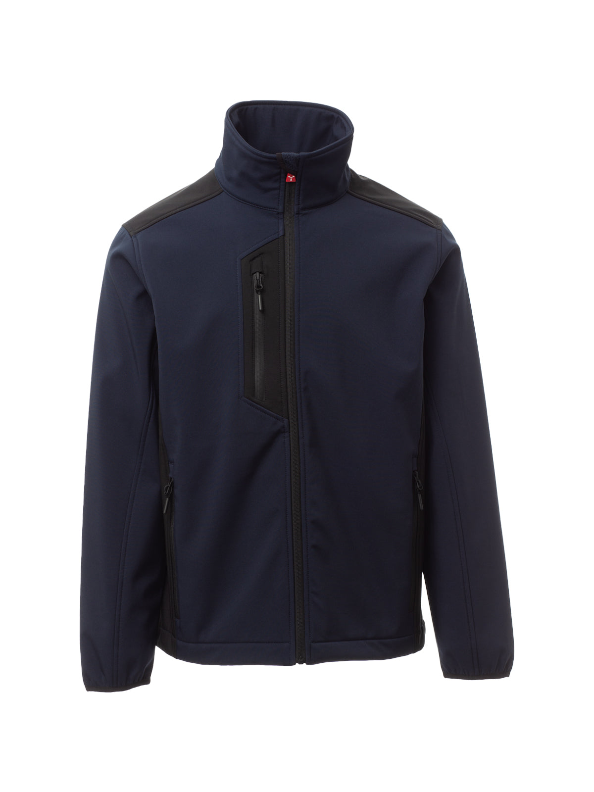 Giacca Soft-shell bicolore, chiusura tramite zip, con cursore in metallo "semi-auto lock" e tiretto personalizzato. Due tasche laterali con zip, una tasca al petto con zip spalmata. Bordino elasticizzato sui polsi. Dettaglio riflettente sul carré dietro. Fondo regolabile con stopper personalizzati.