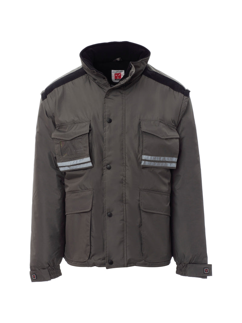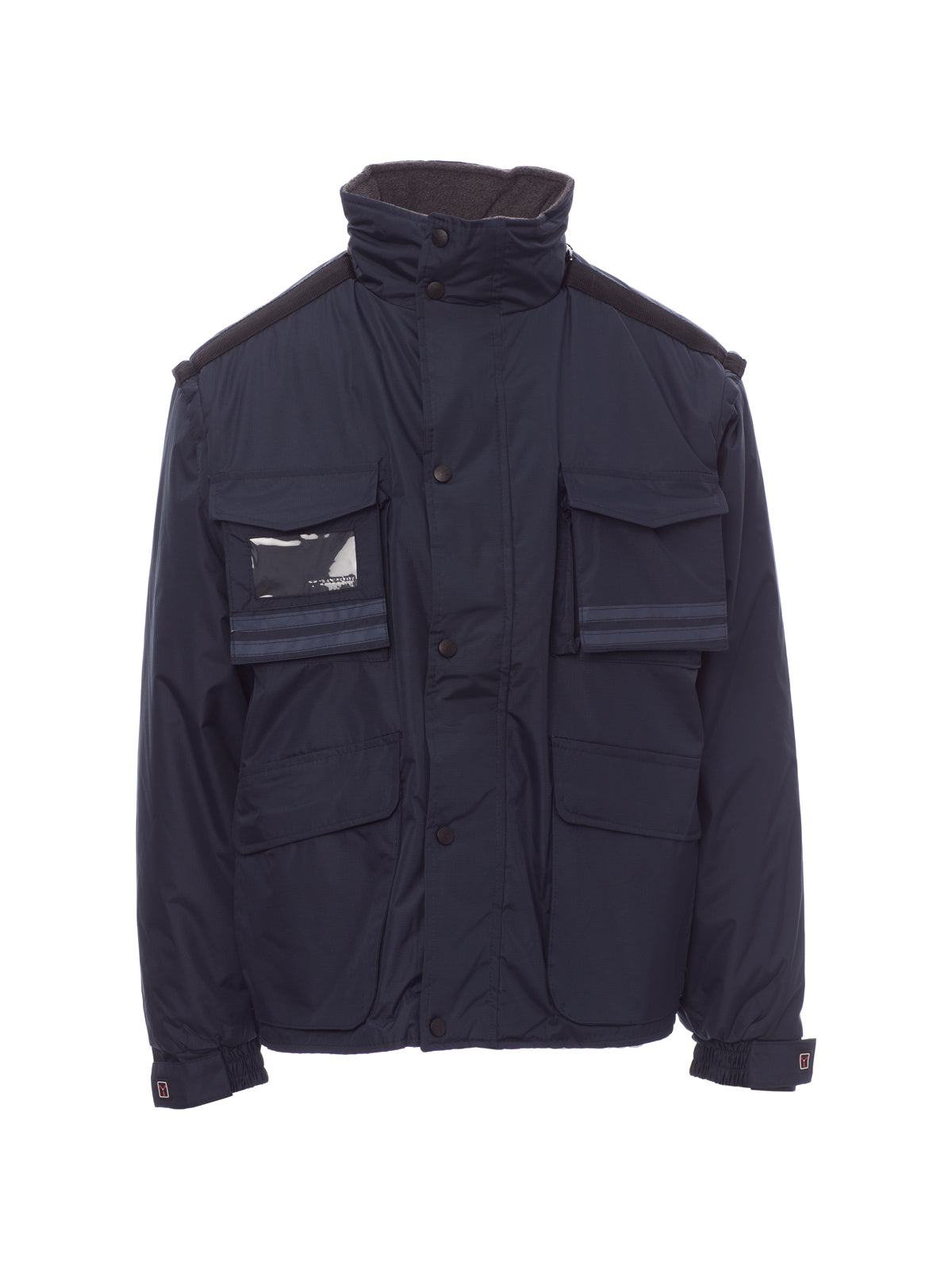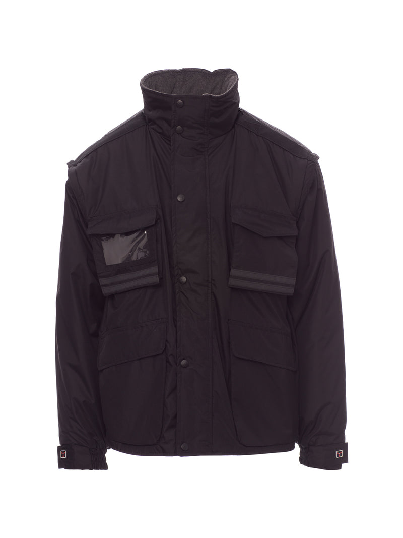 AccediGiubbotto con maniche staccabili, con pinces cucite e ribattute al loro interno. Zip da 5mm in plastica con cursore in metallo con patta e bottoni in plastica, cappuccio richiudibile nel colletto, polsini regolabili, bande riflettenti in tinta fronte e retro, spacchetto laterale con soffietto e zip. Cinque tasche esterne di cui una porta badge reversibile. Interno imbottito, colletto schiena e scalda reni in micropile, inserti traspiranti sottobraccio, coulisse in vita e zip interna per agevolare stampe e ricami.