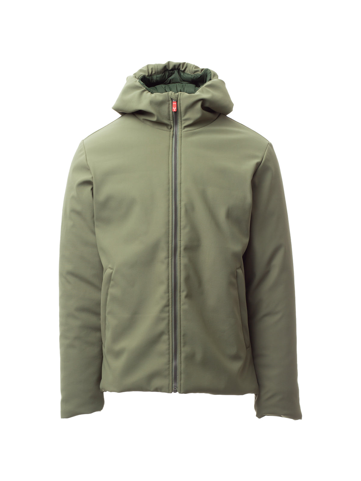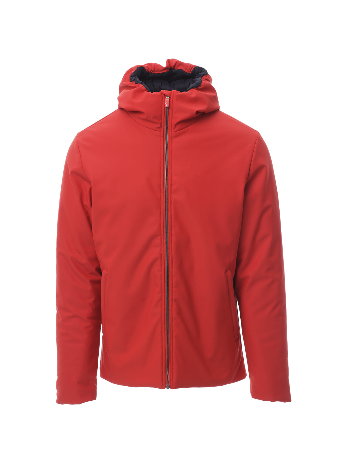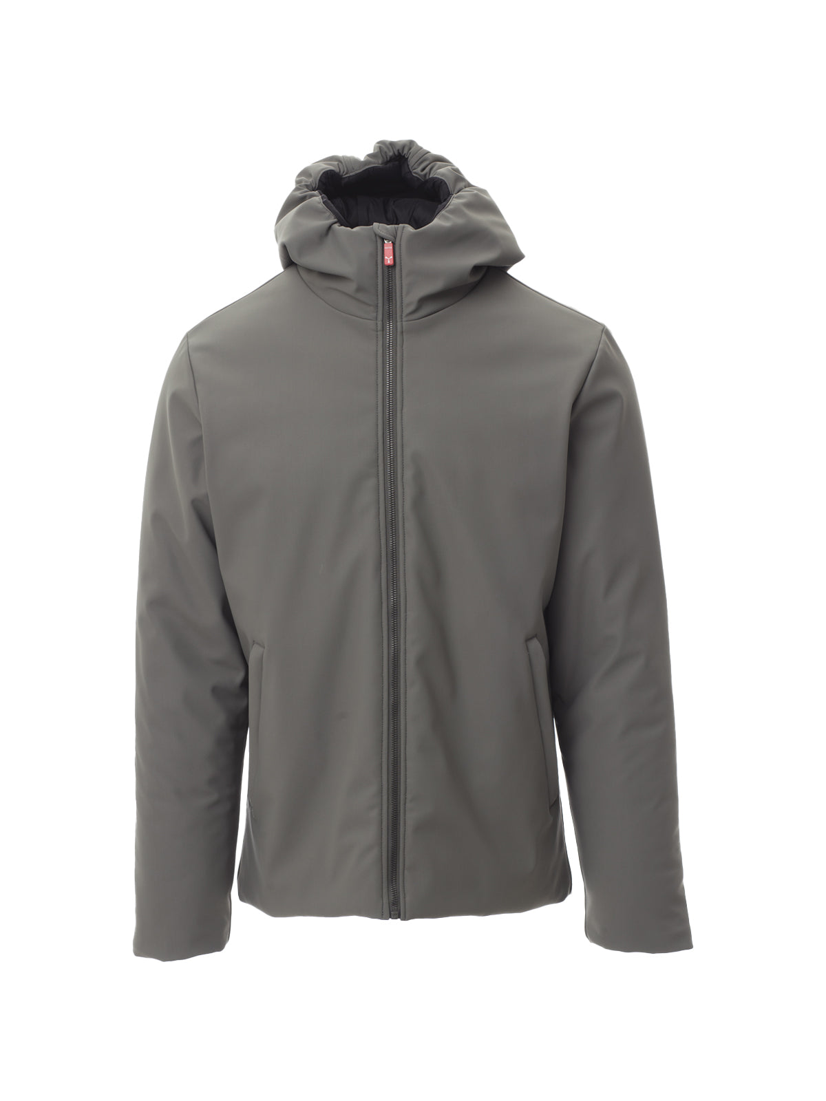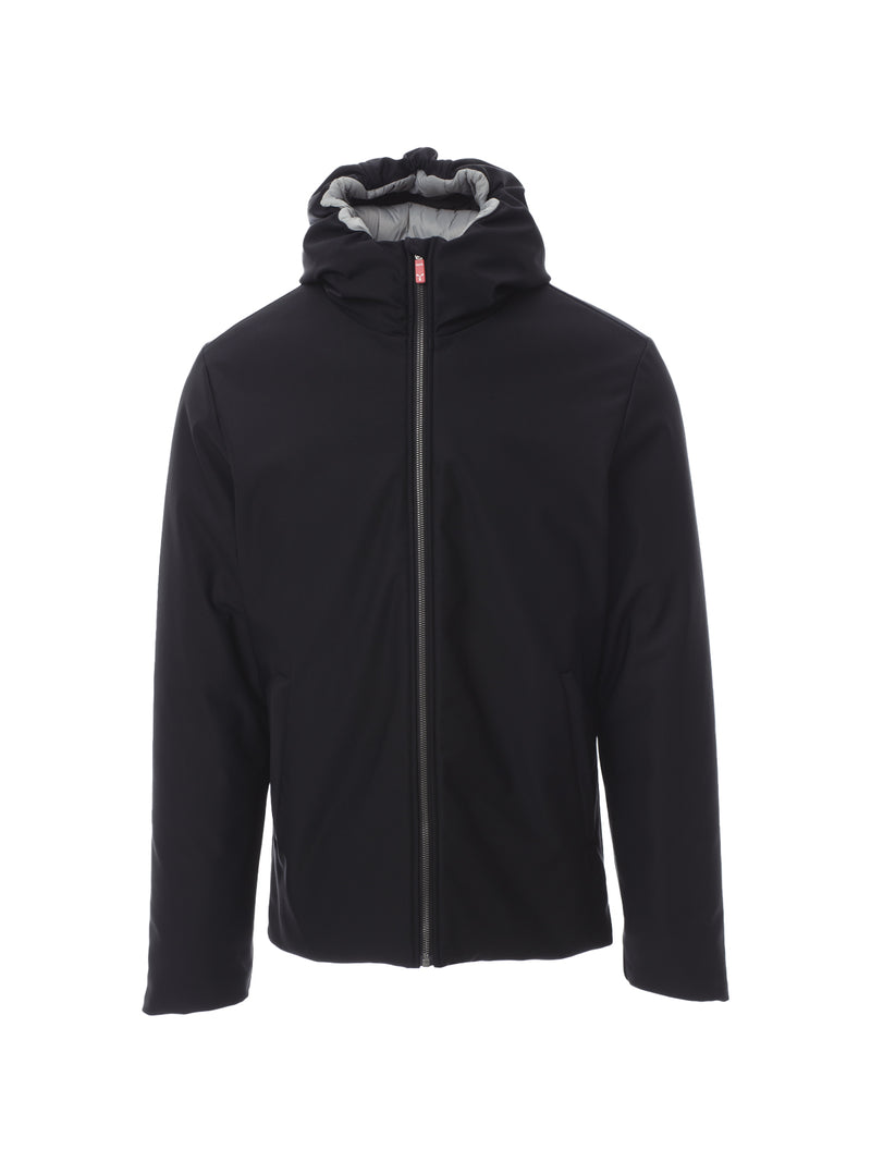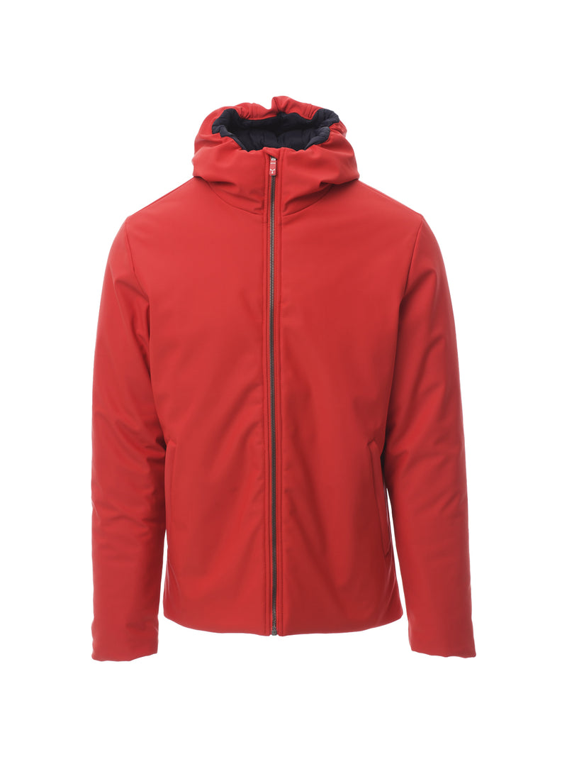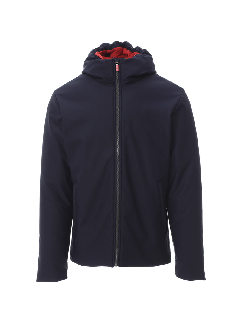 Giacca soft-shell imbottita da uomo, con cappuccio, zip intera SBS in plastica con cursore in metallo “ semi-autolock”, due tasche esterne con zip, una tasca interna con zip.