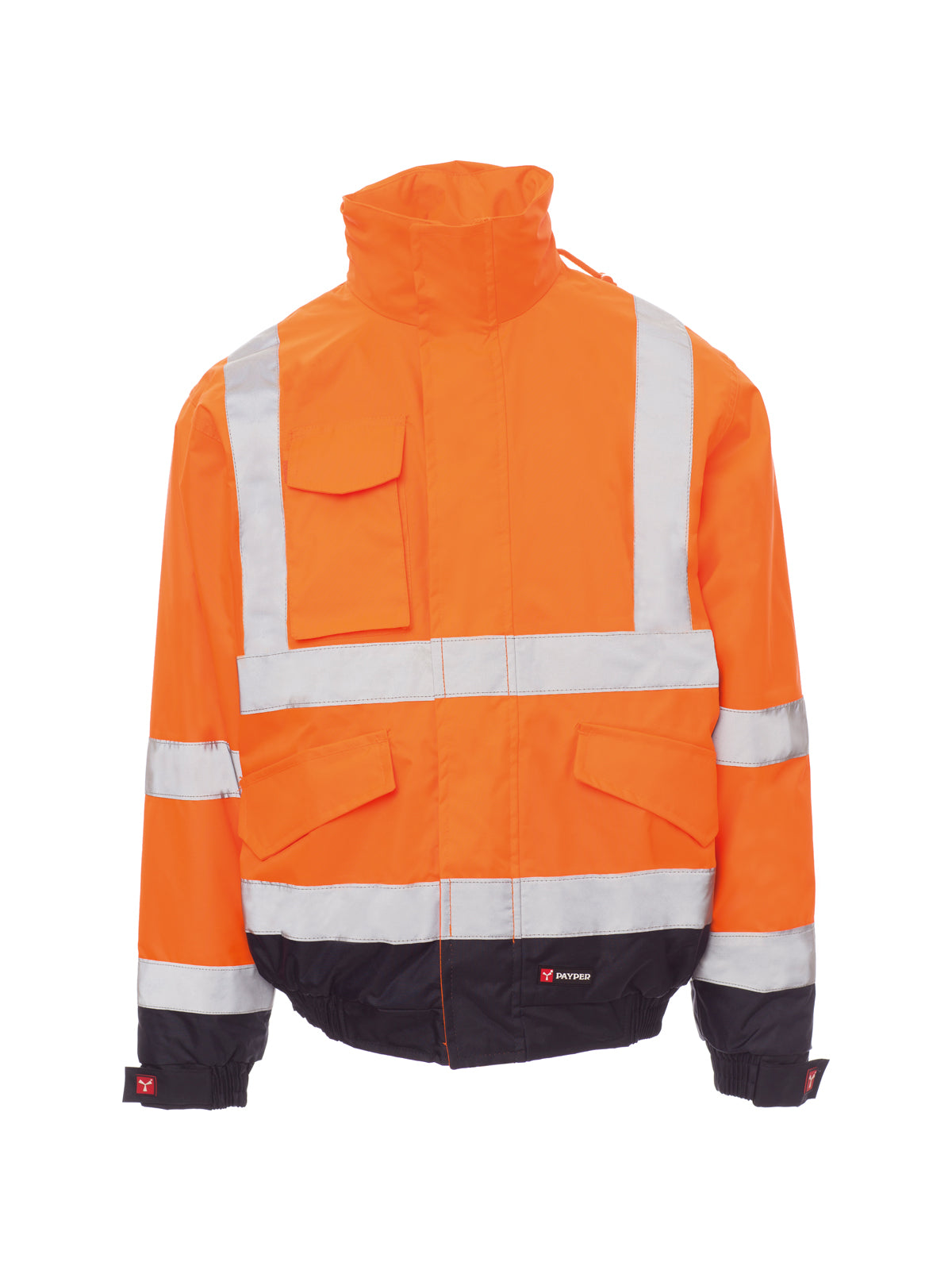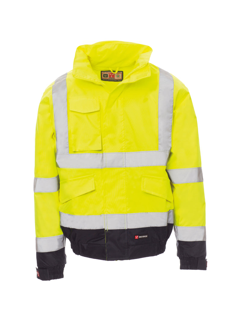 AccediGiubbotto in poliestere spalmato bicolore in alta visibilità con bande riflettenti, zip intera con patta, cappuccio richiudibile nel colletto, vita e polsini elasticizzati, due ampie tasche frontali con patta e velcro, portacellulare e anello di aggancio per porta badge. Interno: imbottito, una tasca con velcro, cuciture termonastrate