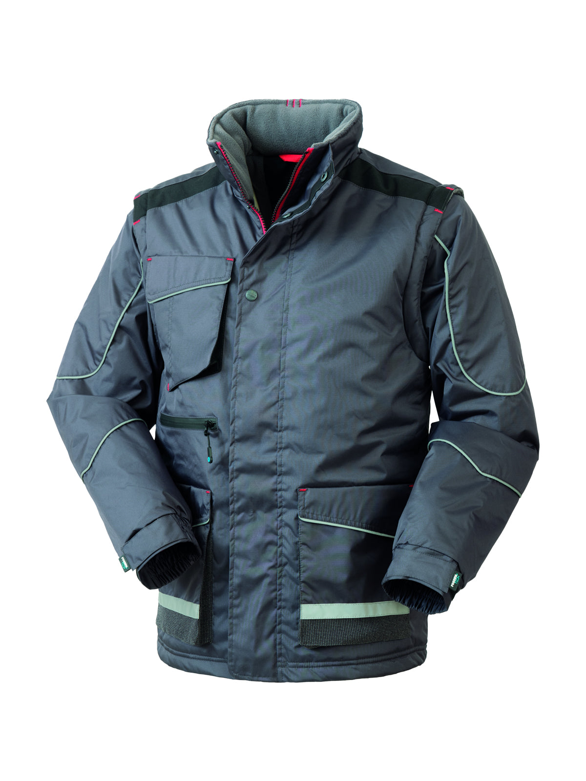 AccediGiubbotto invernale imbottito con chiusura centrale anteriore con cerniera coperta da patella chiusa con bottoni automatici, cappuccio impermeabile interno chiuso con cerniera, maniche staccabili.