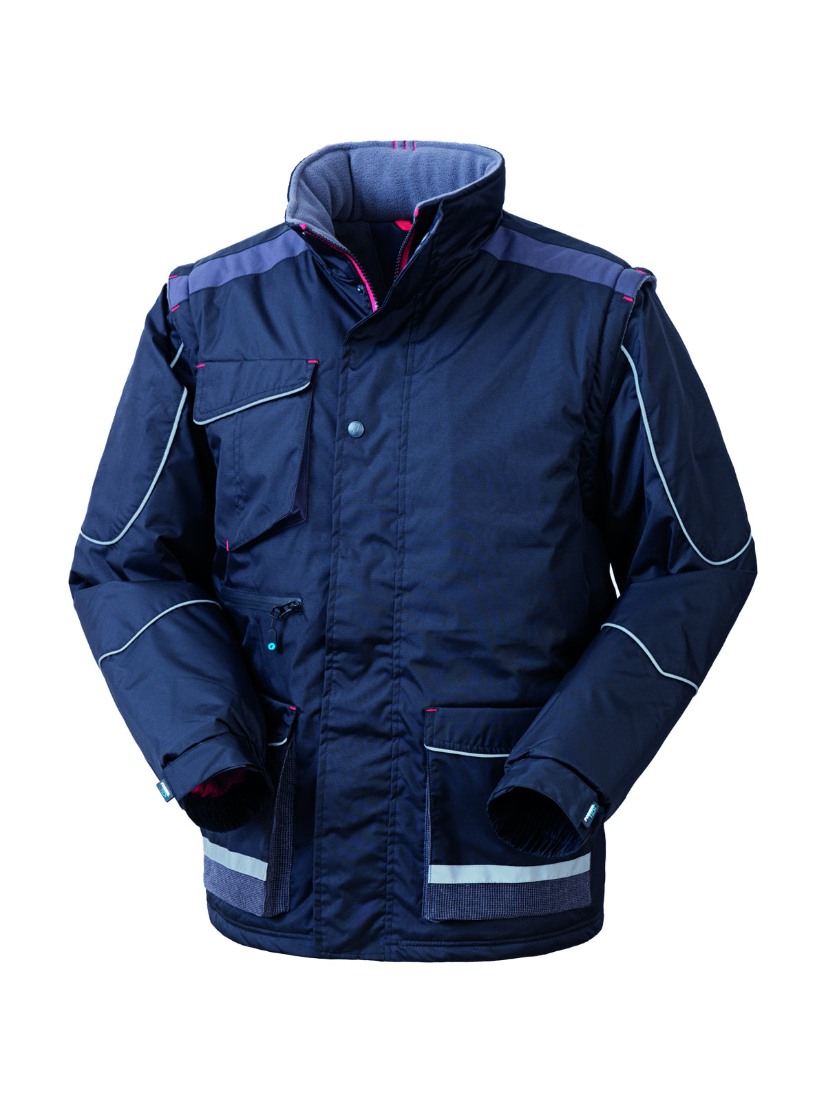 Cerniera orizzontale interna al fondo per la possibilità di personalizzazione sulla schiena, inserti di tessuto rifrangente, polsi al fondo manica con elastico e alamaro regolabile con velcro, inserti di colore a contrasto.