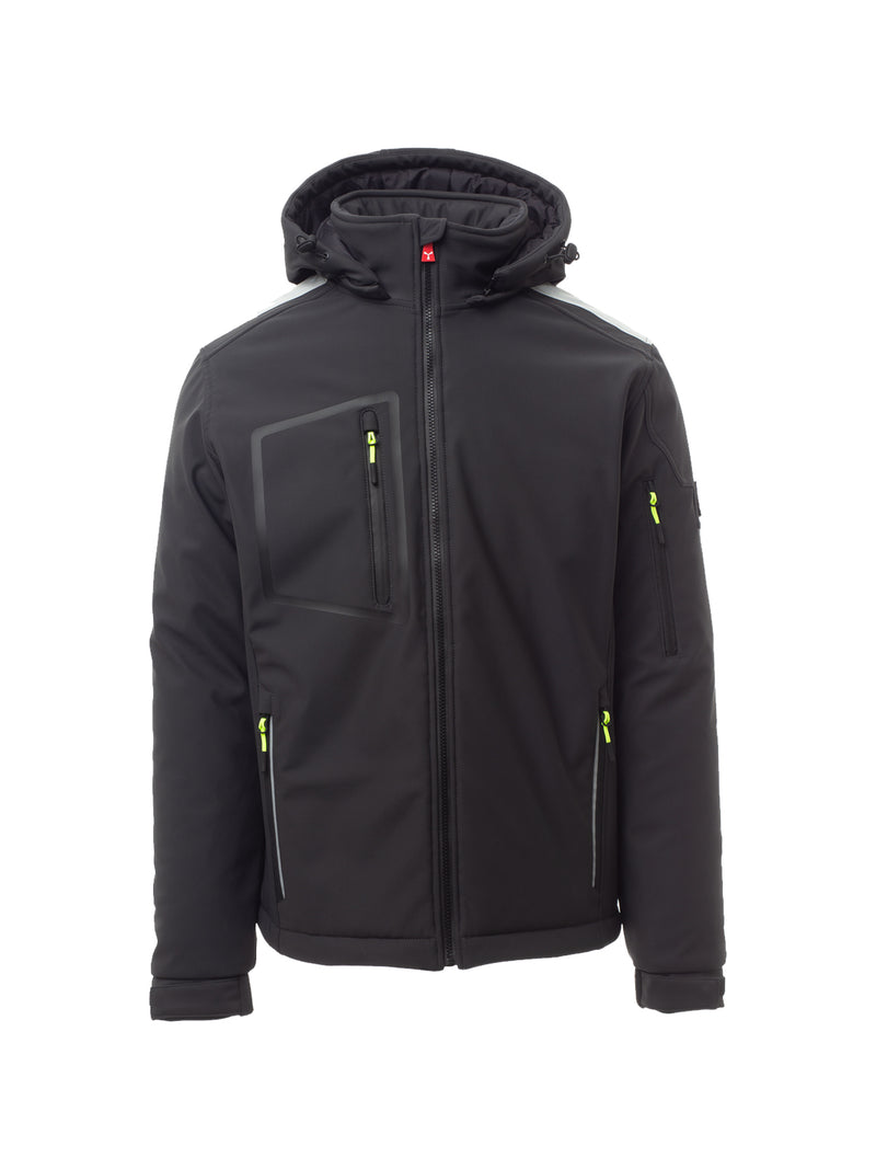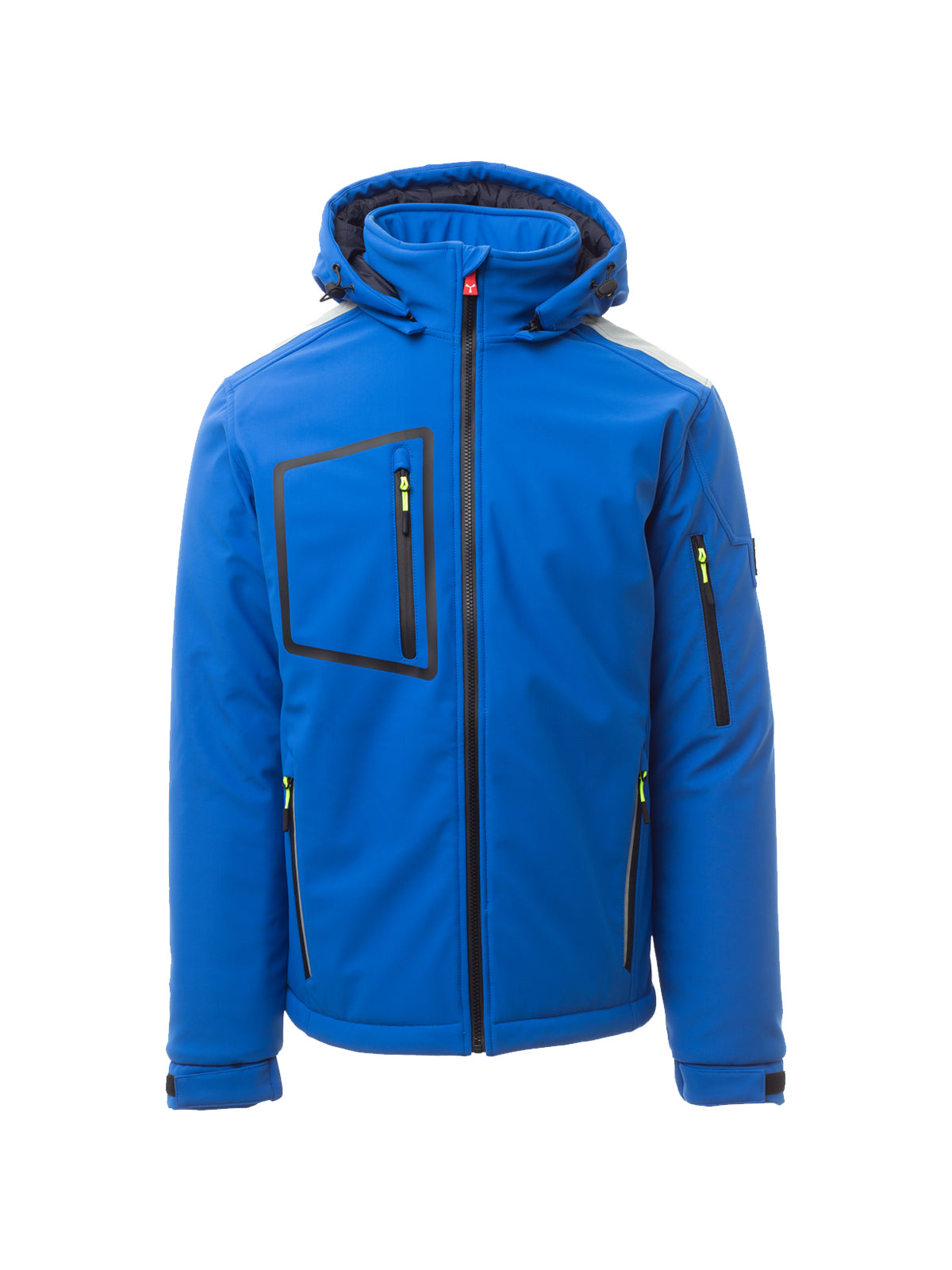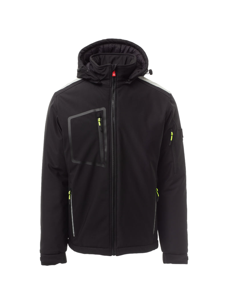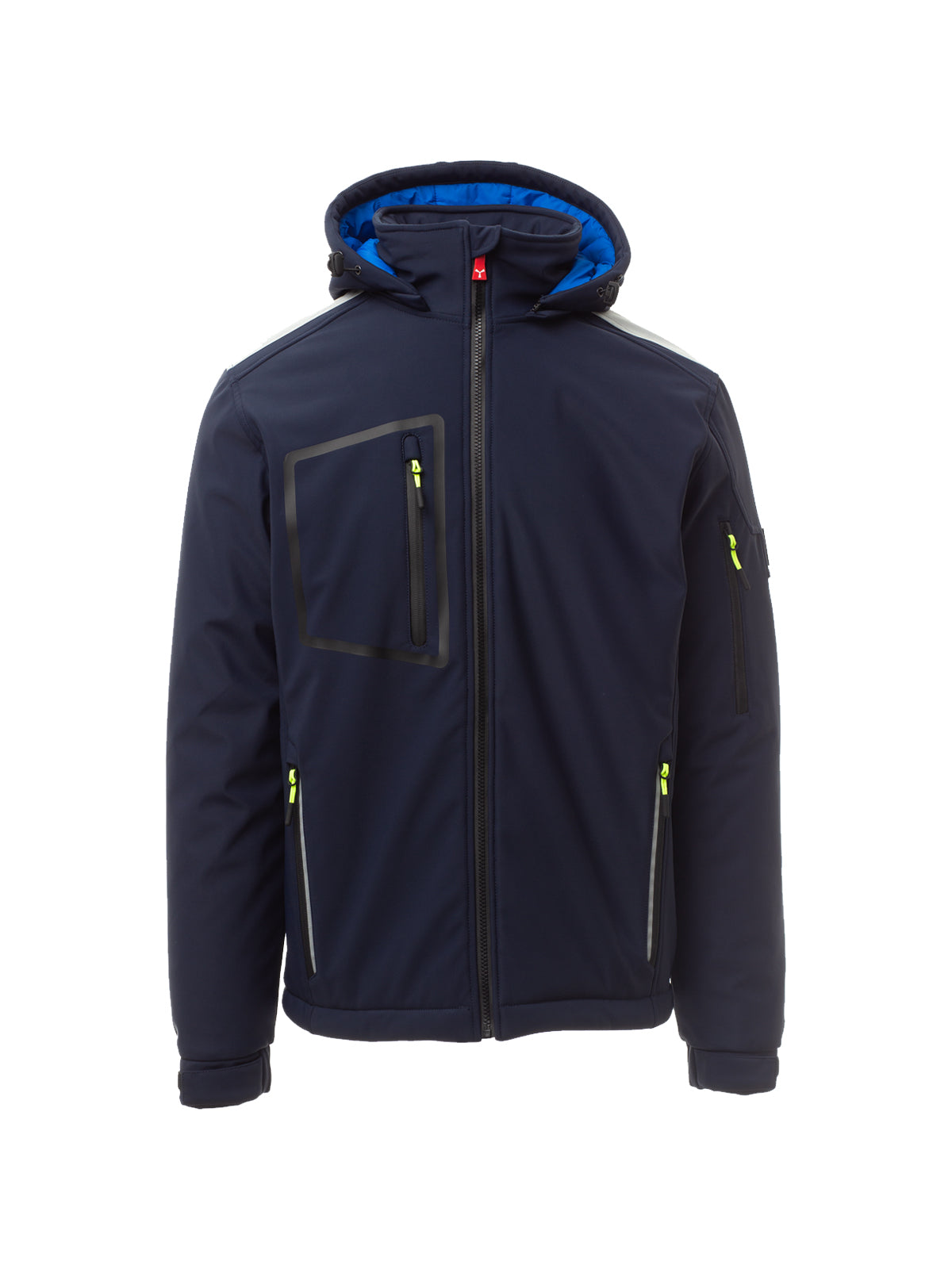 Soft-shell imbottito con chiusura tramite zip SBS con cursore in metallo "semi-auto lock" e tiretto personalizzato. Cappuccio removibile, con coulisse regolabile. Colletto interno con dettagli laterali in pile. Bande retroriflettente su spalle, fondoschiena e retro cappuccio. Polsini elasticizzati, regolabili con velcro e manicotto interno. Tasca termosaldata sul petto, chiusa con zip spalmata. Due tasche laterali, chiuse con zip dal dettaglio retroriflettente. Tasca sul braccio sinistro con porta penne integrato, chiusa con zip. Tiretti fluorescenti. Due tasche interne, una sagomata con zip sul petto destro e una porta tablet chiusa con velcro. Fondo regolabile con stopper personalizzati.