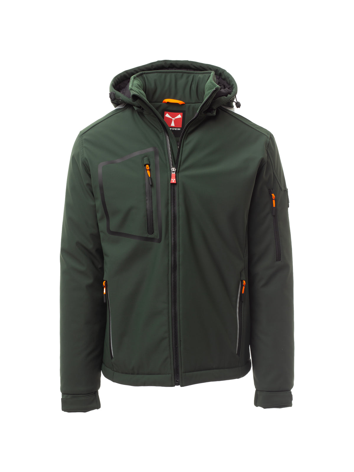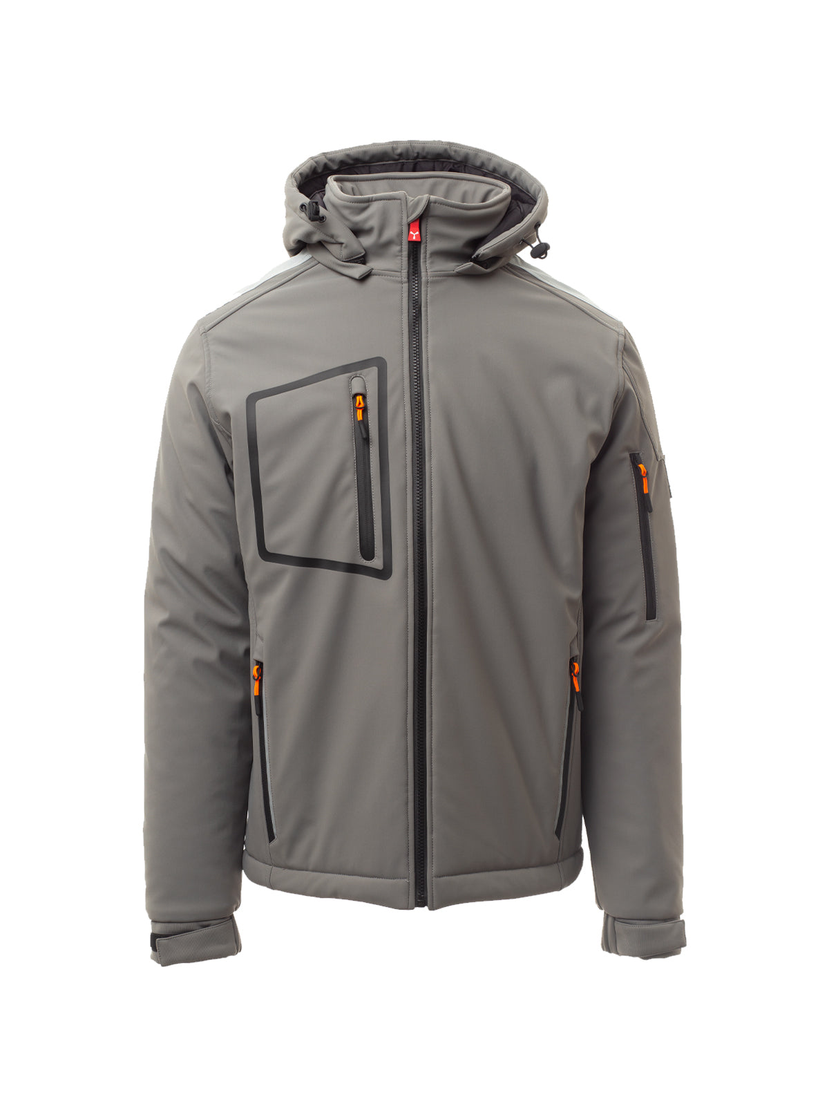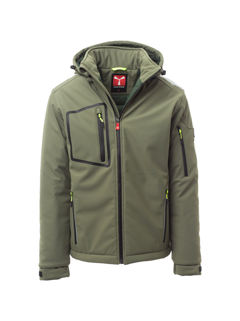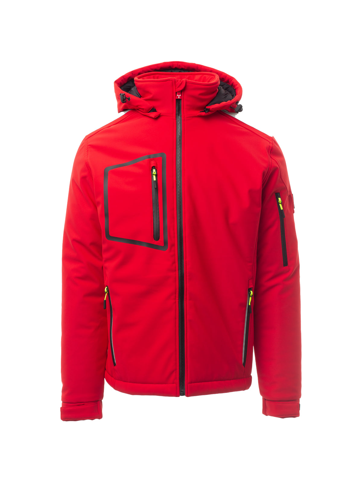 Soft-shell imbottito con chiusura tramite zip SBS con cursore in metallo "semi-auto lock" e tiretto personalizzato. Cappuccio removibile, con coulisse regolabile. Colletto interno con dettagli laterali in pile. Bande retroriflettente su spalle, fondoschiena e retro cappuccio. Polsini elasticizzati, regolabili con velcro e manicotto interno. Tasca termosaldata sul petto, chiusa con zip spalmata. Due tasche laterali, chiuse con zip dal dettaglio retroriflettente. Tasca sul braccio sinistro con porta penne integrato, chiusa con zip. Tiretti fluorescenti. Due tasche interne, una sagomata con zip sul petto destro e una porta tablet chiusa con velcro. Fondo regolabile con stopper personalizzati.