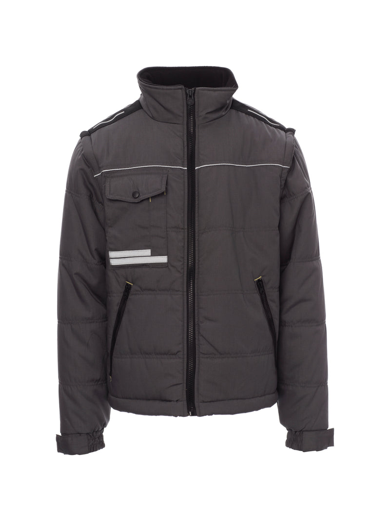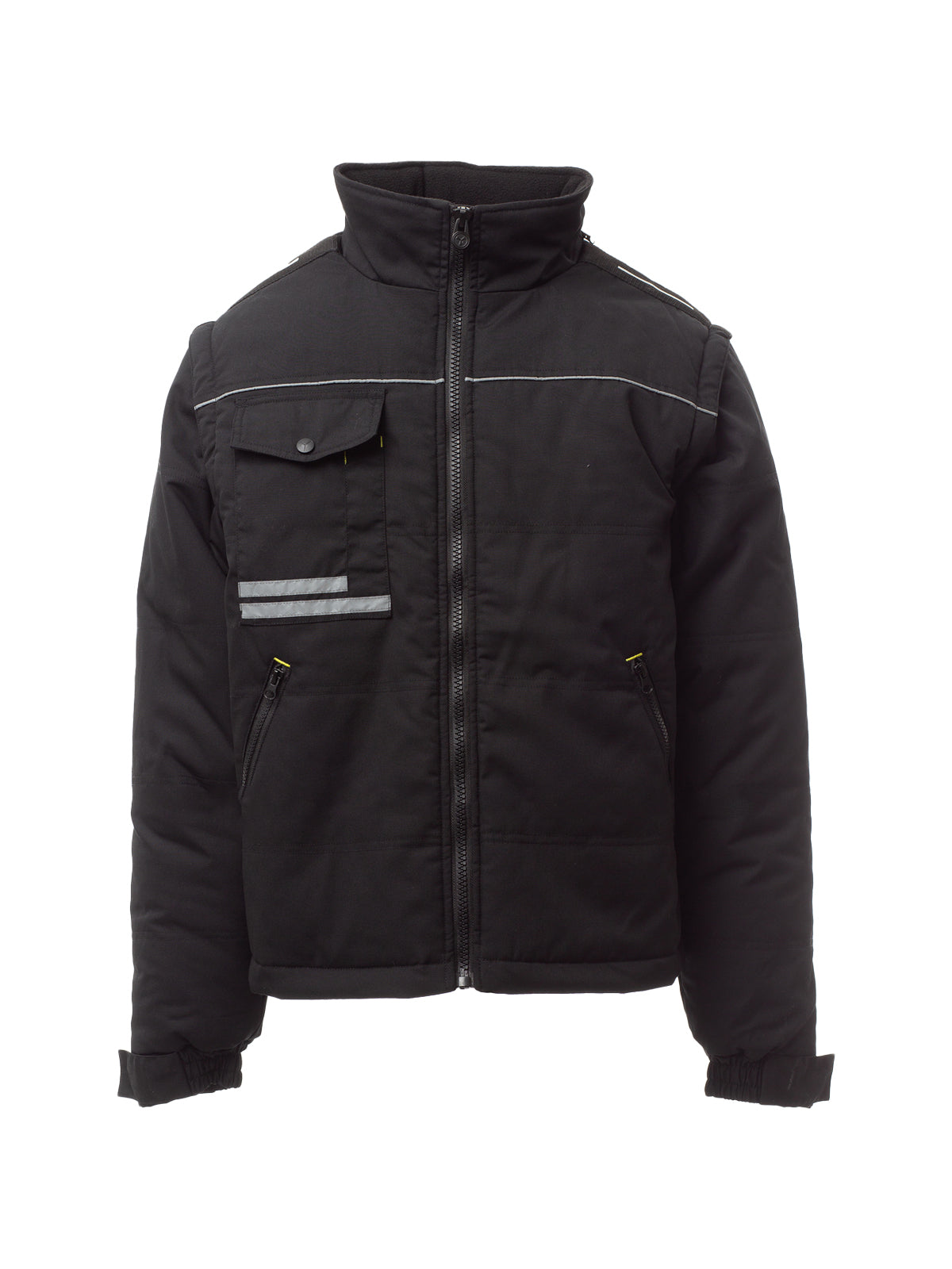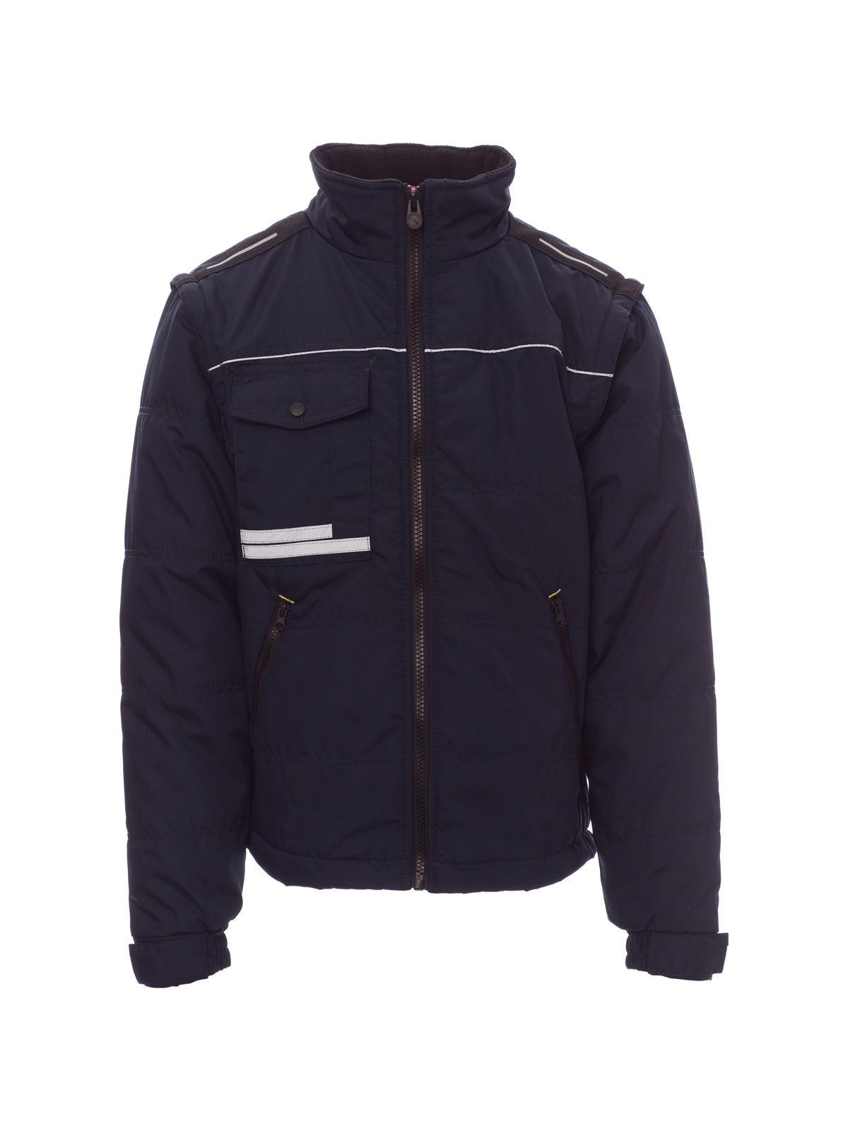 AccediGiubbotto con maniche staccabili, retro sagomato, zip da 8 mm in plastica con cursore in metallo, con cappuccio a scomparsa, due ampie tasche esterne con zip, ampia tasca al petto multifunzione e porta smartphone con bande riflettenti, anello porta badge. Interno: imbottitura trapuntata e rifinito con fodera ad alta densità, interno colletto in pile, una tasca.