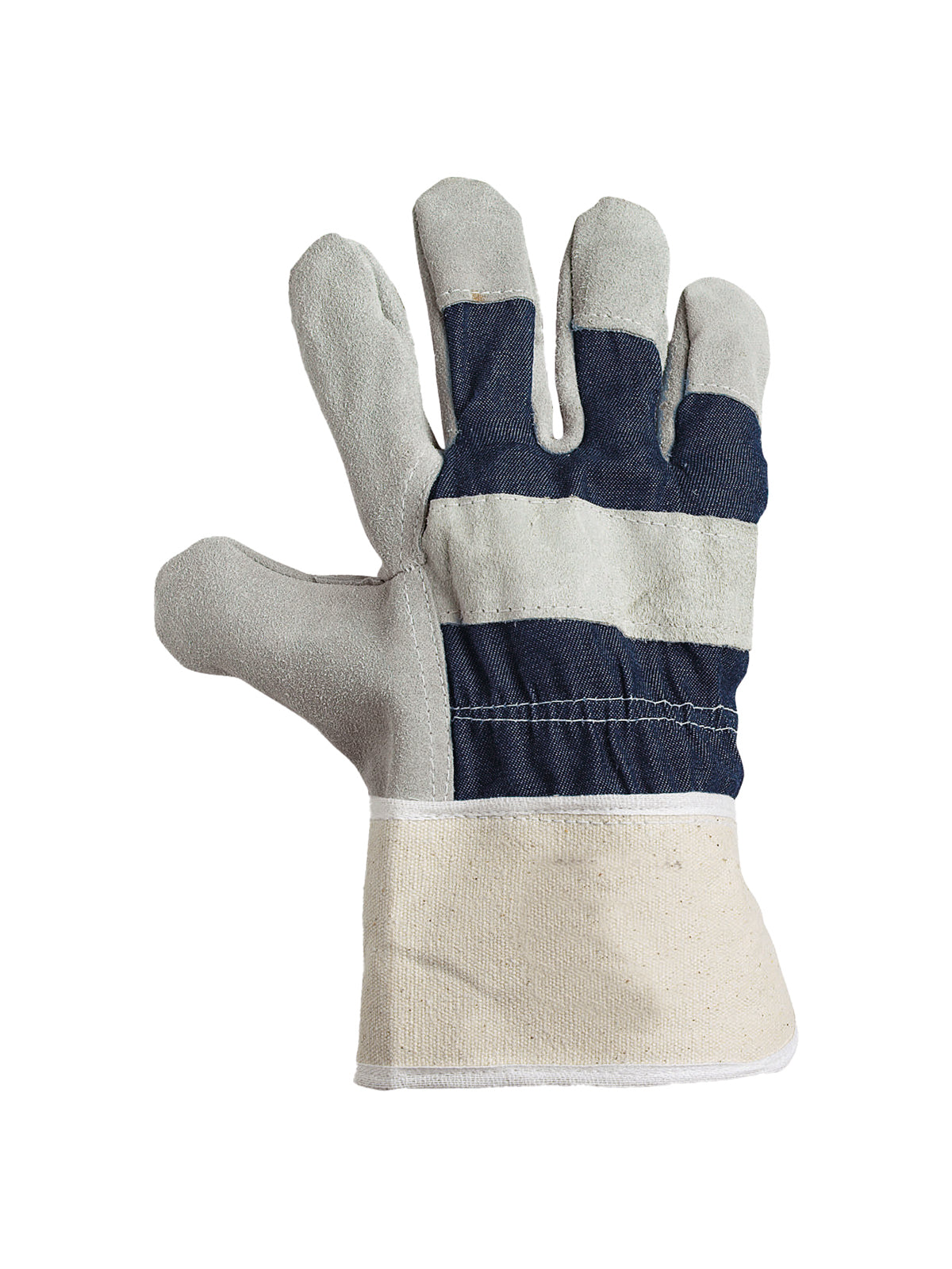 Guanto con palmo in crosta, felpato internamente, dorso jeans con elastico interno, manichetta di sicurezza tela rigida da 7 cm, resistente al taglio, all’abrasione e allo strappo.