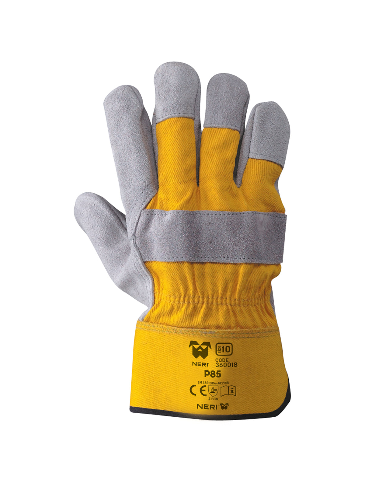 Guanto con rivestimento in crosta su palmo, paranocche e punta delle dita, dorse in tela di cotone. Interamente foderato sul palmo.