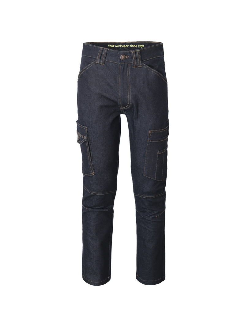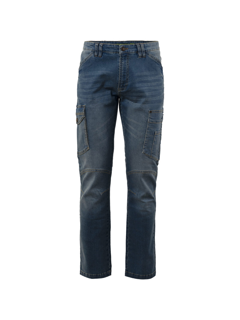 AccediJeans da lavoro multitasche in denim stretch, chiusura alla patta con cerniera e bottone in metallo con finitura effetto rame, doppi passanti in vita.