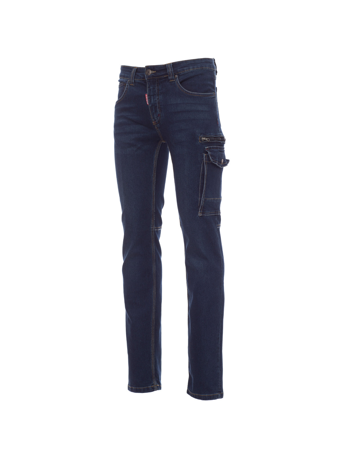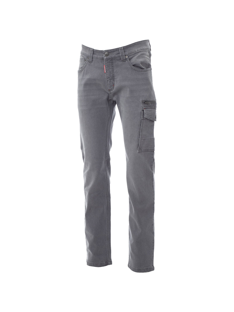 AccediPantalone multitasche uomo, taglio jeans a cinque tasche, chiusura con zip in metallo e bottone, passanti in vita, 1 tascone laterale LOCK SYSTEM con rinforzo interno, 1 tasca con zip, 1 porta metro, 1 porta smartphone, 1 porta martello, 1 taschino porta penne e cutter, trattamento stone wash effetto consumato e délavé. Gamba a tubo, cuciture filo grosso a contrasto ed a triplo ago interno gamba.