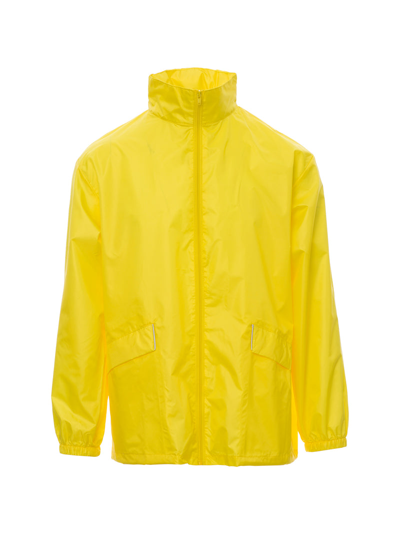 AccediGiacca impermeabile con cappuccio a scomparsa, polsini con elastico, due tasche con velcro, profili e inserto sulla schiena reflex; interno sfoderato, argentato (tranne colore giallo). Confezionato singolarmente in sacchetto richiudibile con stopper coulisse e maniglia laterale.