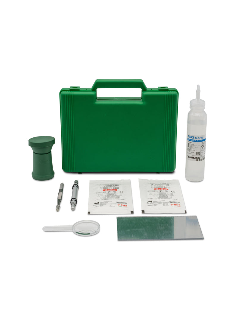 Contiene accessori per estrarre schegge di varia natura e per effettuare una prima medicazione della parte lesa.