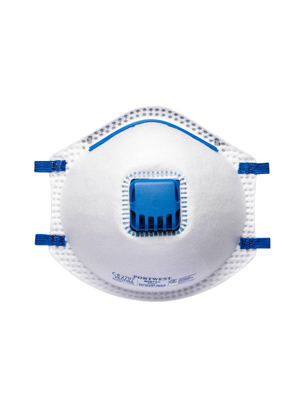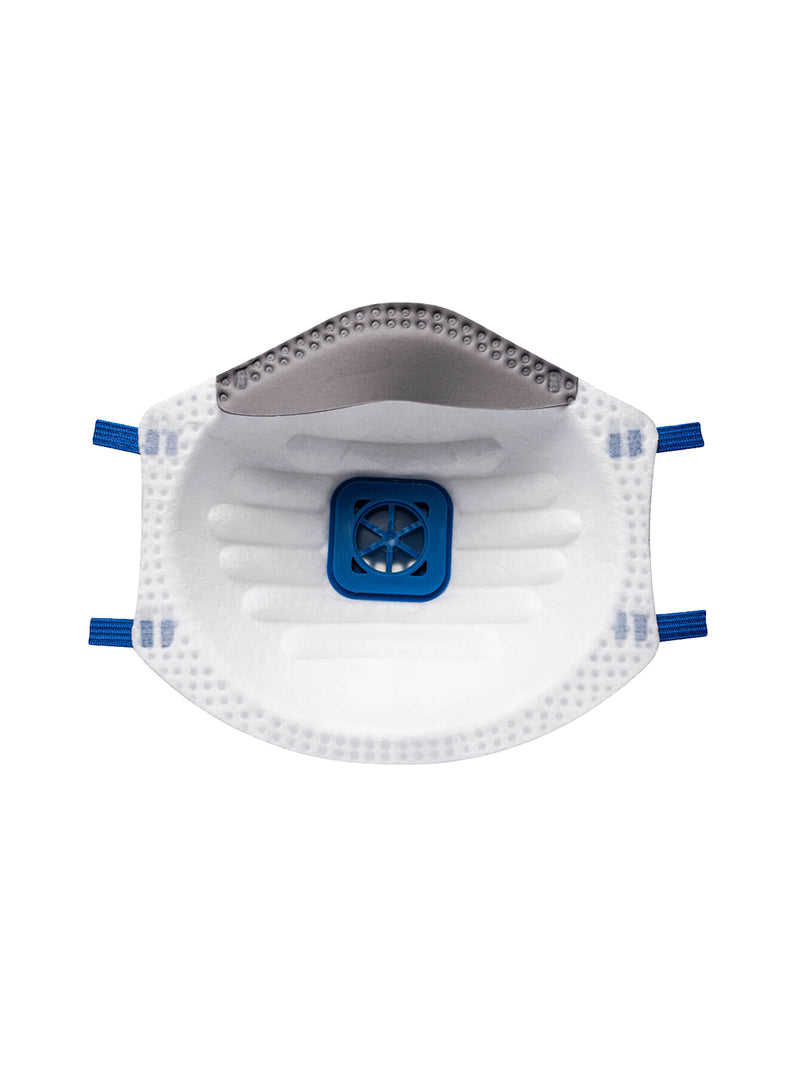 Respiratore a coppa con valvola di espirazione, progettato per proteggere contro polveri sottili e tossiche, fumi e nebbie a base d'acqua, con concentrazioni di contaminanti fino a 10 volte la WEL. Le cinghie saldate ad ultrasuoni e il ponte nasale regolabile assicurano una vestibilità ottimale, riducendo l'appannamento degli occhiali. L'imbottitura in schiuma EVA garantisce comfort, mentre la valvola di espirazione ad alte prestazioni riduce il calore e migliora il comfort in ambienti umidi. Certificato CE-CAT III, venduto in scatola per presentazione in negozio. Materiali: polipropilene e schiuma EVA.
