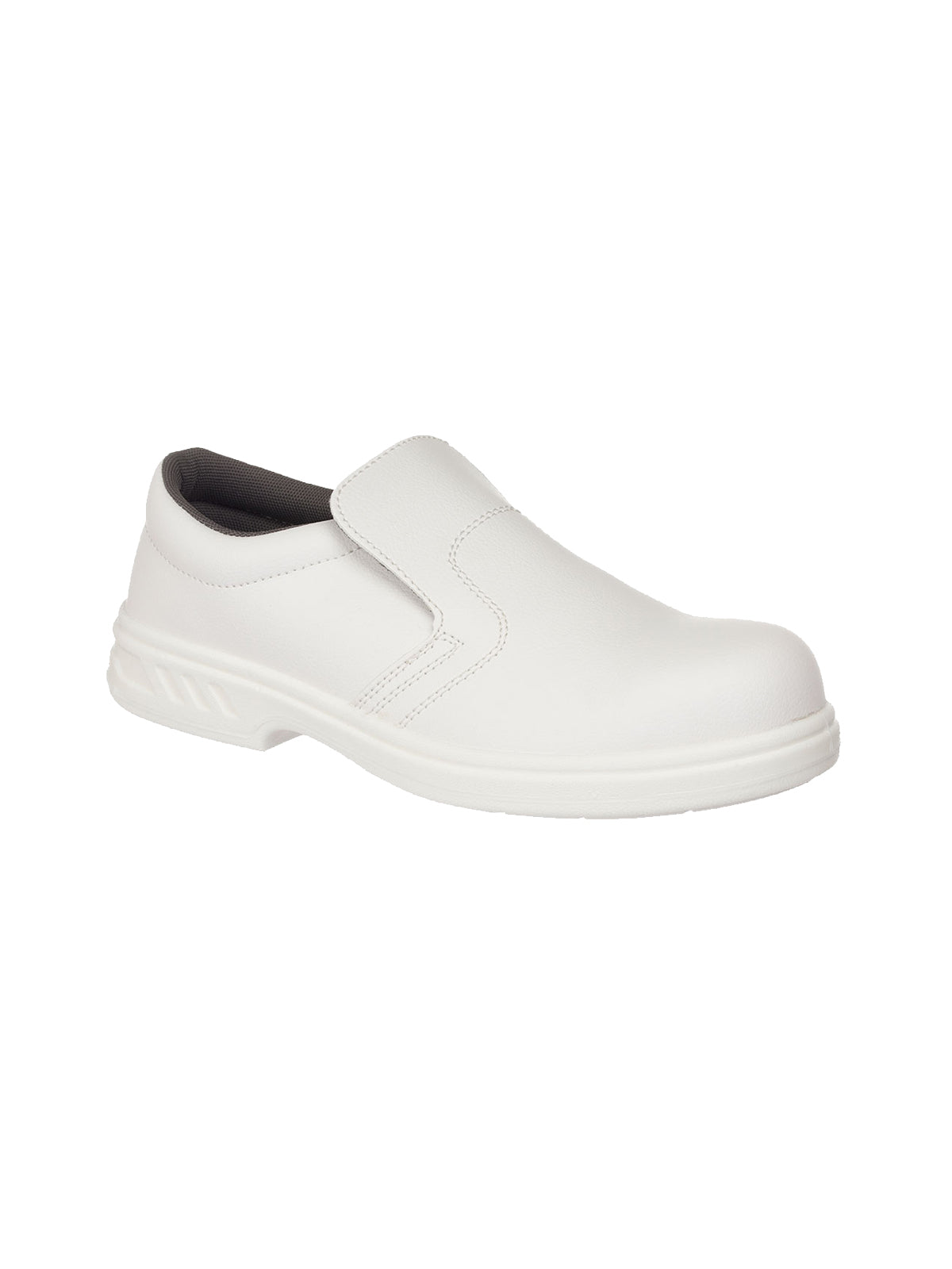 Scarpa slip-on ideale per ambienti medici e alimentari, con tomaia in microfibra facile da pulire e resistente all'acqua. Puntale in acciaio e suola auto-pulente per prevenire contaminazioni. La suola mono-densità offre resistenza allo scivolamento (ceramica e glicerina), a carburanti e oli. Colletto imbottito per maggiore comfort e tallone con assorbimento d'energia. Calzatura antistatica, lavabile in lavatrice a 30°C, adatta ai vegani e certificata CE. Disponibile in taglie unisex.