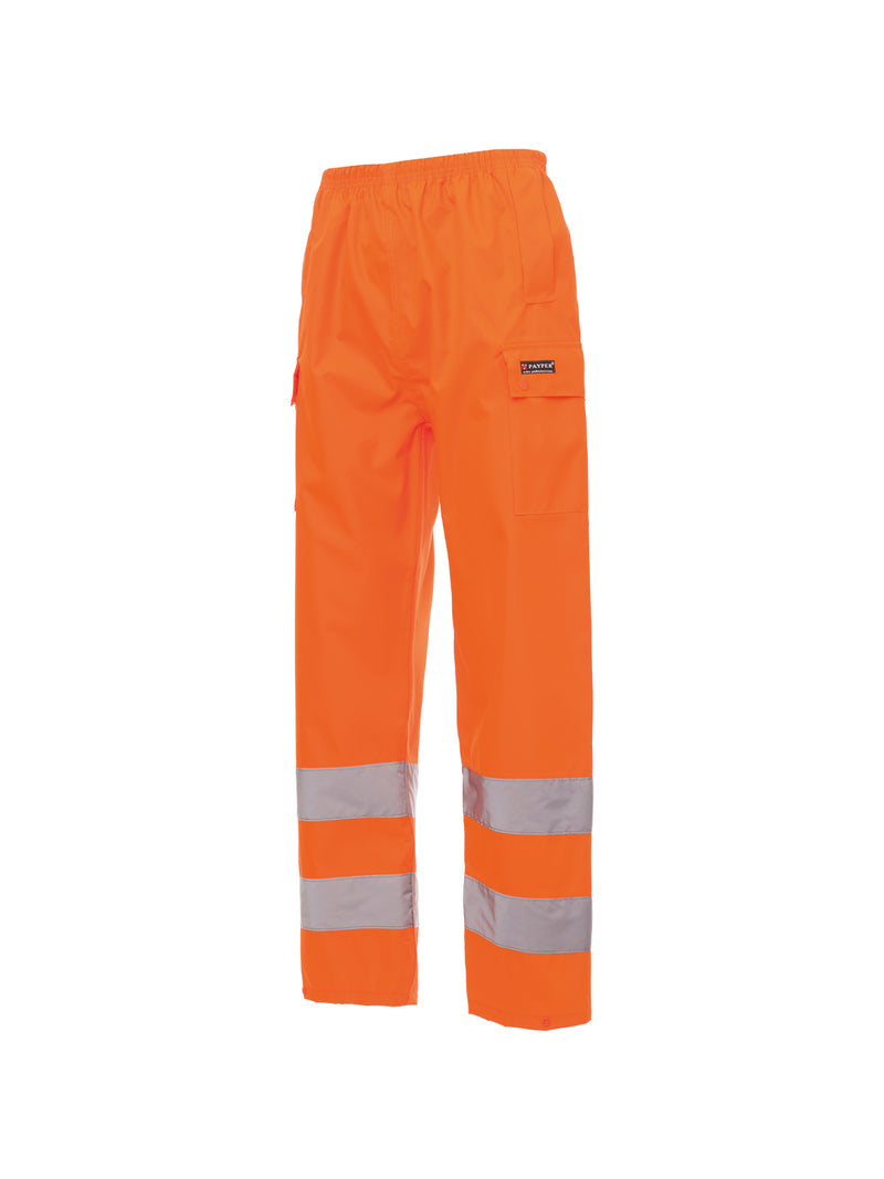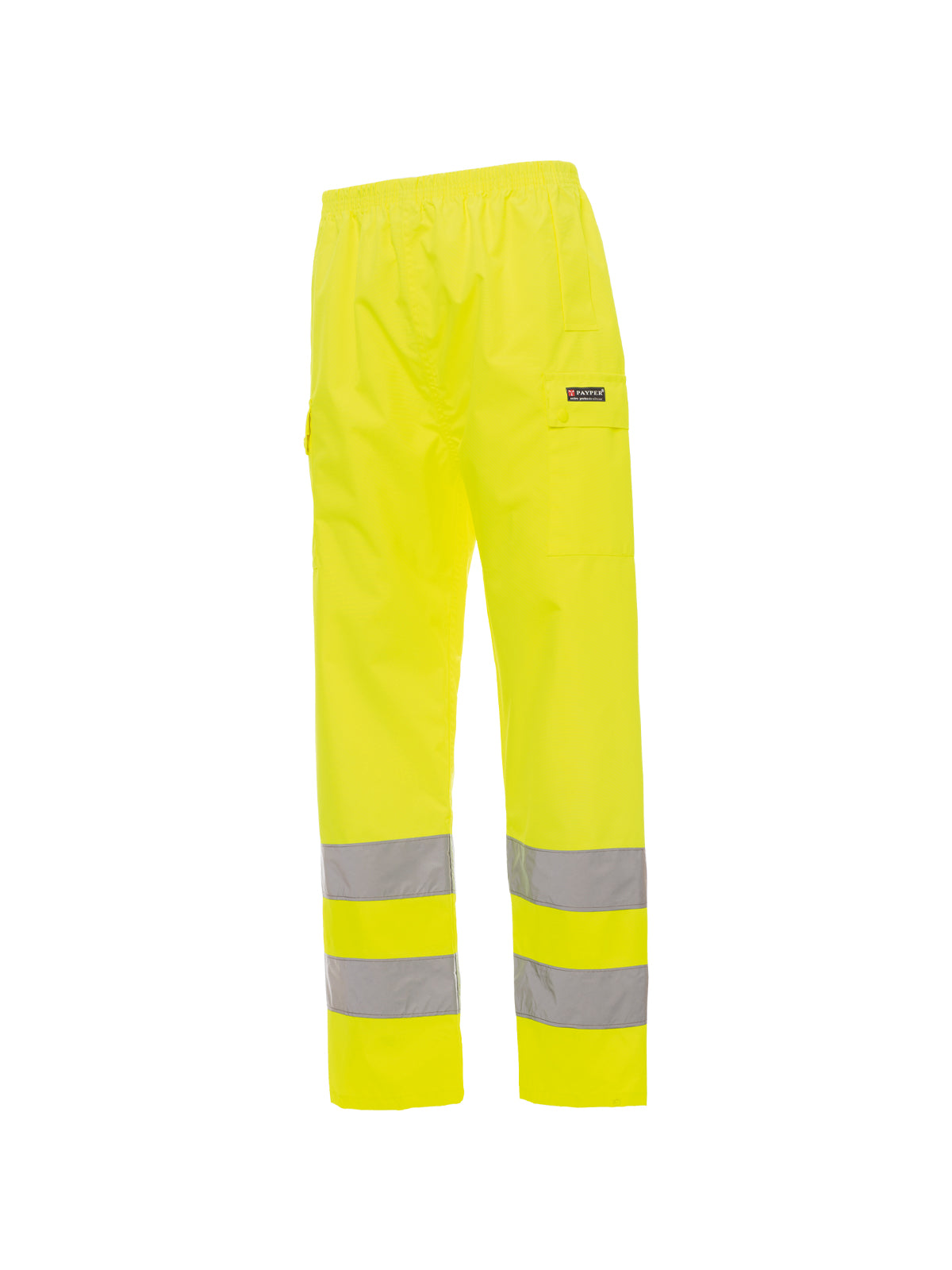 AccediPantalone, con spalmatura in PU, antipioggia in alta visibilità con banda 3M, elastico in vita, due tasche laterali a busta con bottoni, fonda gamba regolabile con bottone automatico, cuciture termosaldate.