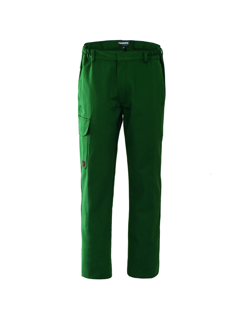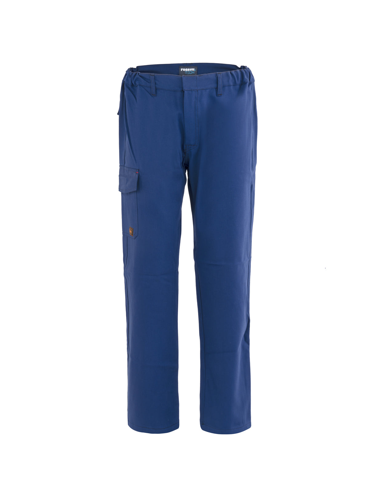 AccediPantalone da lavoro con chiusura alla patta con zip, bottone automatico nascosto in cintura, passanti in vita ed elastico ai fianchi.