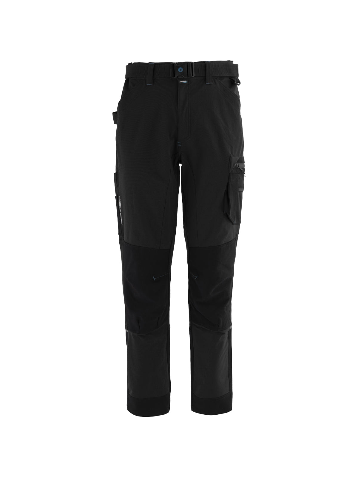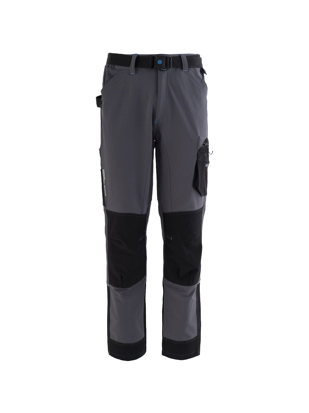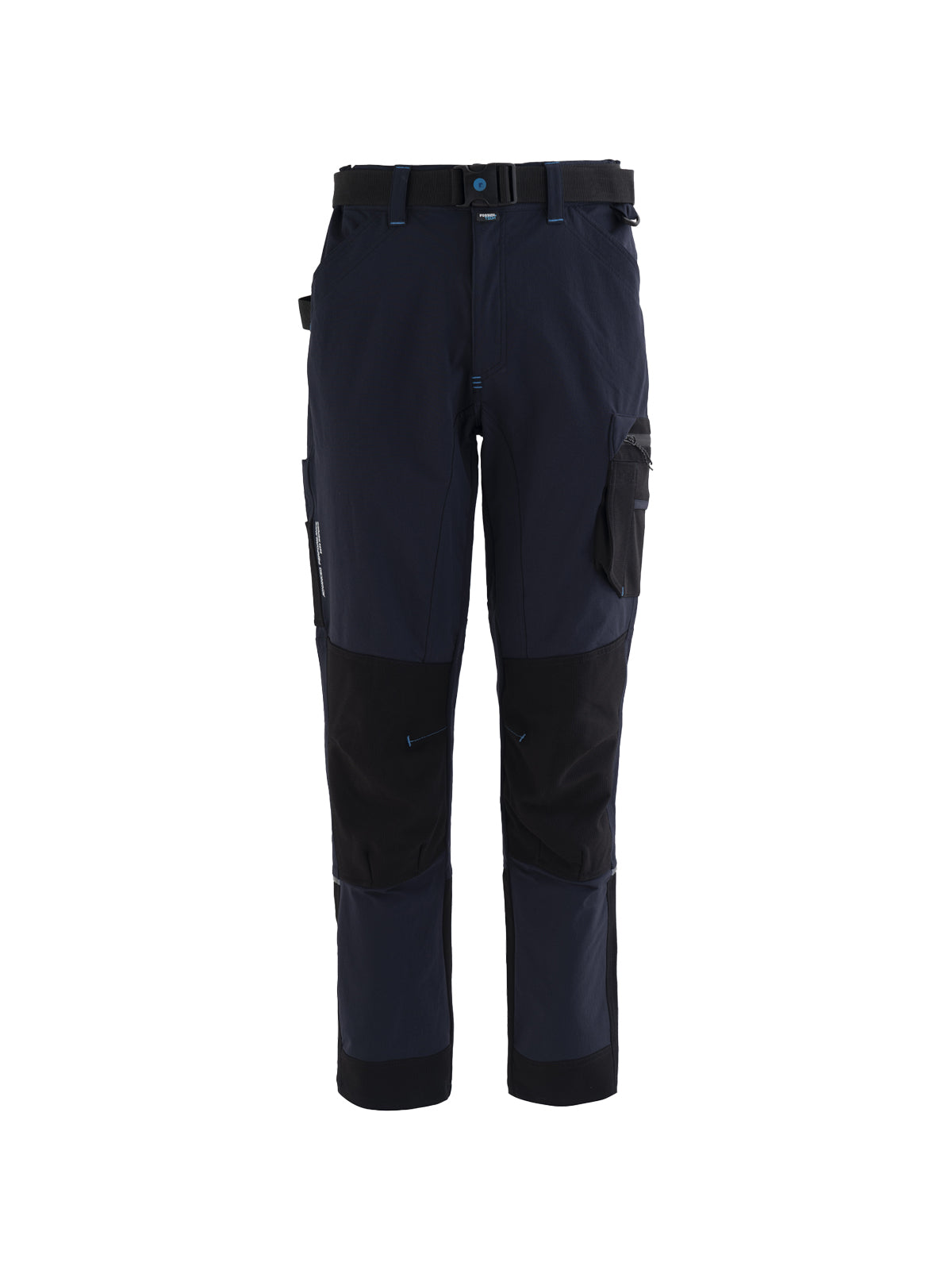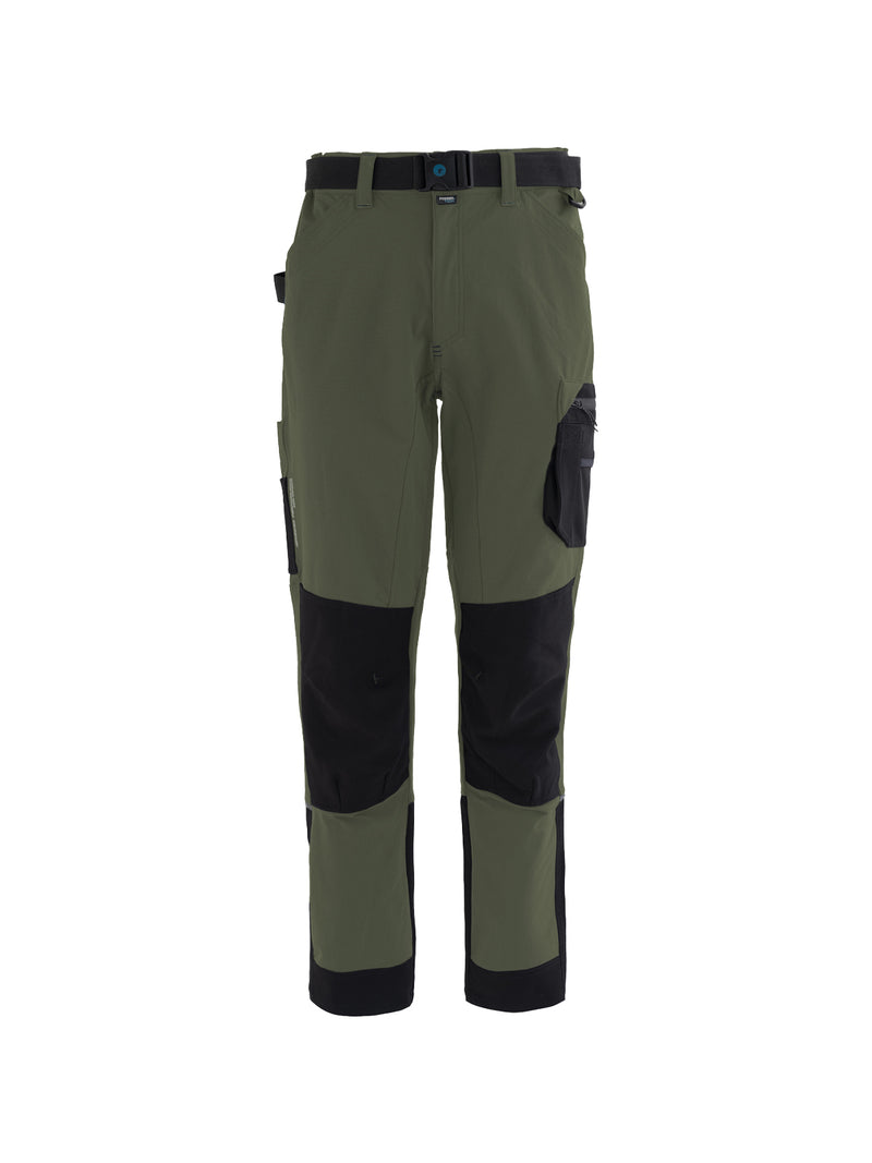 Tessuto Ripstop sul fondo gamba con profilo rifrangente orizzontale inserito nella cucitura. Cavallo con doppio tessuto e tripla cucitura. Rinforzi di tessuto Ripstop di colore a contrasto sulle ginocchia. Travette a contrasto, pences alle ginocchia per maggior comfort.