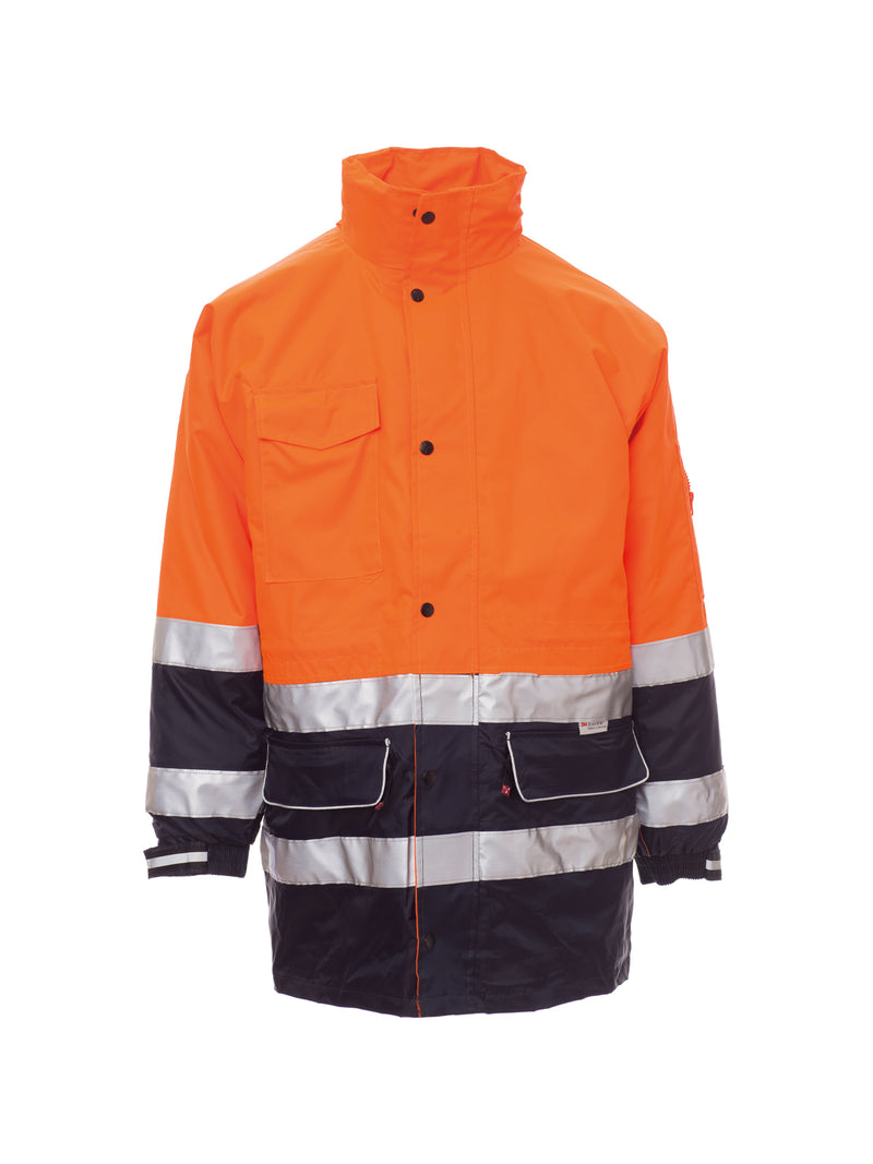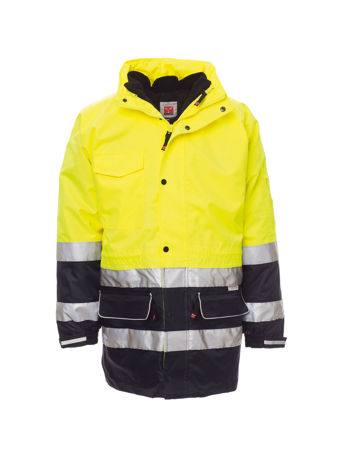 AccediParka, con spalmatura in PU, quattro usi in alta visibilità con bande 3M, composto da: giacca esterna non imbottita, zip in plastica con cursore in metallo coperta da patta e bottoni, cappuccio sagomato e coulisse richiudibile nel colletto, polsini regolabili elasticizzati, due ampie tasche frontali con cerniera e patta, portacellulare, cuciture termonastrate. Giubbotto interno imbottito con maniche staccabili, zip in plastica con cursore in metallo, polsino elasticizzato, due tasche frontali con zip, porta badge, colletto in micropile, zip interna.