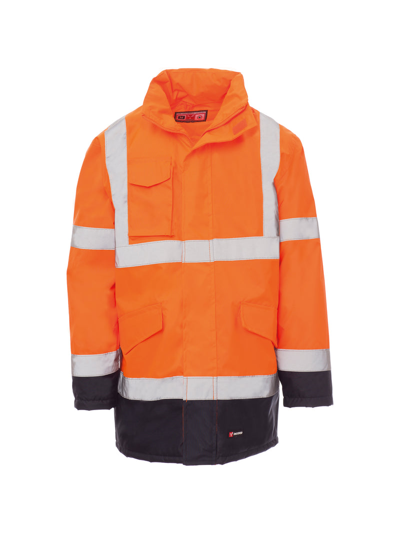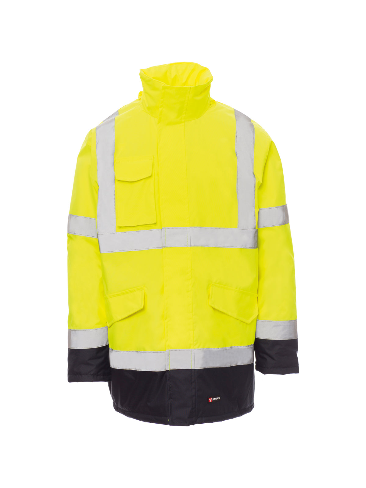 AccediParka fisso in poliestere spalmato bicolore in alta visibilità con bande riflettenti, zip intera con patta, cappuccio richiudibile nel colletto, polsini in RIB elasticizzato, due tasche frontalicon patta, un portacellulare e anello di aggancio per porta badge. Interno: imbottito, una tasca interna con velcro, cuciture termonastrate.